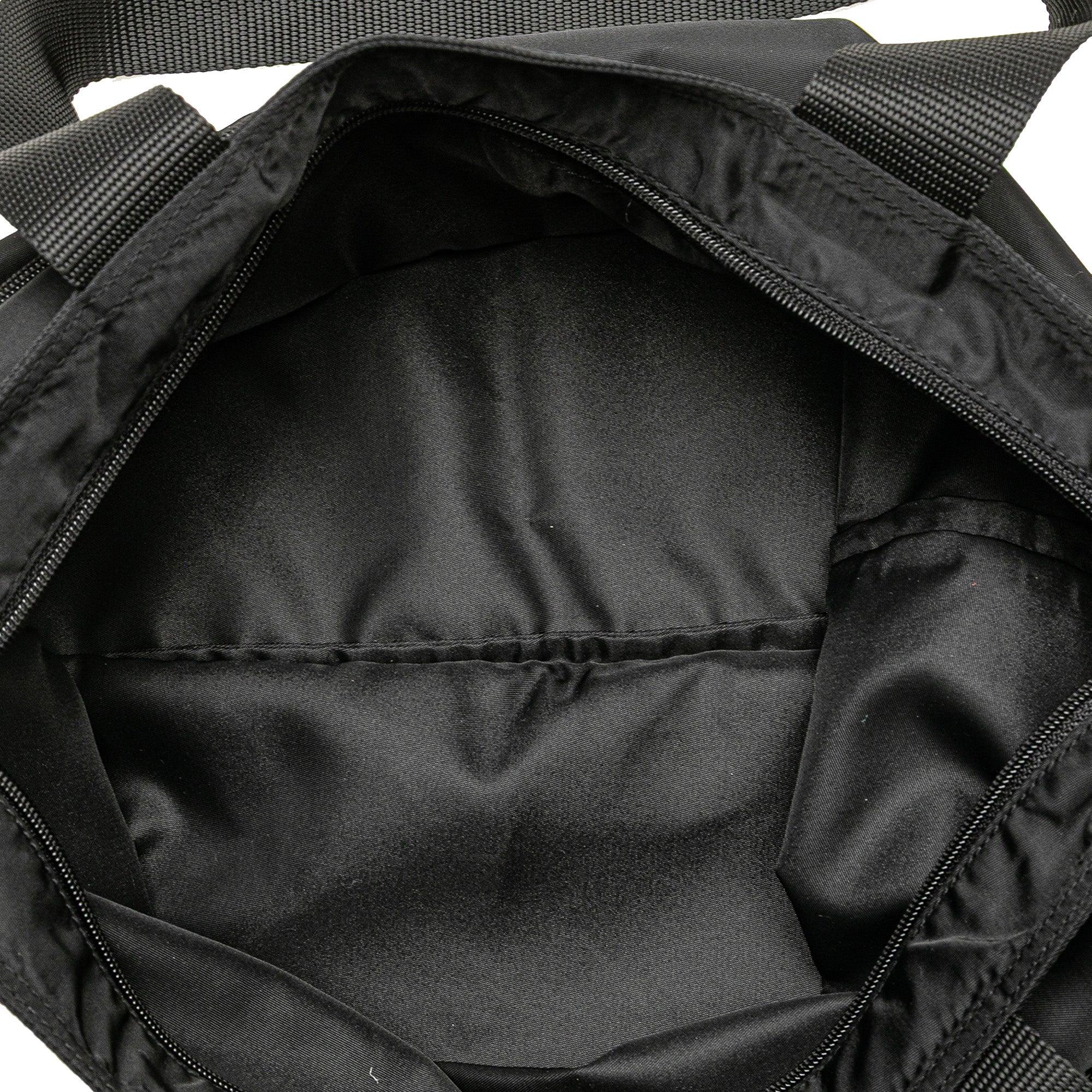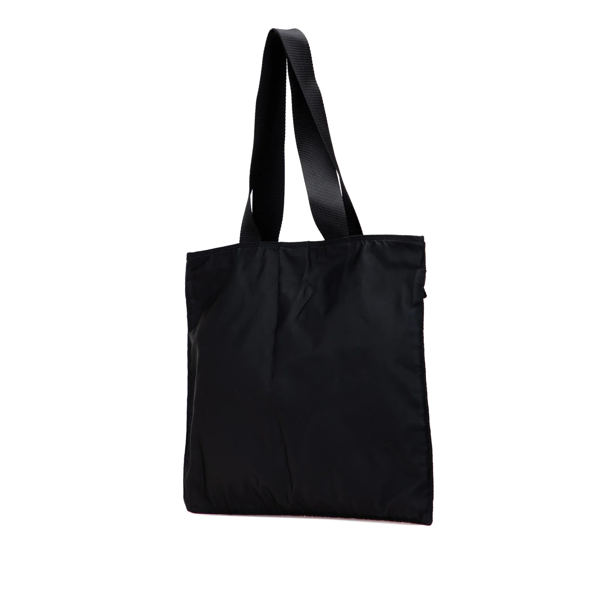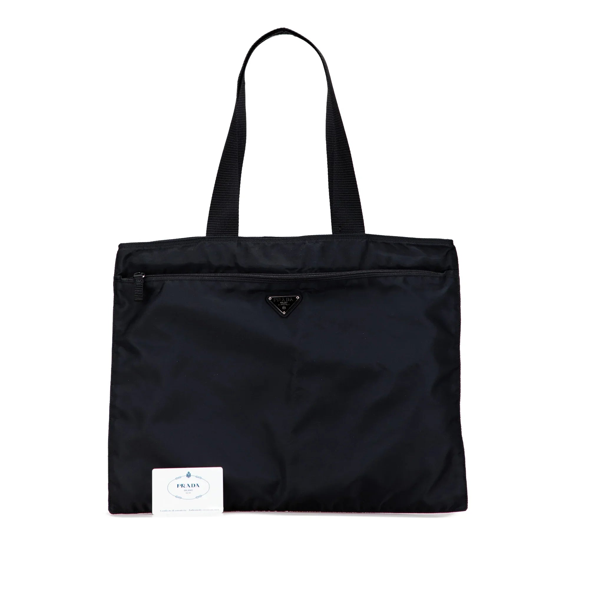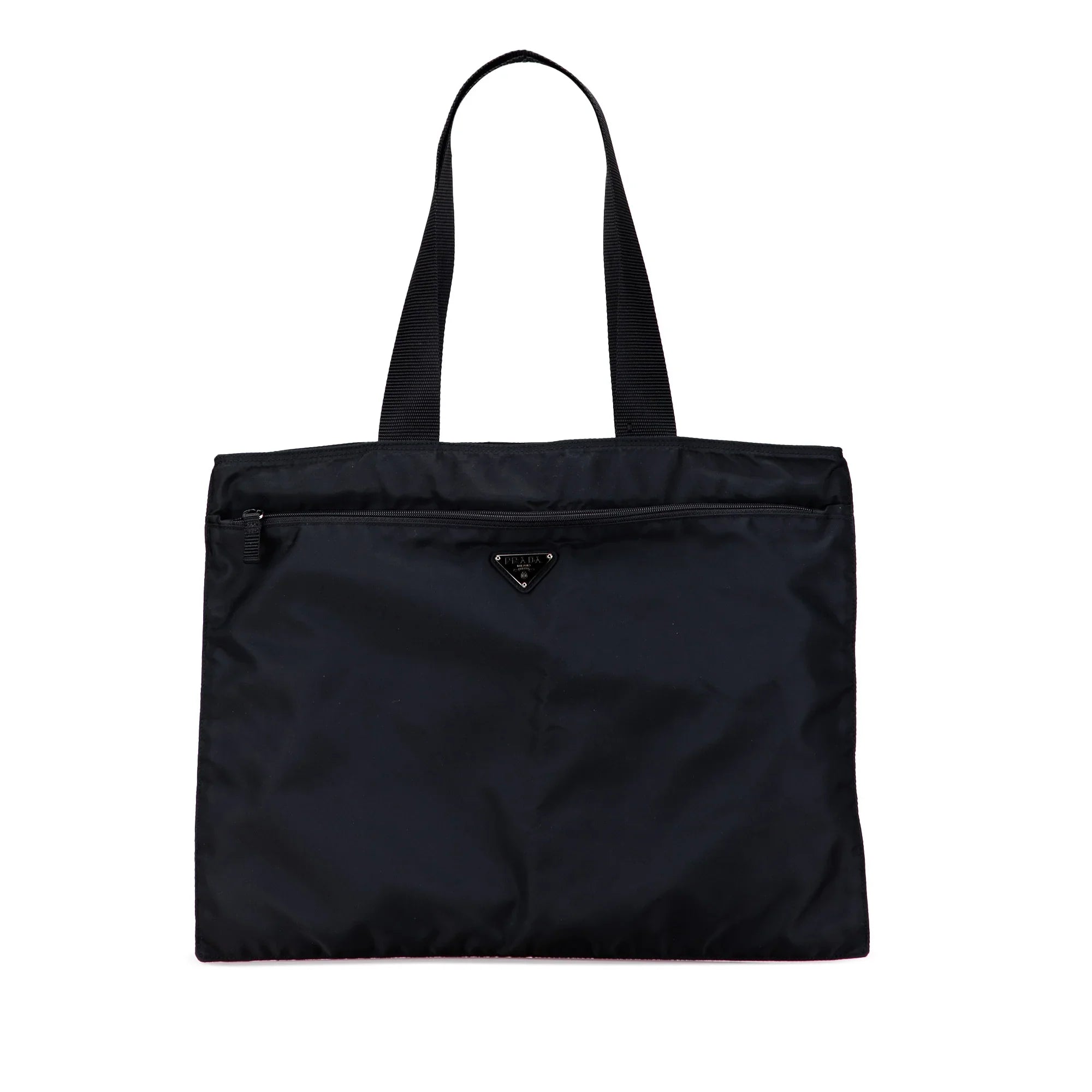 Product Details: Black Prada Tessuto Tote. This tote features a nylon body, flat shoulder straps, a top zip closure, an exterior front zip pocket, and an interior zip pocket. 13.8" L x 16.5" W x 0.6" D.
