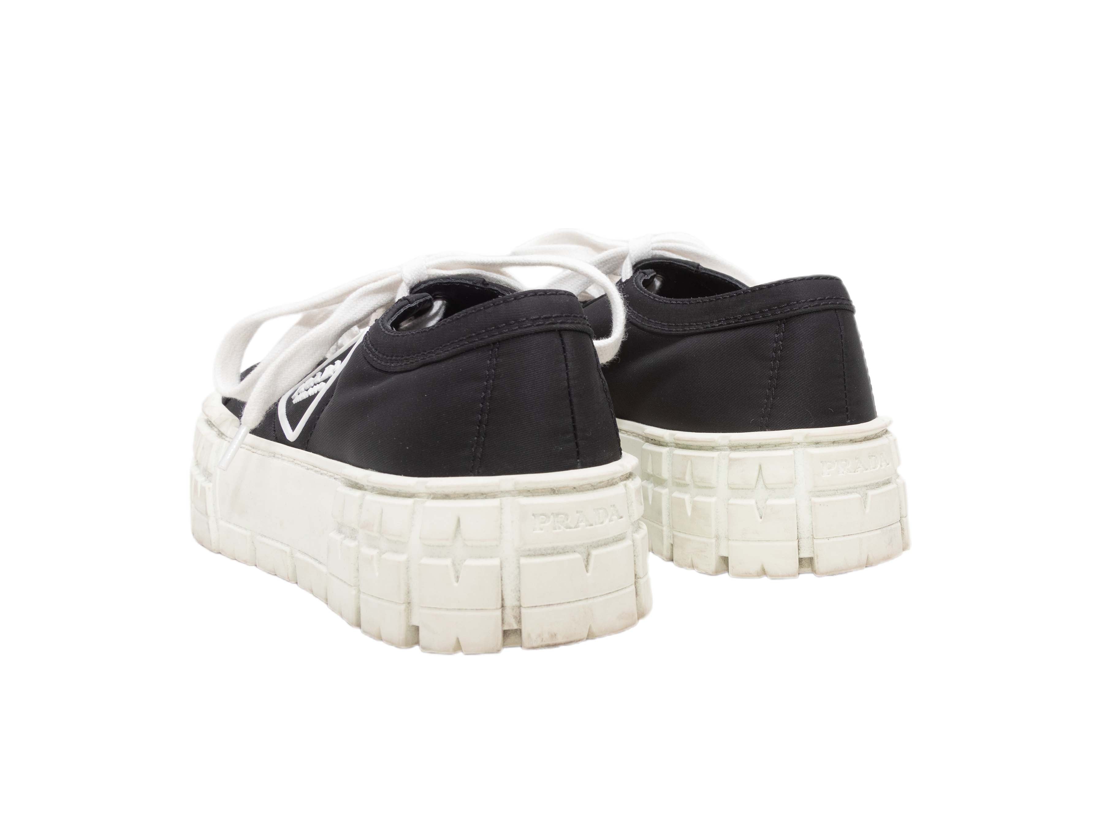 Product Details: Black tessuto Re-Nylon low-top chunky sneakers by Prada. Lug soles. Lace-up tie closures at tops. 2" platform height, 2" heel height.