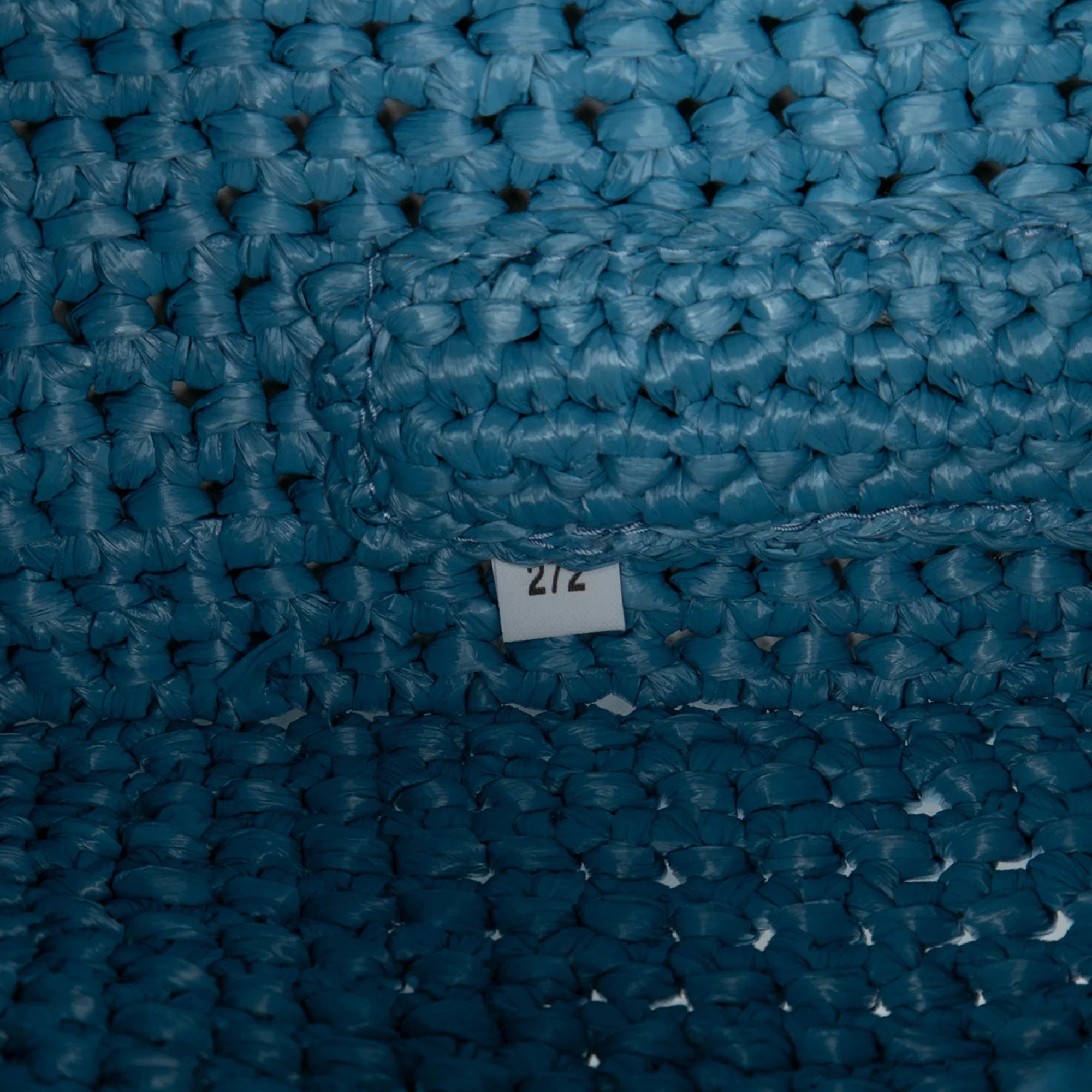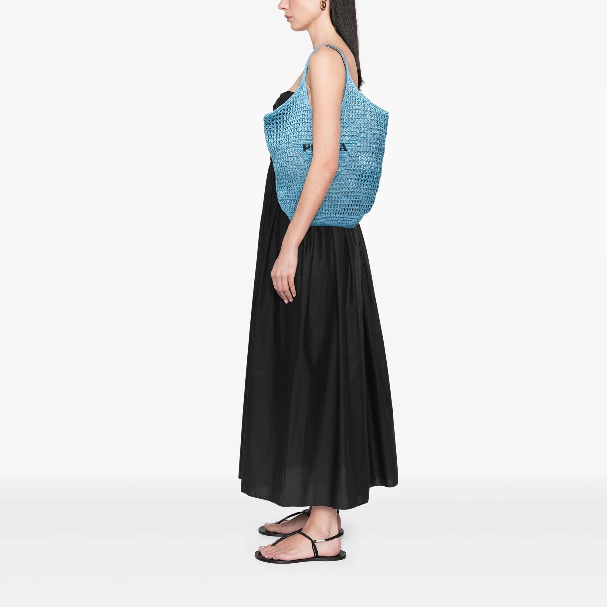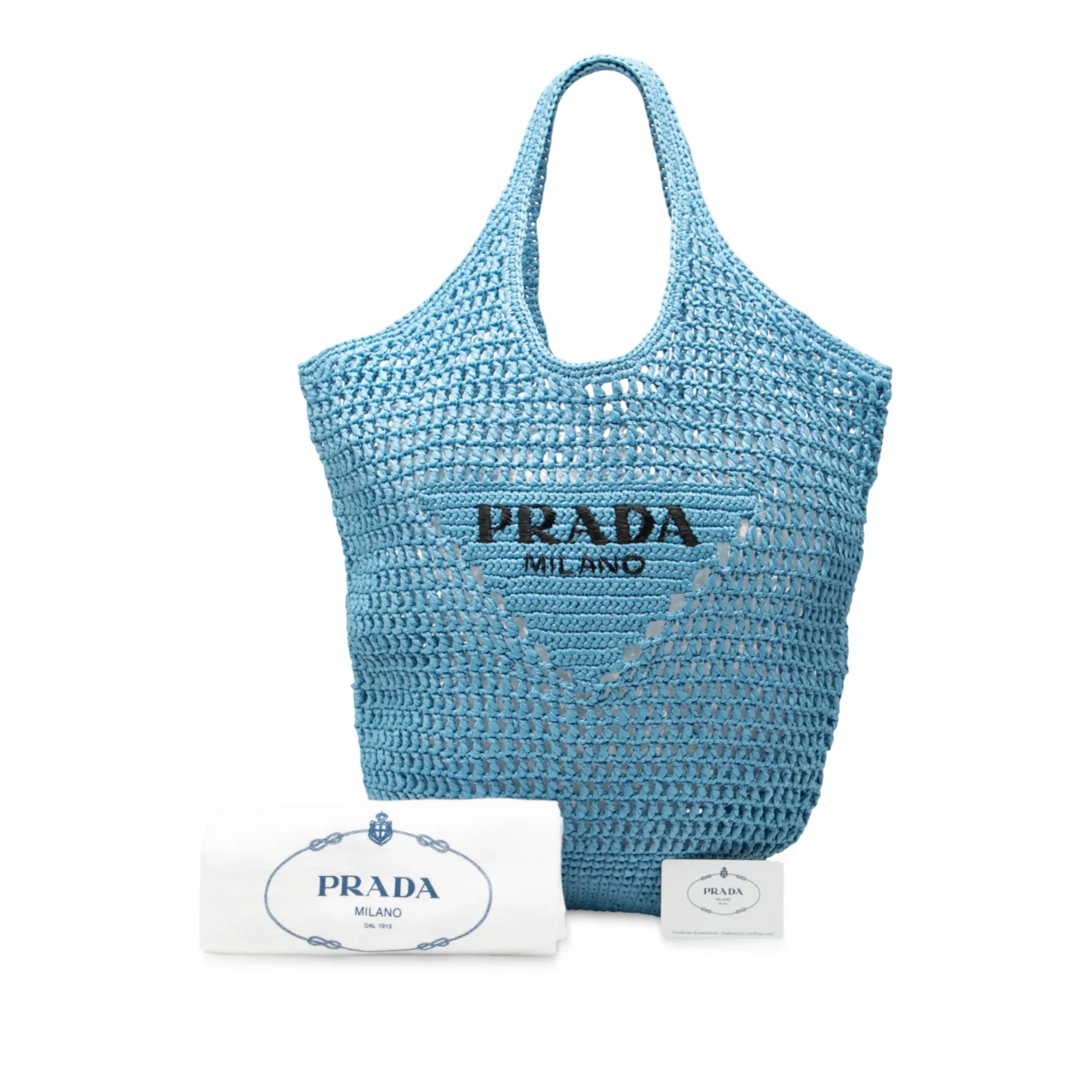 Blue Prada Raffia Effect Crochet Logo Embroidered Shopping Tote