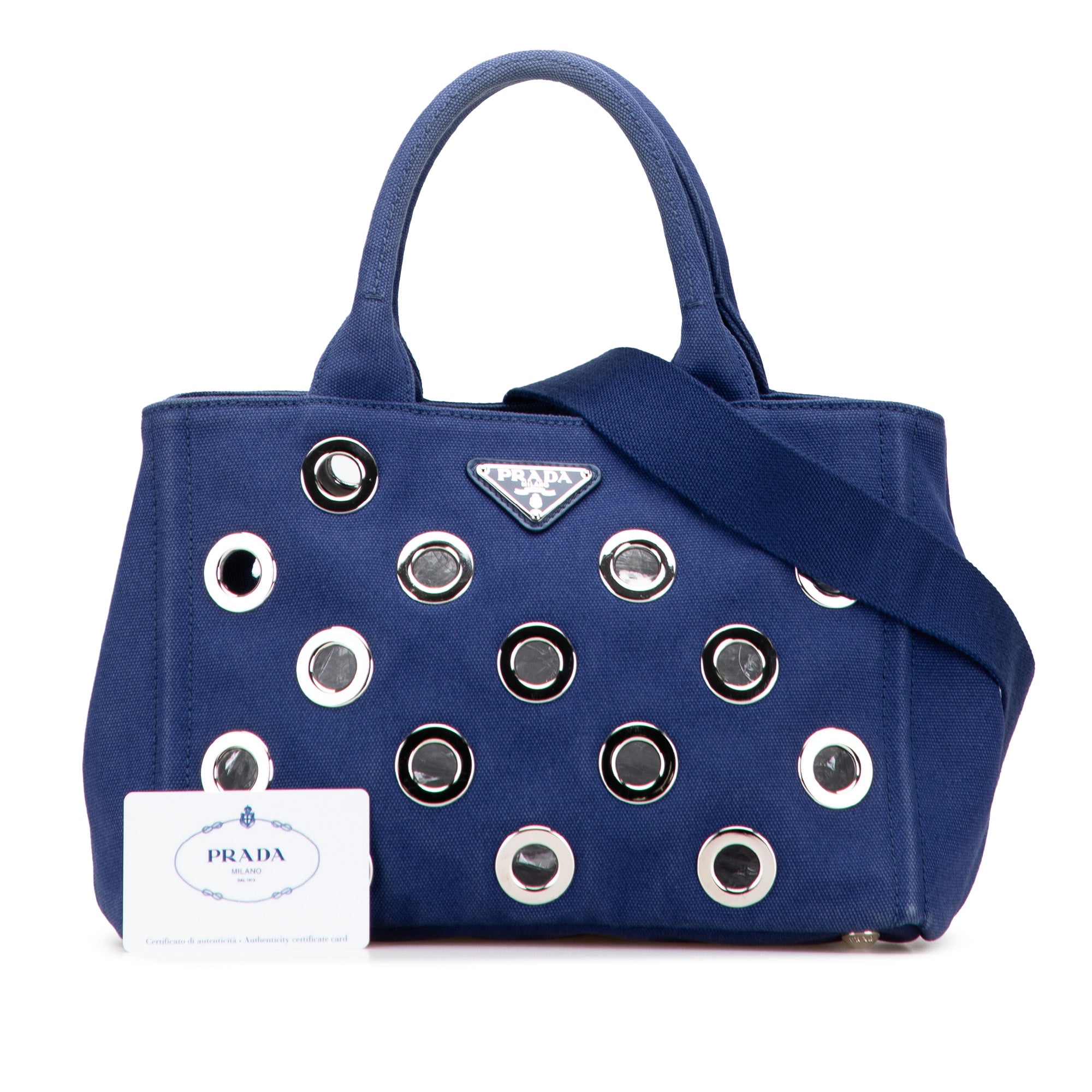 Please note this is a pre-owned item that may display signs of wear consistent with the condition listed above and shown in photos. Designer Revival guarantees this is an authentic Blue Prada Small Canvas Canapa Grommet Satchel or 100% of your money back. Learn more about our authentication process.