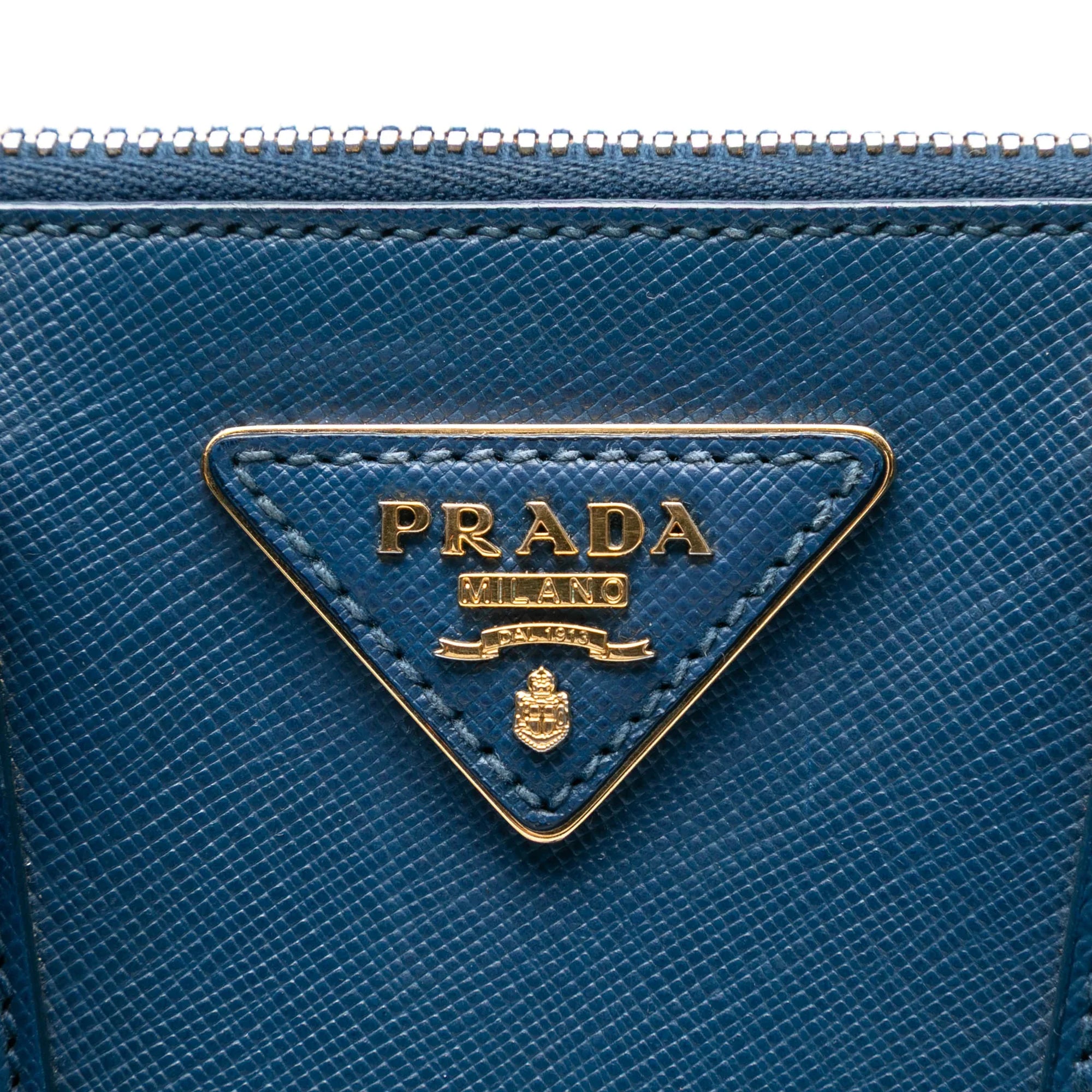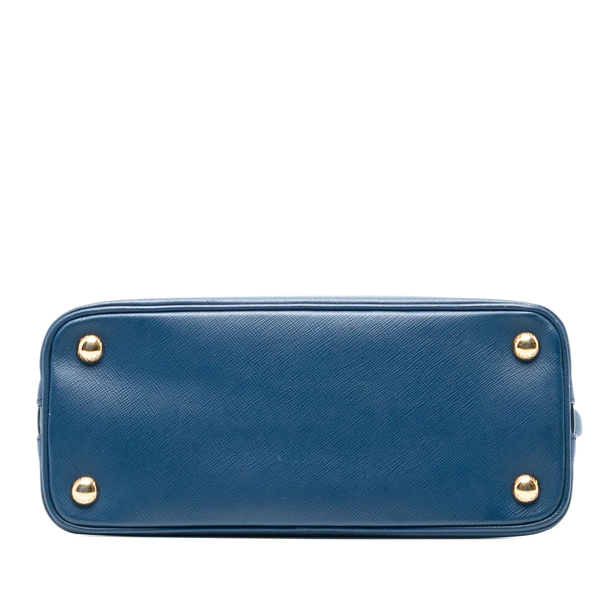 Product Details: Blue Prada Small Saffiano Lux Promenade Satchel. The Promenade Satchel features a saffiano lux leather body, rolled leather handles, a top zip around closure, an interior zip compartment, and interior zip and slip pockets. Exterior back has been repainted. 6.9" L x 10" W x 4.3" D, 3.1" drop.