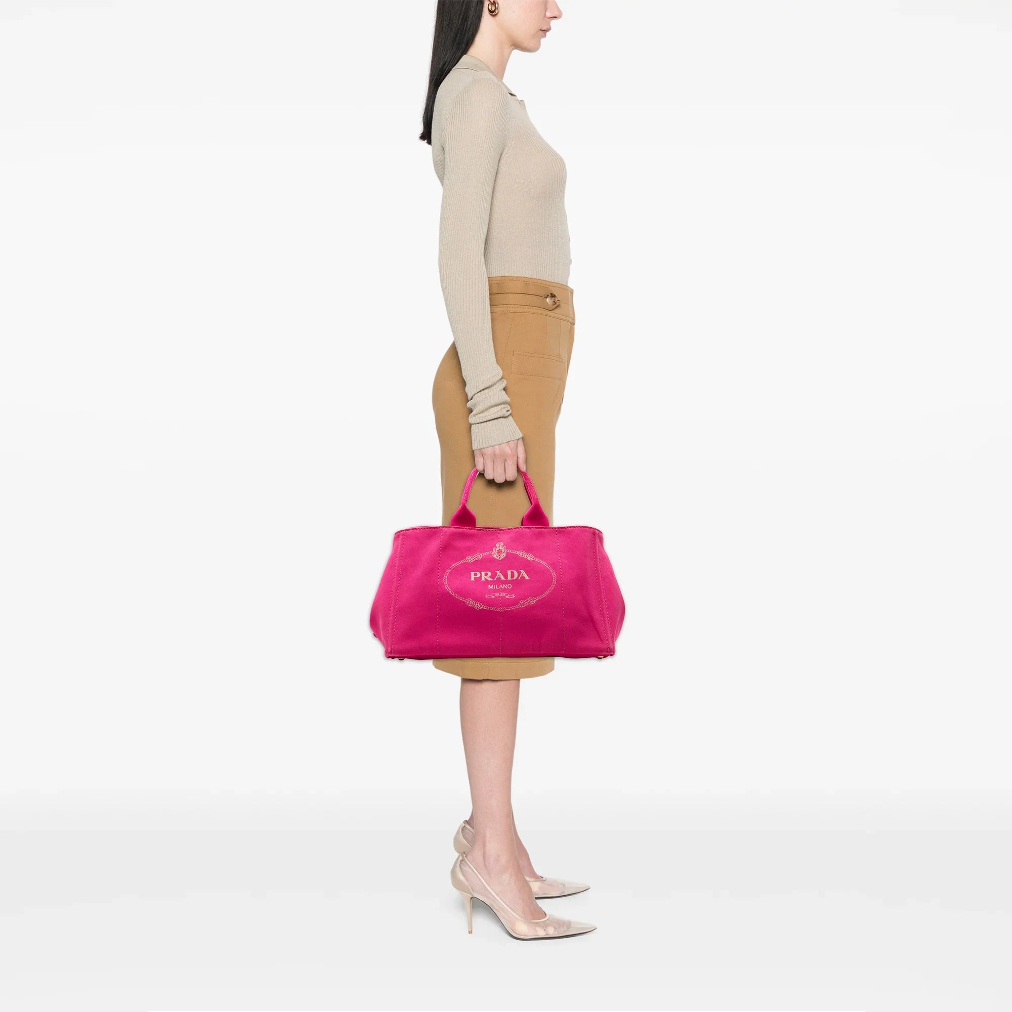 Product Details: Pink Prada Large Canvas Canapa Logo Satchel. This satchel bag features a canvas body, rolled top handles, an open top, and interior zip and slip pockets. 9.4" L x 15.7" W x 10.2" D, 5.9" drop.