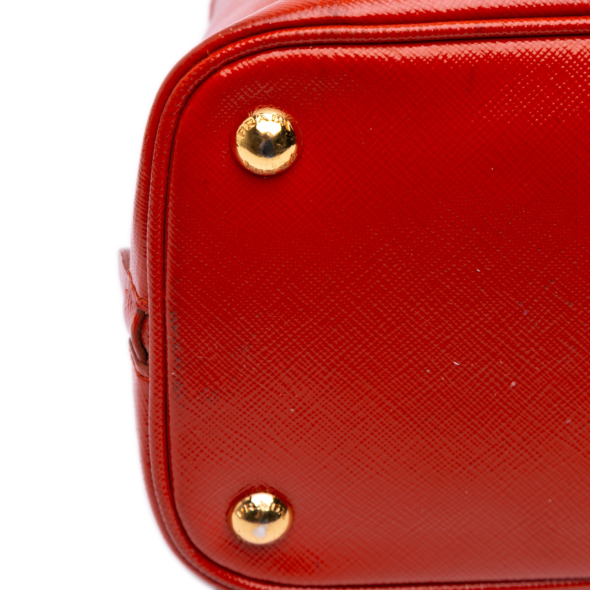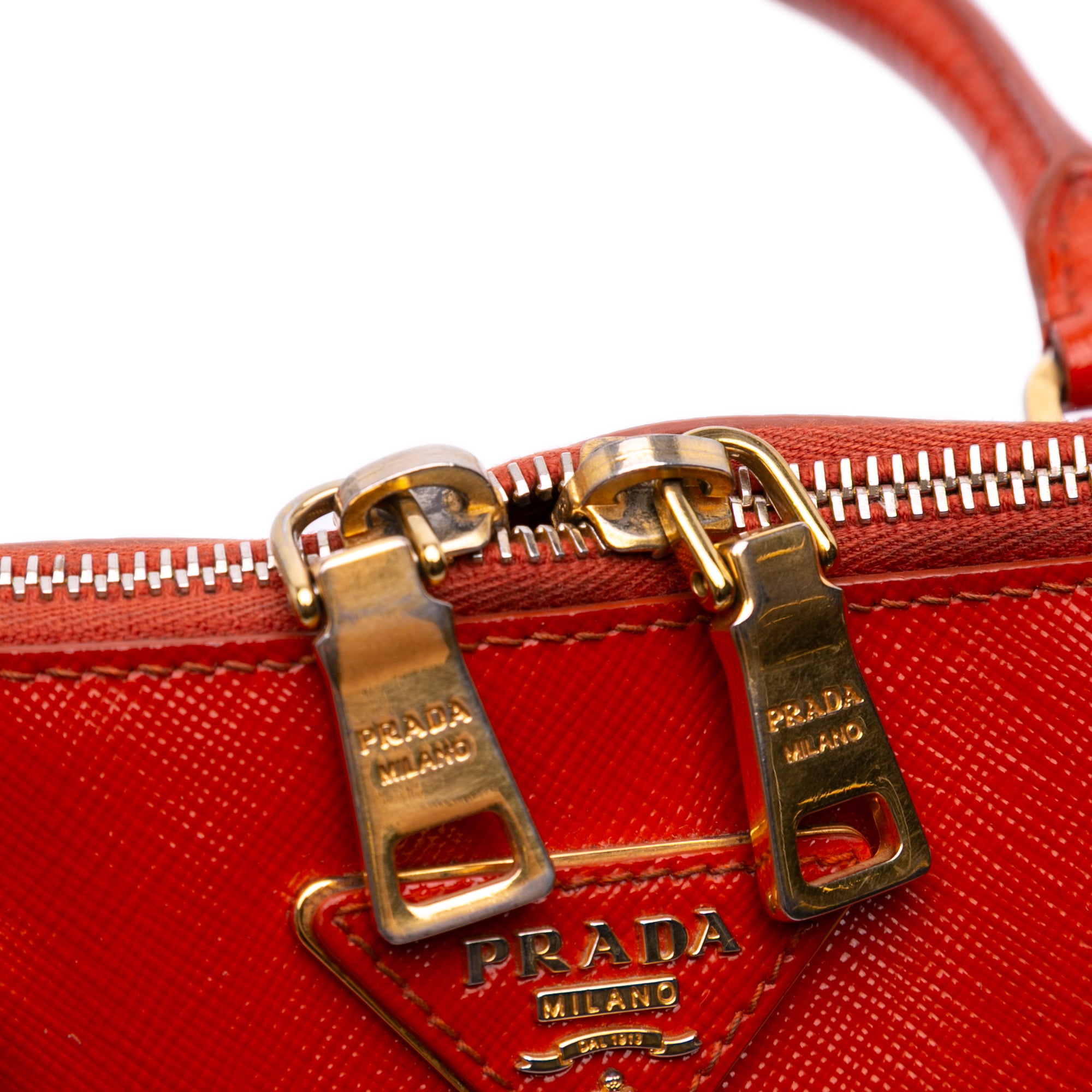 Product Details: Orange Prada Medium Saffiano Vernice Promenade Satchel. The Promenade satchel features a saffiano leather body, rolled leather handles, a detachable flat leather strap, double zip around closure, an interior center zip compartment, and interior zip and slip pockets. 8.3" L x 13" W x 5.3" D, 4.7" drop.