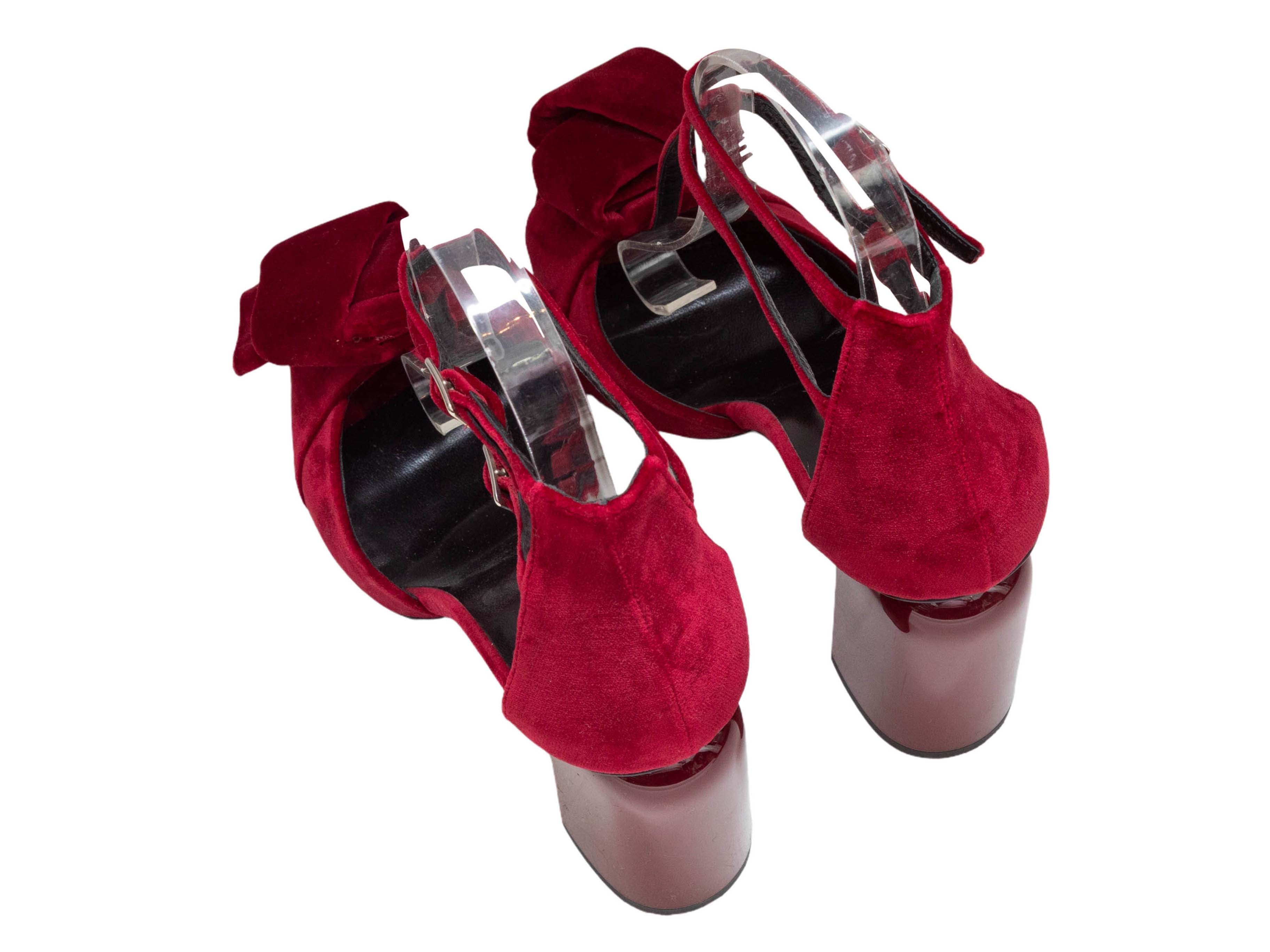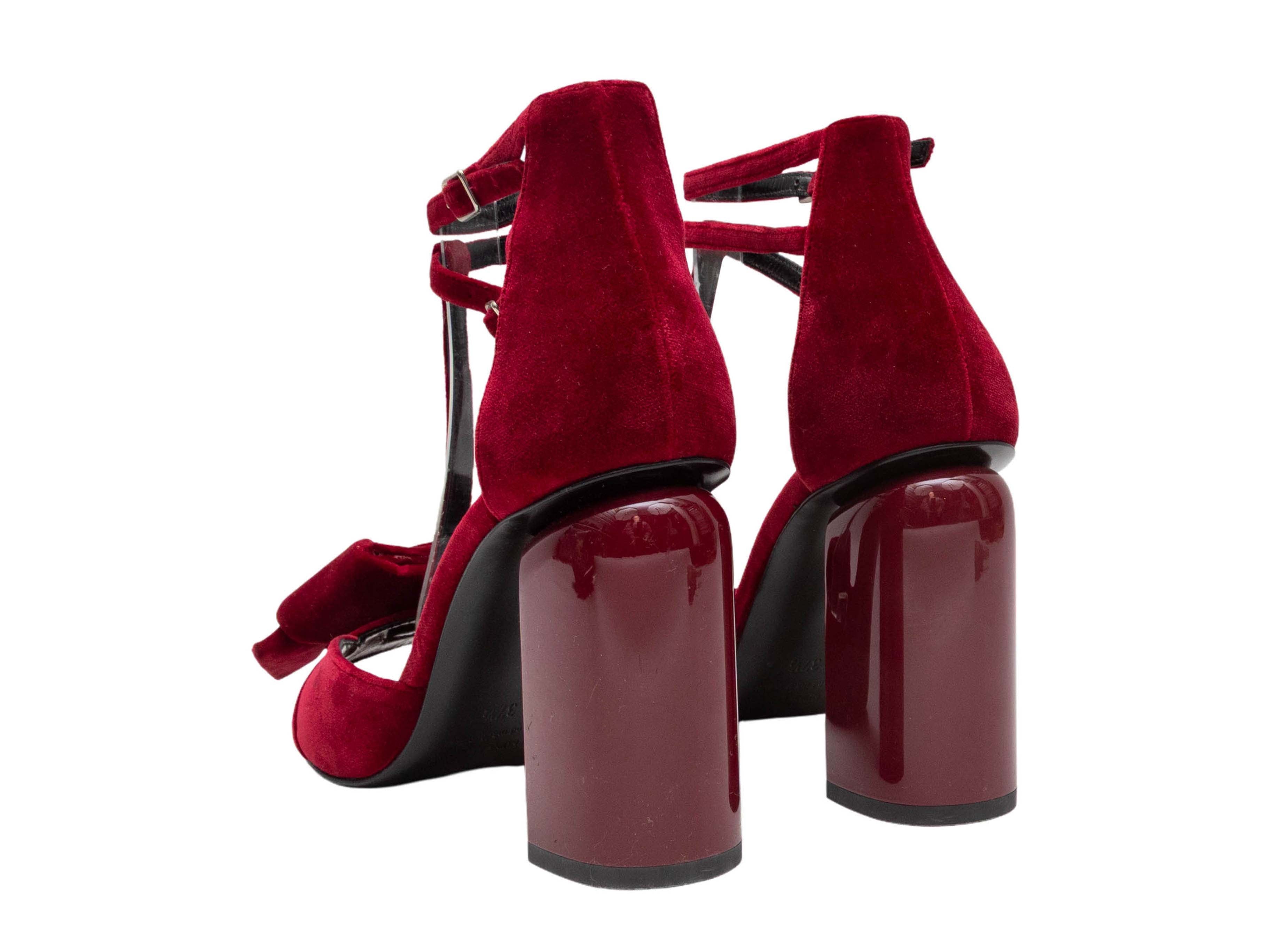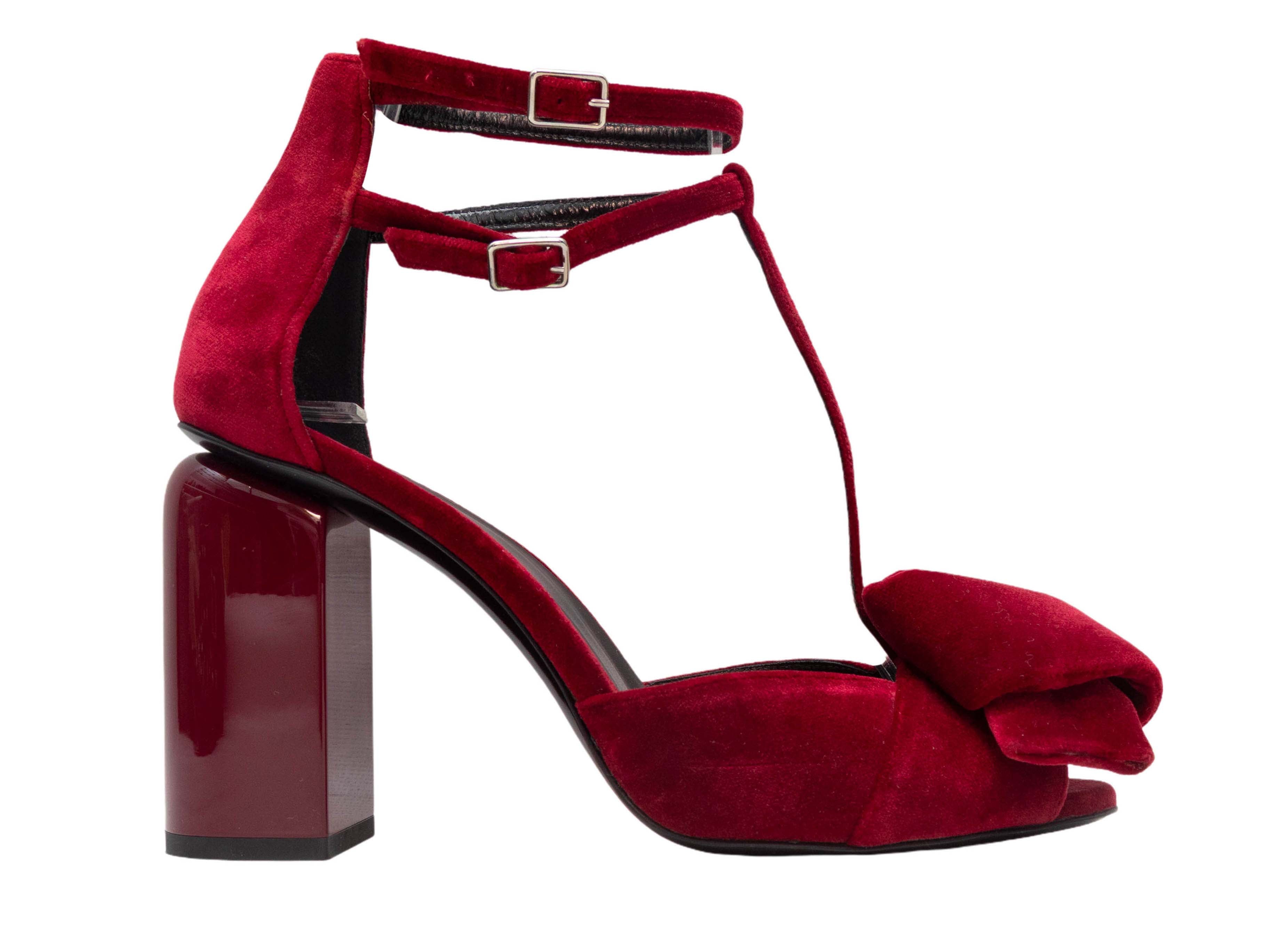 Product Details: Red velvet T-strap heeled sandals by Pierre Hardy. Lacquered block heels. Silver-tone buckle closures at ankle straps. 3.5" heel height.
