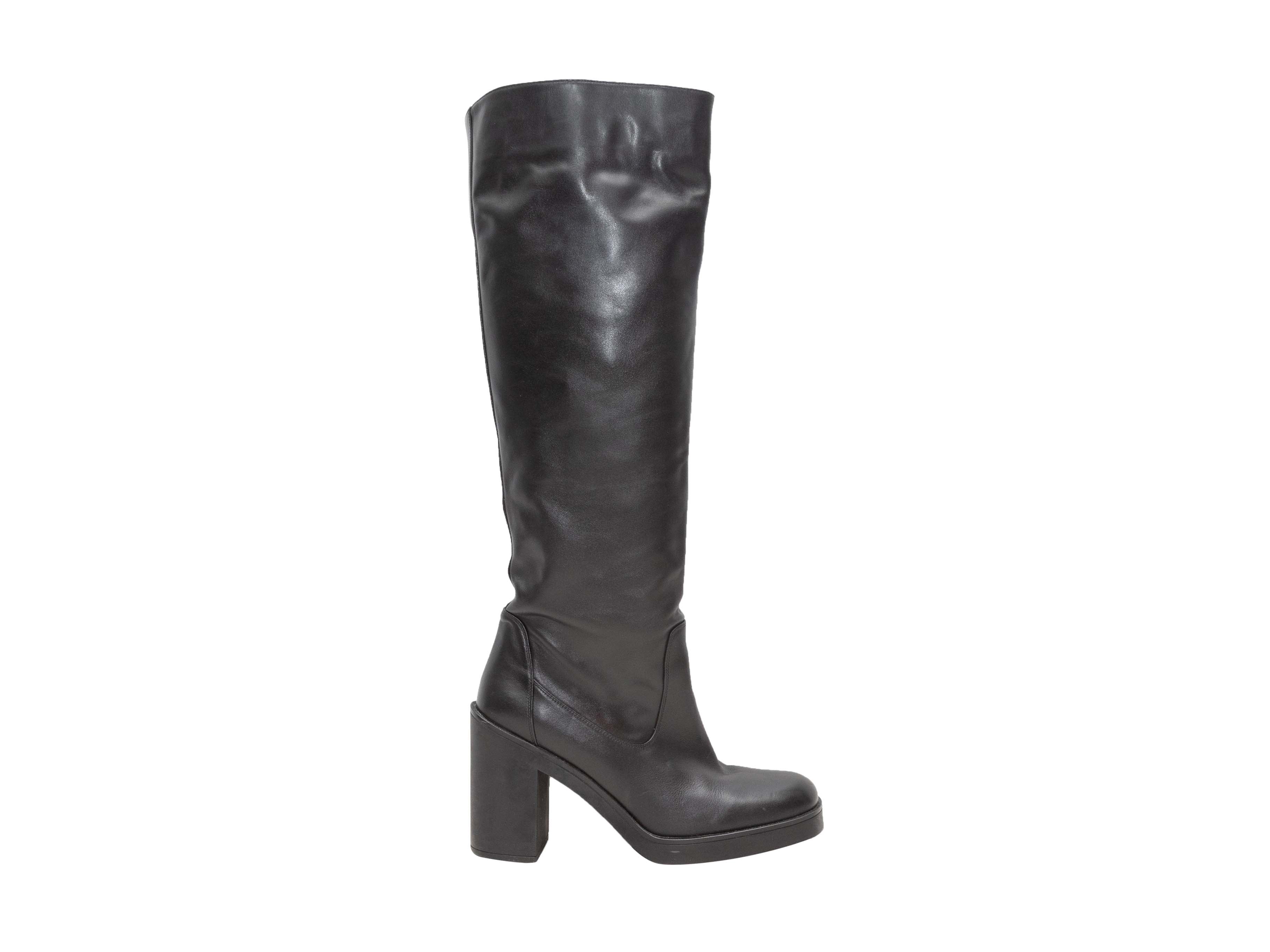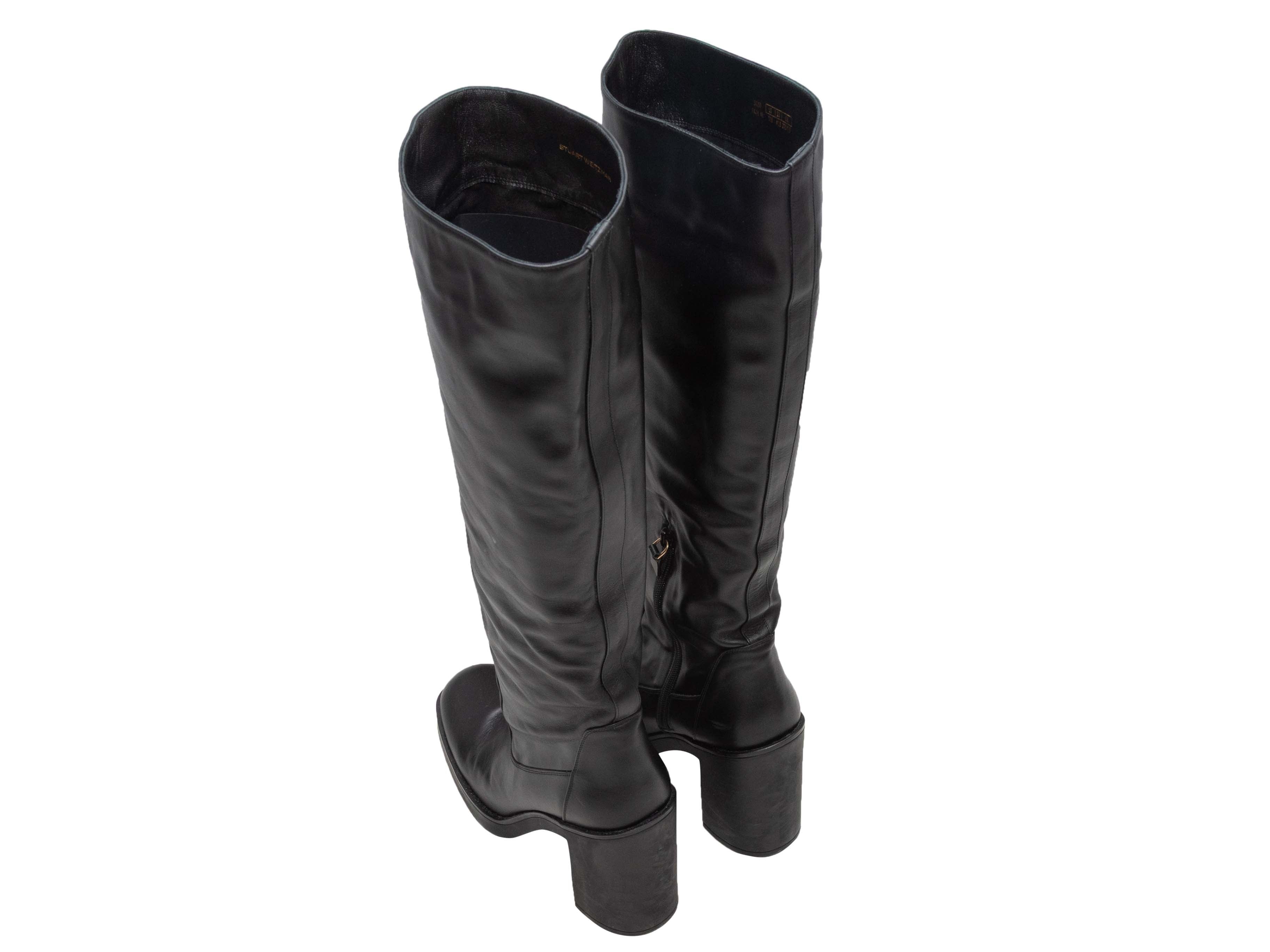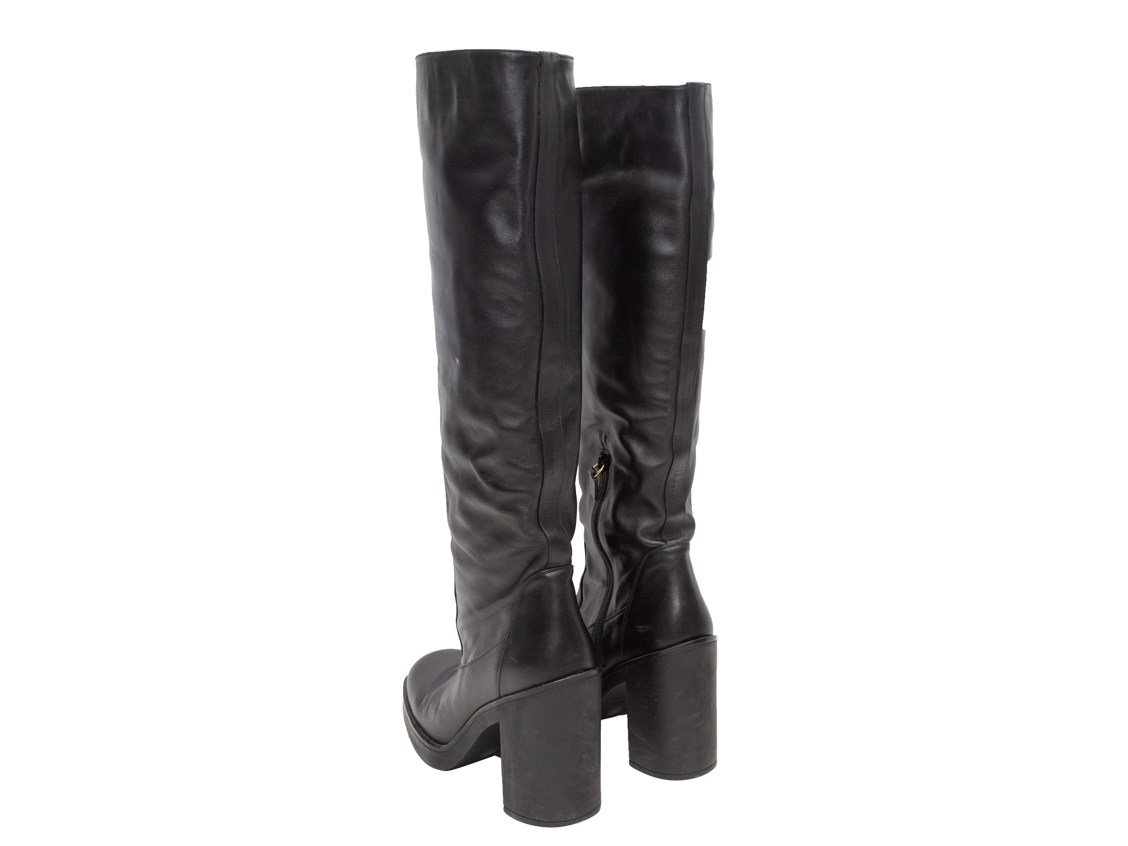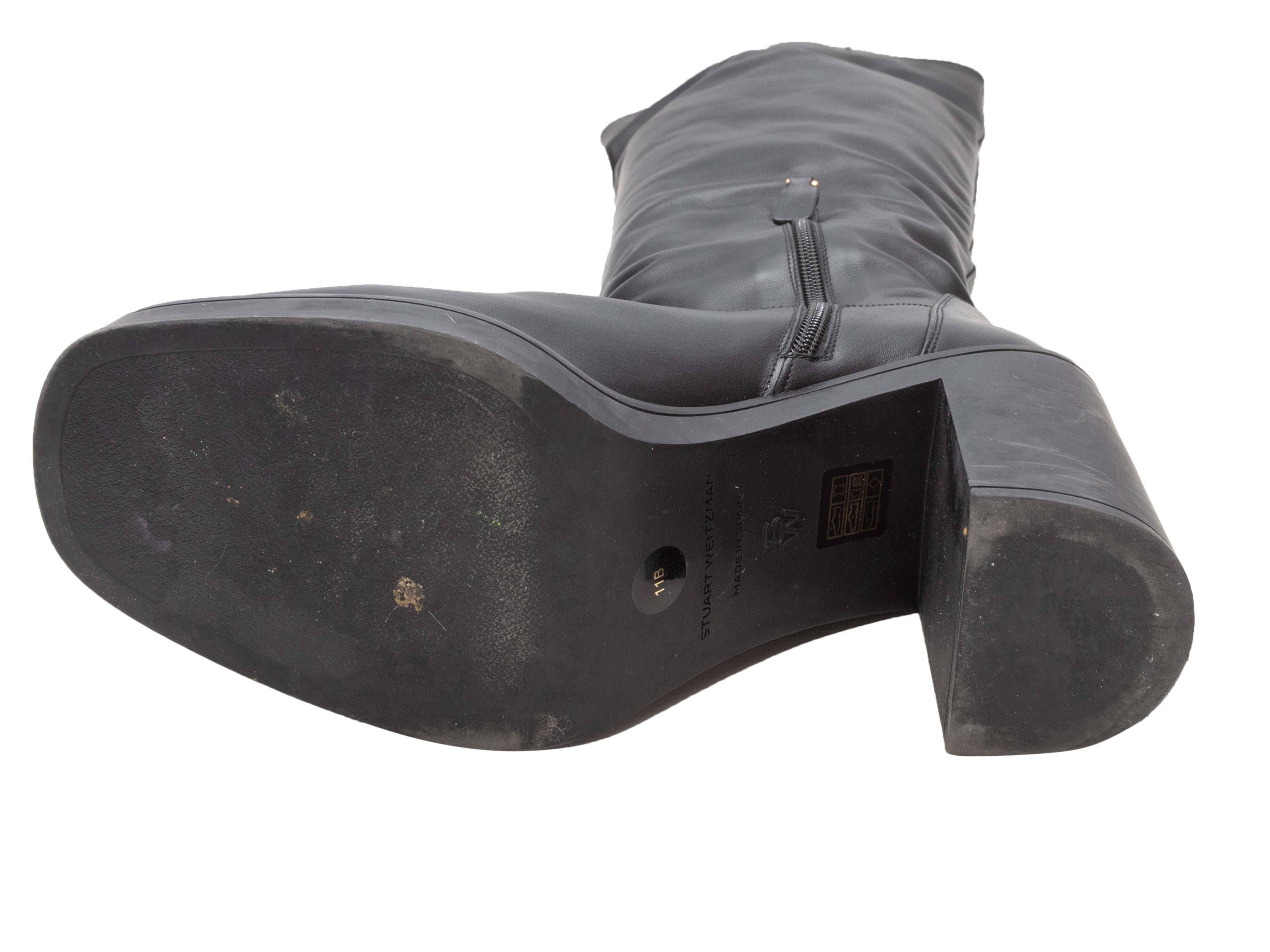Product Details: Black knee-high heeled leather boots by Stuart Weitzman. Block heels. Zip closures at inner sides. 16.5" shaft height, 0.75" platform height, 4.25" heel height.