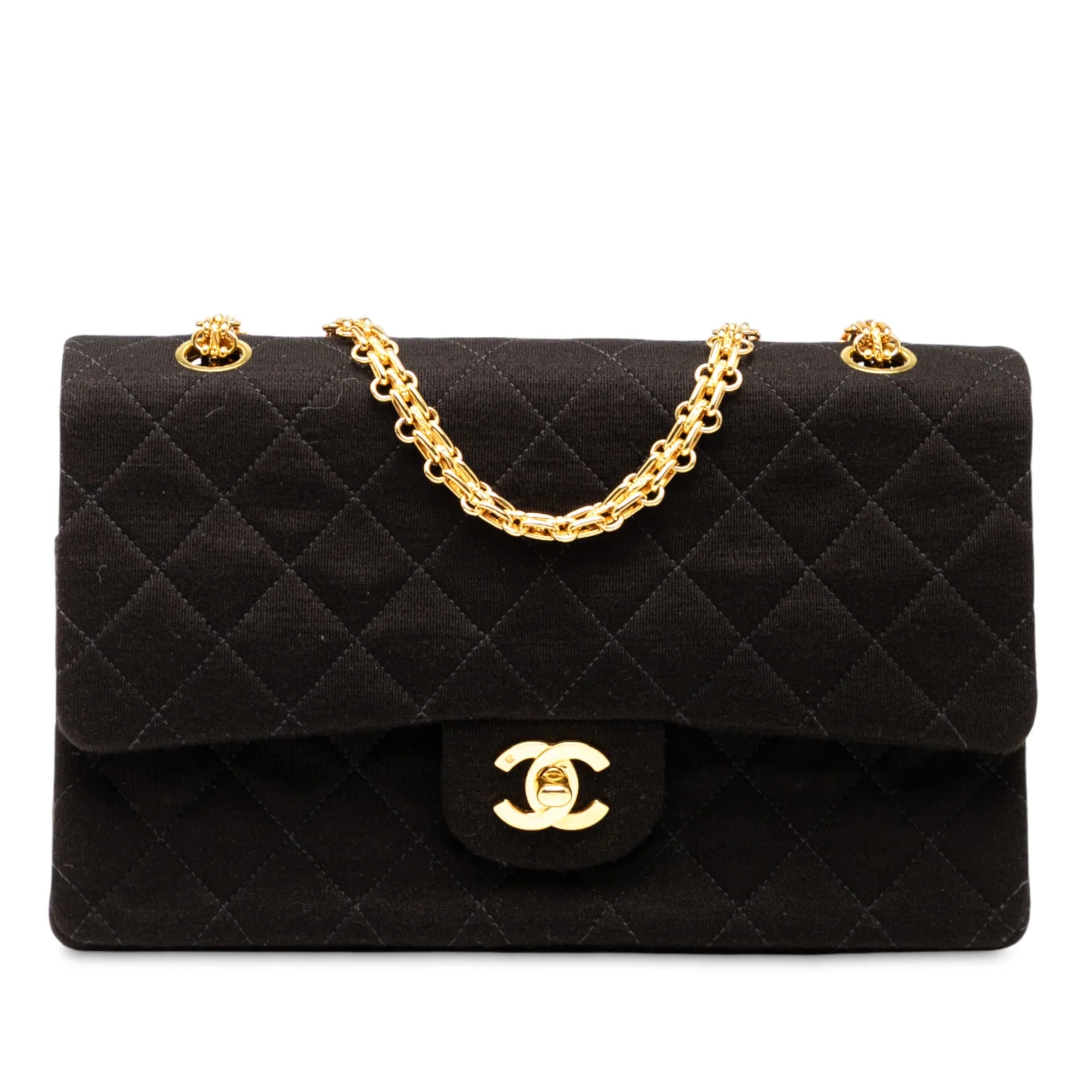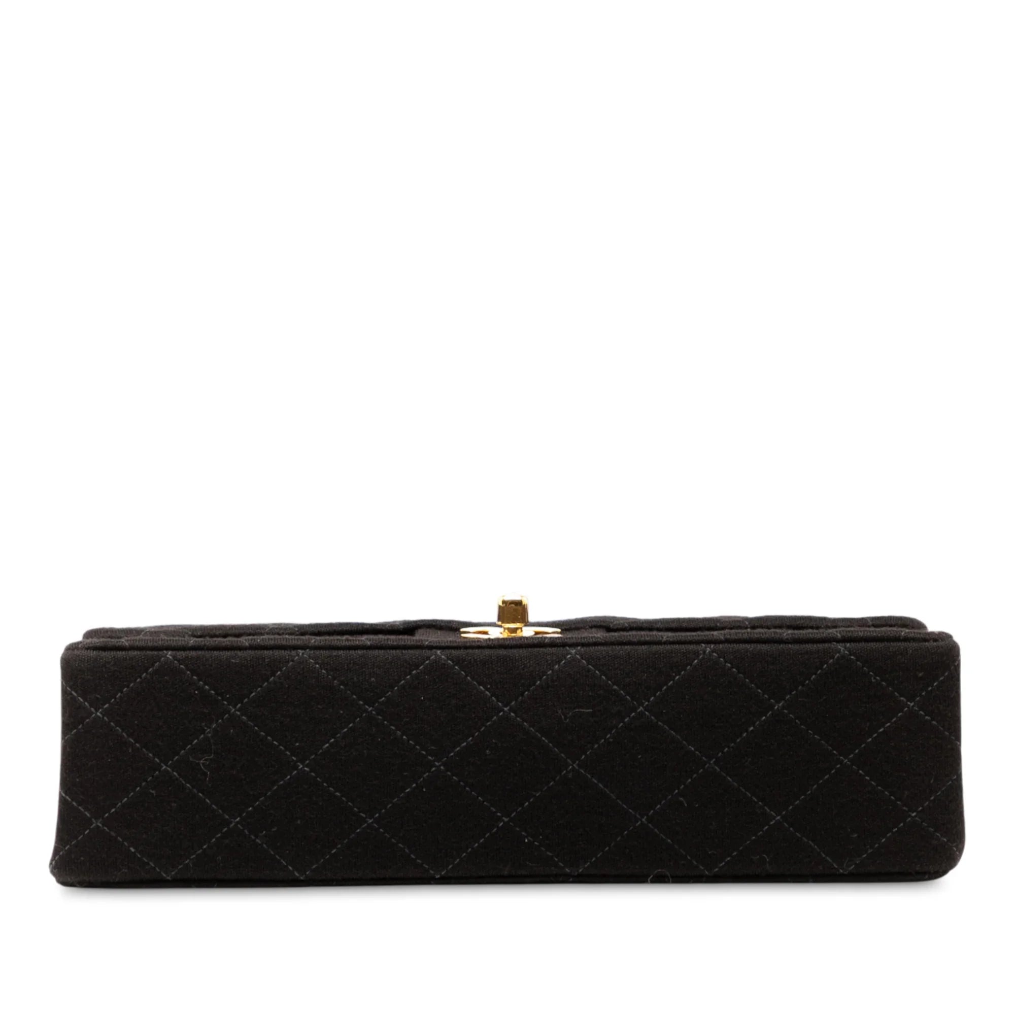 Product Details: Black Chanel Medium Classic Jersey Double Flap Shoulder Bag. This shoulder bag features a quilted jersey body, chain link shoulder straps, double flaps with CC turn-lock closure, an exterior back slip pocket, and interior zip and slip pockets. 6.3" L x 10" W x 2.6" D. Serial number 2270317.
