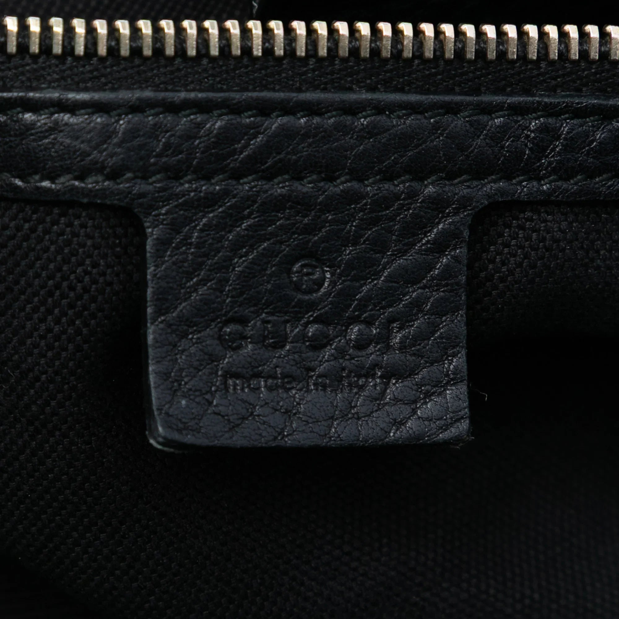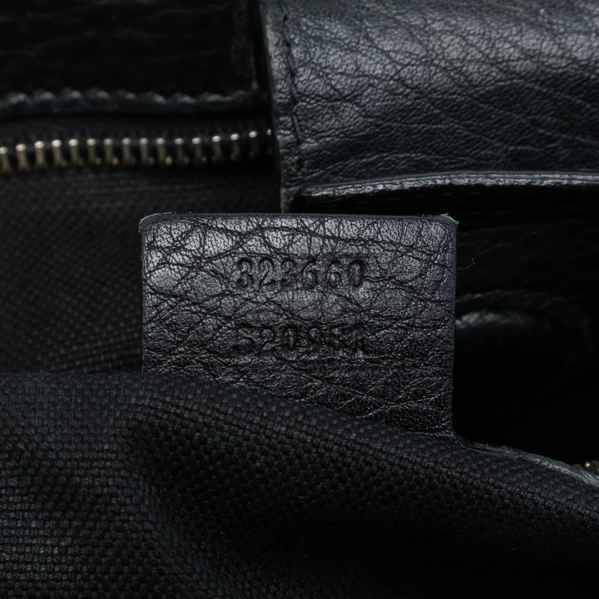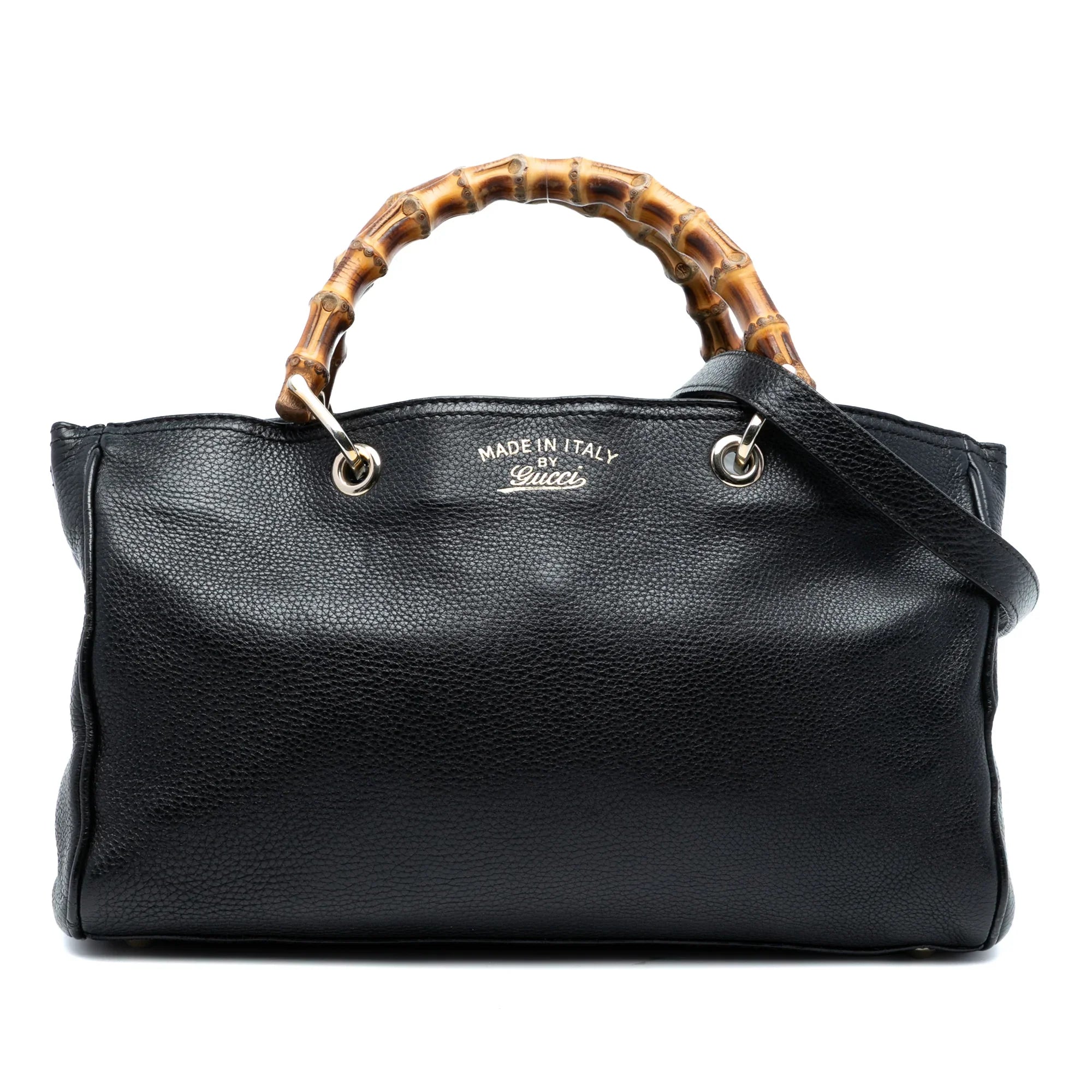 Product Details: Black Gucci Medium Calfskin Bamboo Shopper Satchel. The Bamboo Shopper satchel features a leather body, bamboo top handles, a detachable flat leather strap, an open top with a magnetic snap closure, interior zip and slip compartments, and interior zip and slip pockets. 8.1" L x 13.2" W x 5.9" D, 3.5" drop. Serial number 323660 520981.