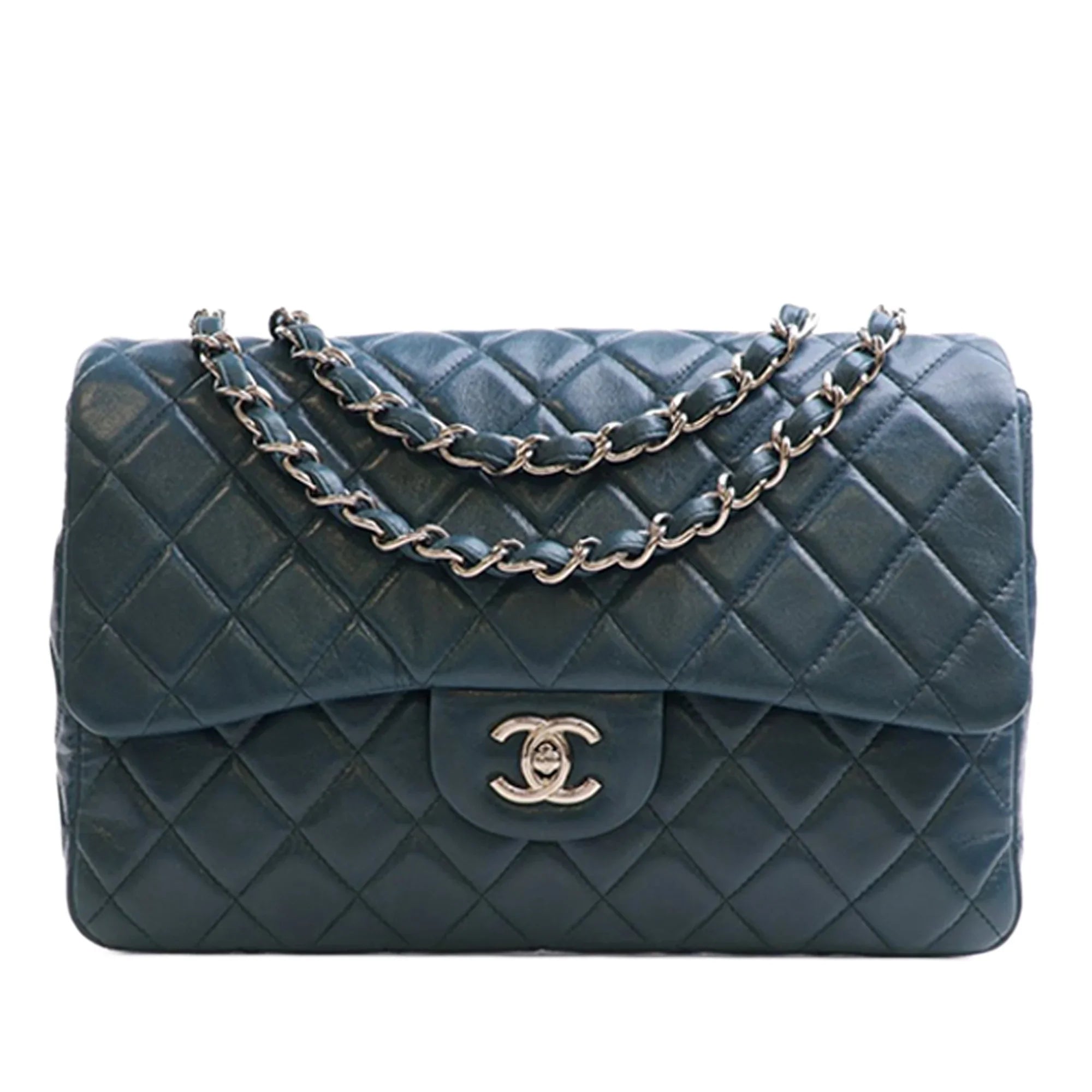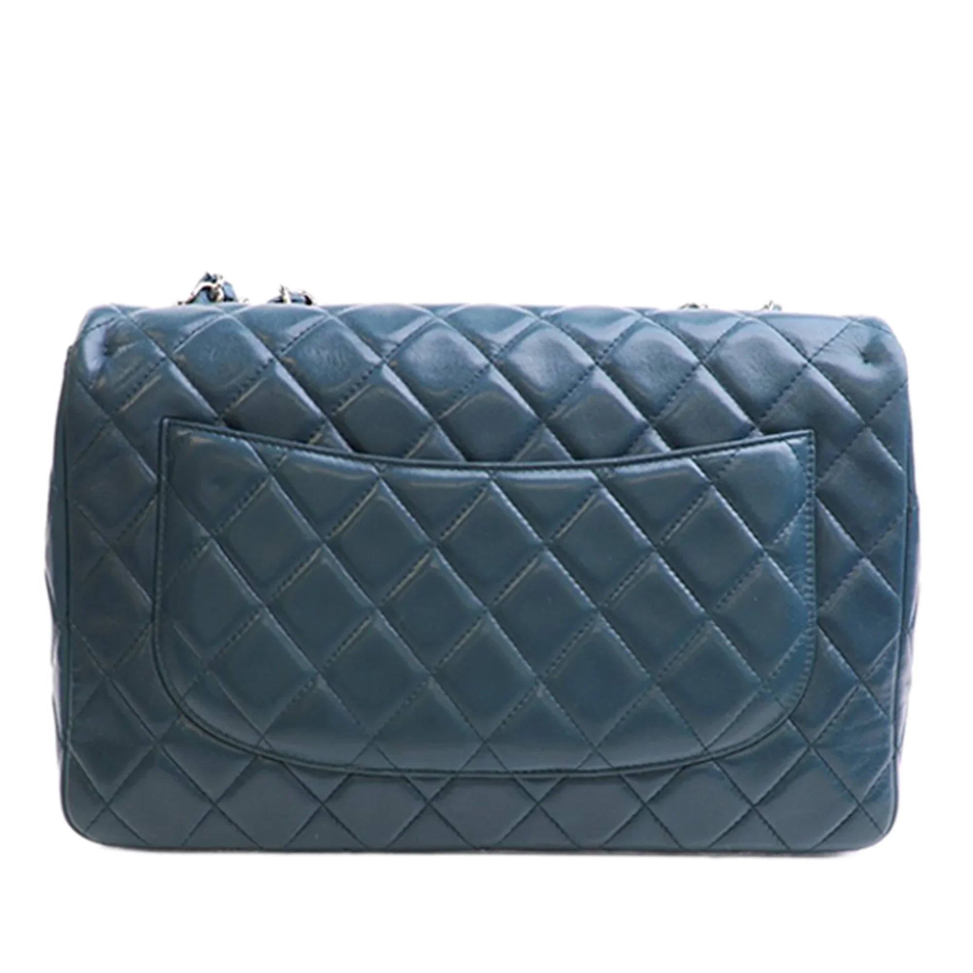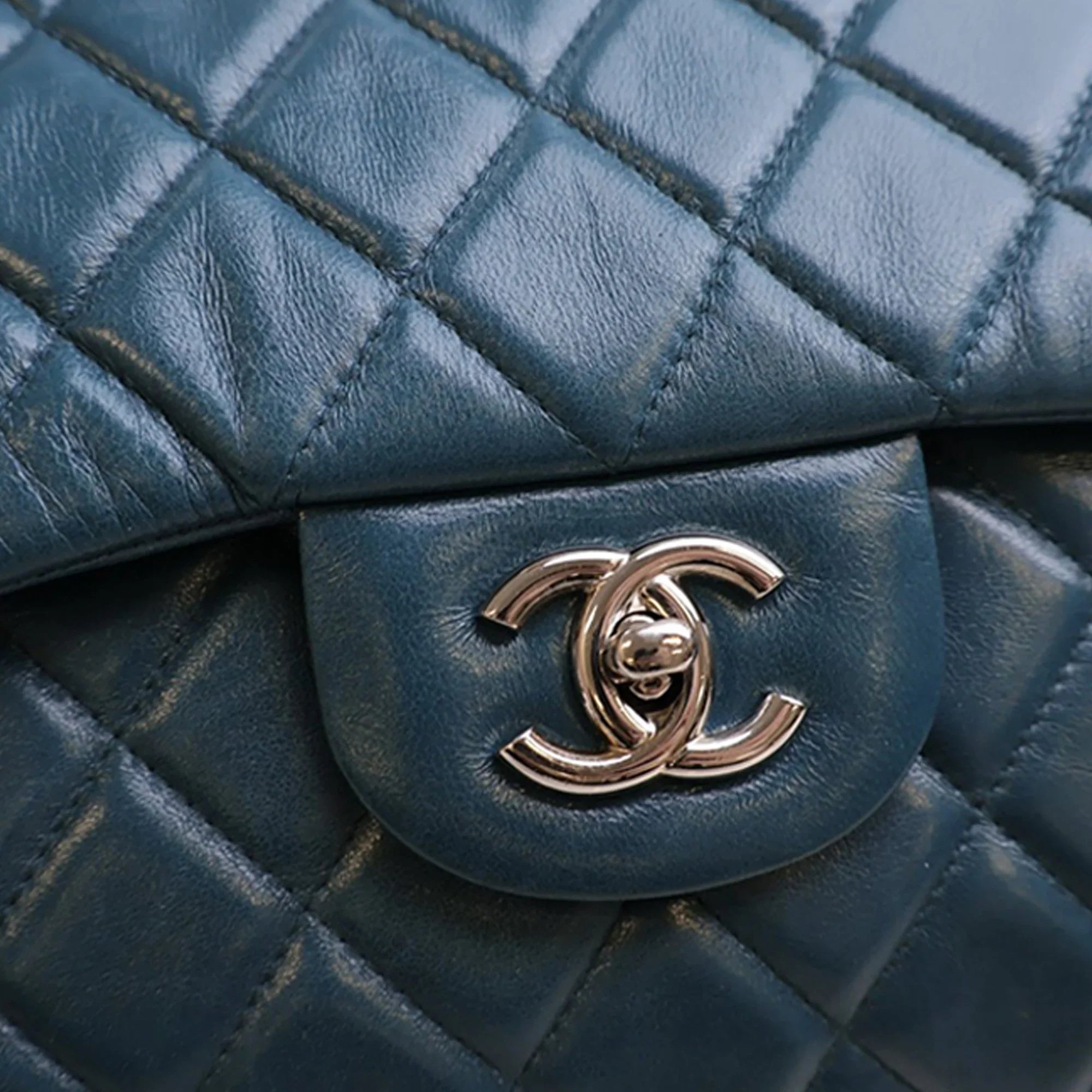 Product Details: Blue Chanel Jumbo Classic Lambskin Single Flap Shoulder Bag. This shoulder bag features a quilted lambskin leather body, leather-woven chain straps, double front flaps with CC turnlock closure, an exterior back slip pocket, and interior zip and slip pockets. 7.6" L x 11.7" W x 3.9" D.