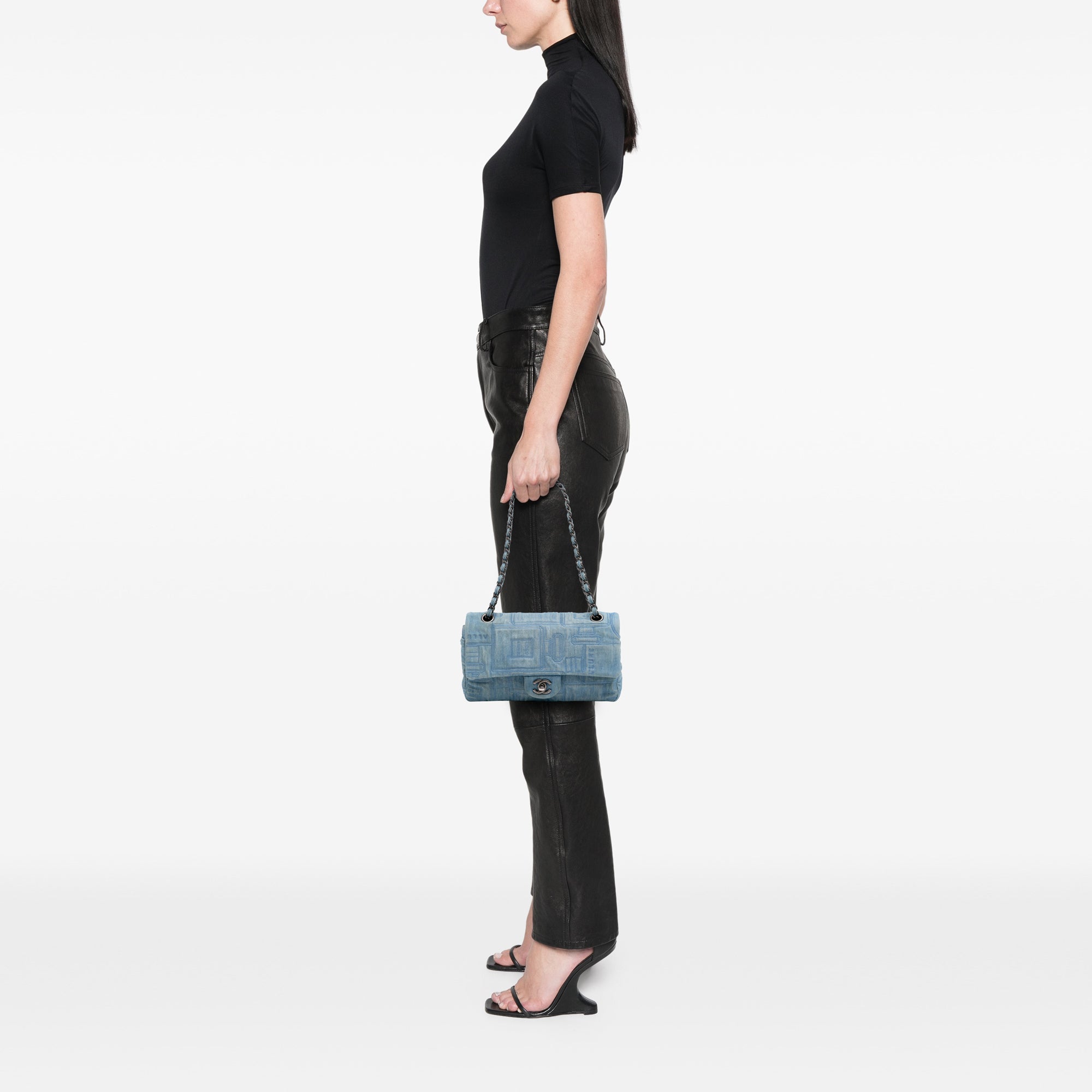 Product Details: Blue Chanel Medium Embroidered Denim Perfume Bottle Single Flap Shoulder Bag. This shoulder bag features a denim body, a denim-woven chain link strap, a flap with CC turn lock closure, an exterior back slip pocket, and interior zip and slip pockets. 5.9" L x 9.8" W x 2.4" D. Serial number 22332980.