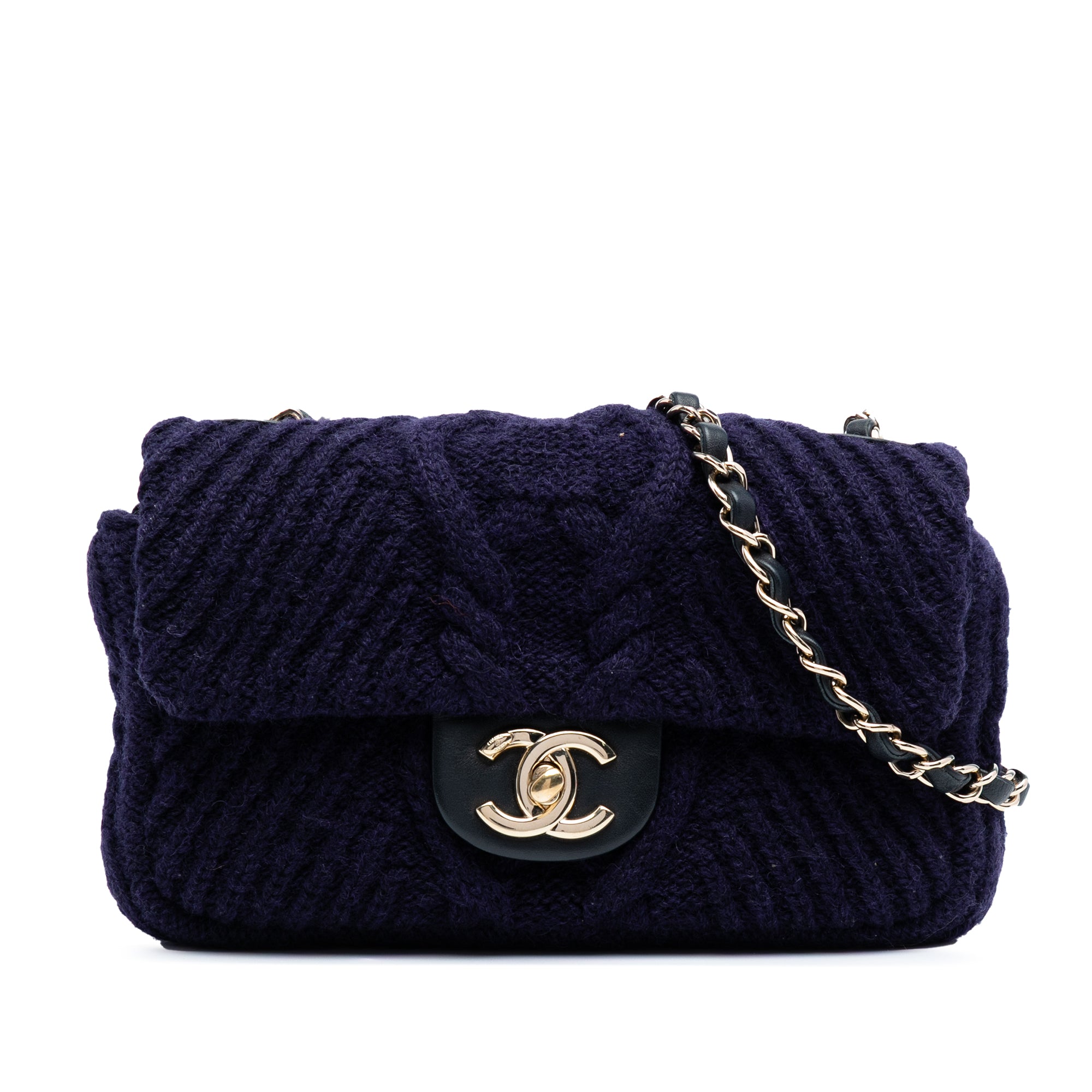 Product Details: Blue Chanel Small Paris Hamburg Cable Knit Flap Shoulder Bag. This shoulder bag features a knit fabric body, a gold-tone leather woven chain link shoulder straps, a front flap with interlocking Cs and a twist lock closure, an exterior back slip pocket, and interior zip and slip pockets. 5.5" L x 7.5" W x 2" D. Serial number 25853105.