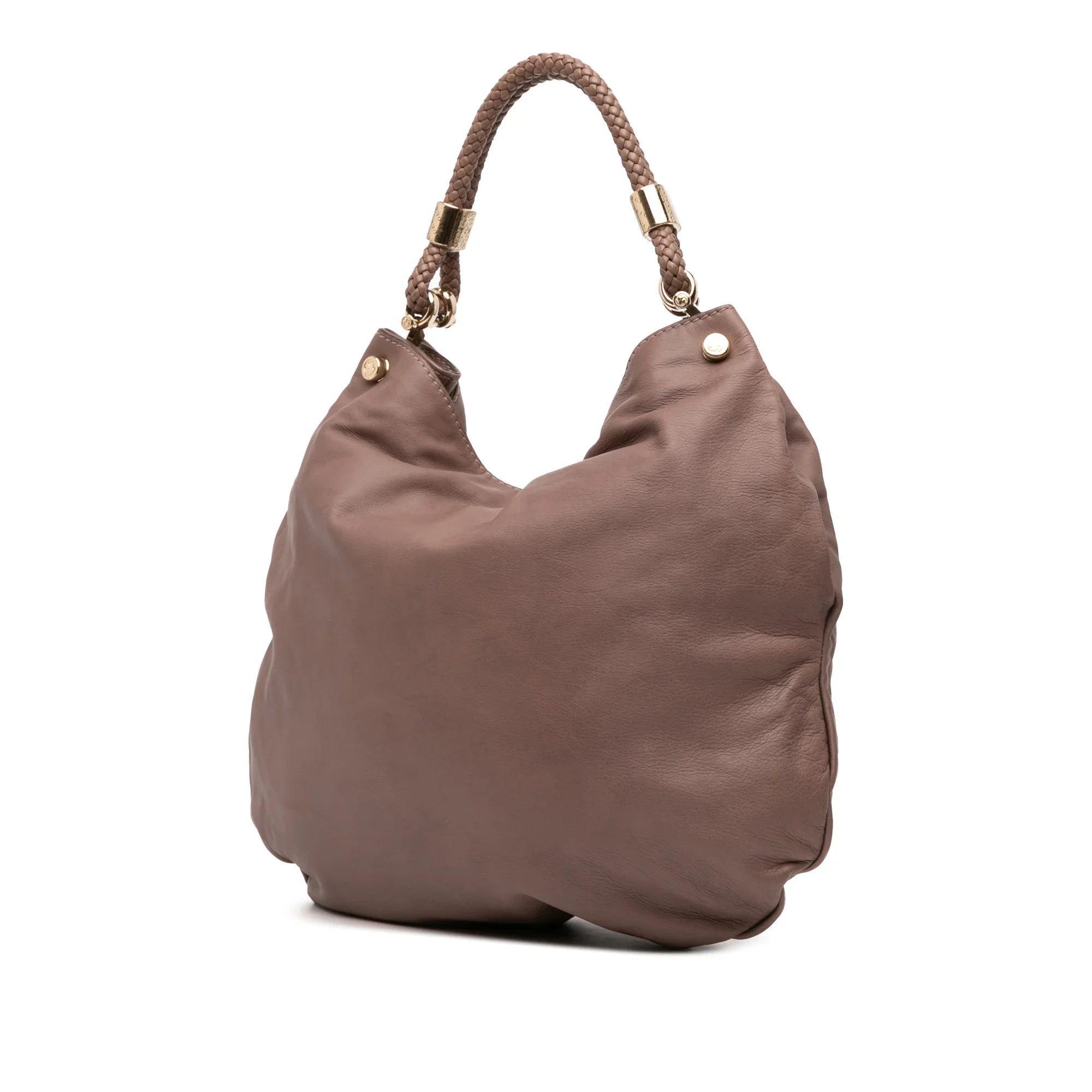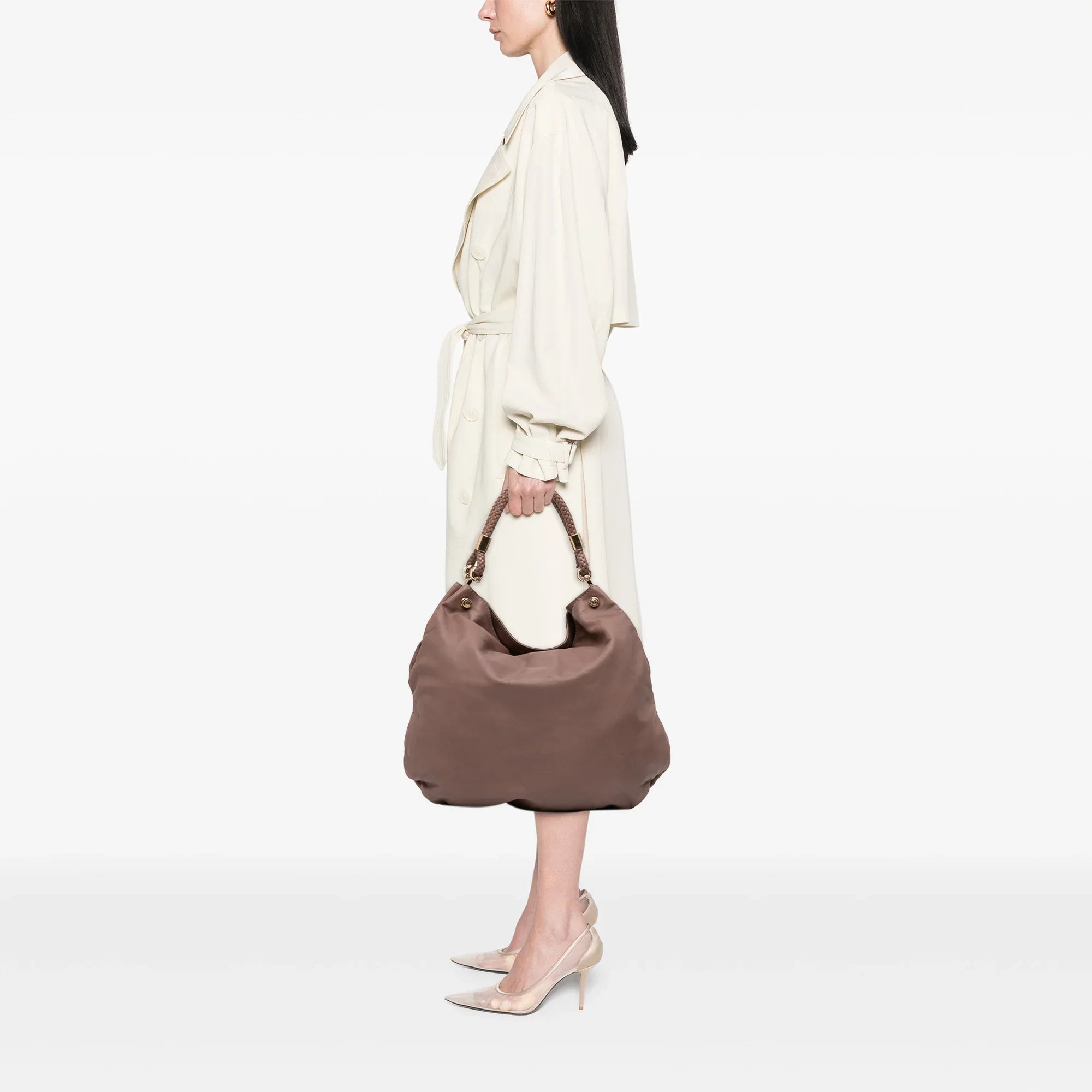 Product Details: Brown Gucci Leather Shoulder Bag. This shoulder bag features a leather body, braided leather handle, an open top, and an interior zip pocket. 15" L x 16.9" W x 0.4" D, 6.3" drop. Serial number 257055 002123.
