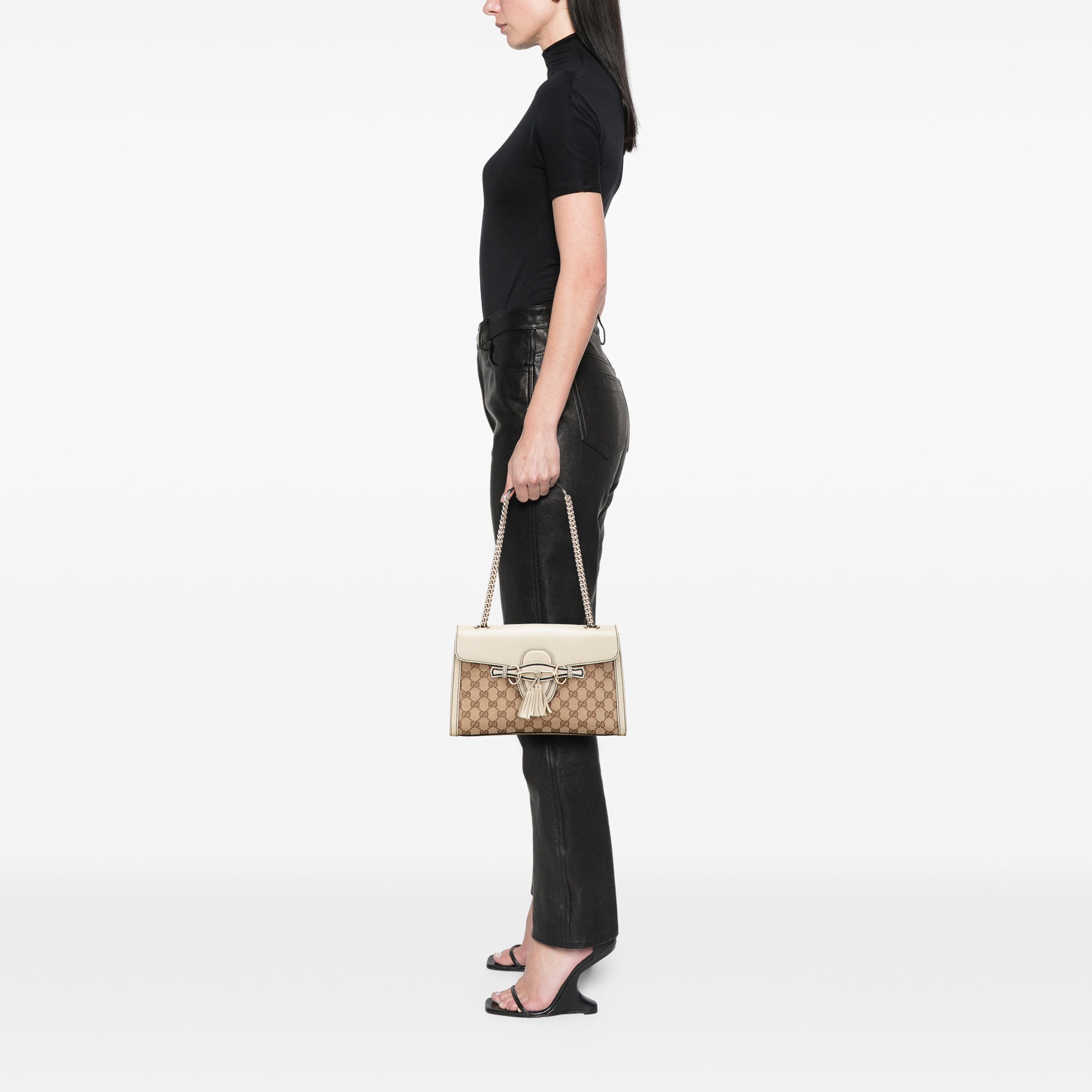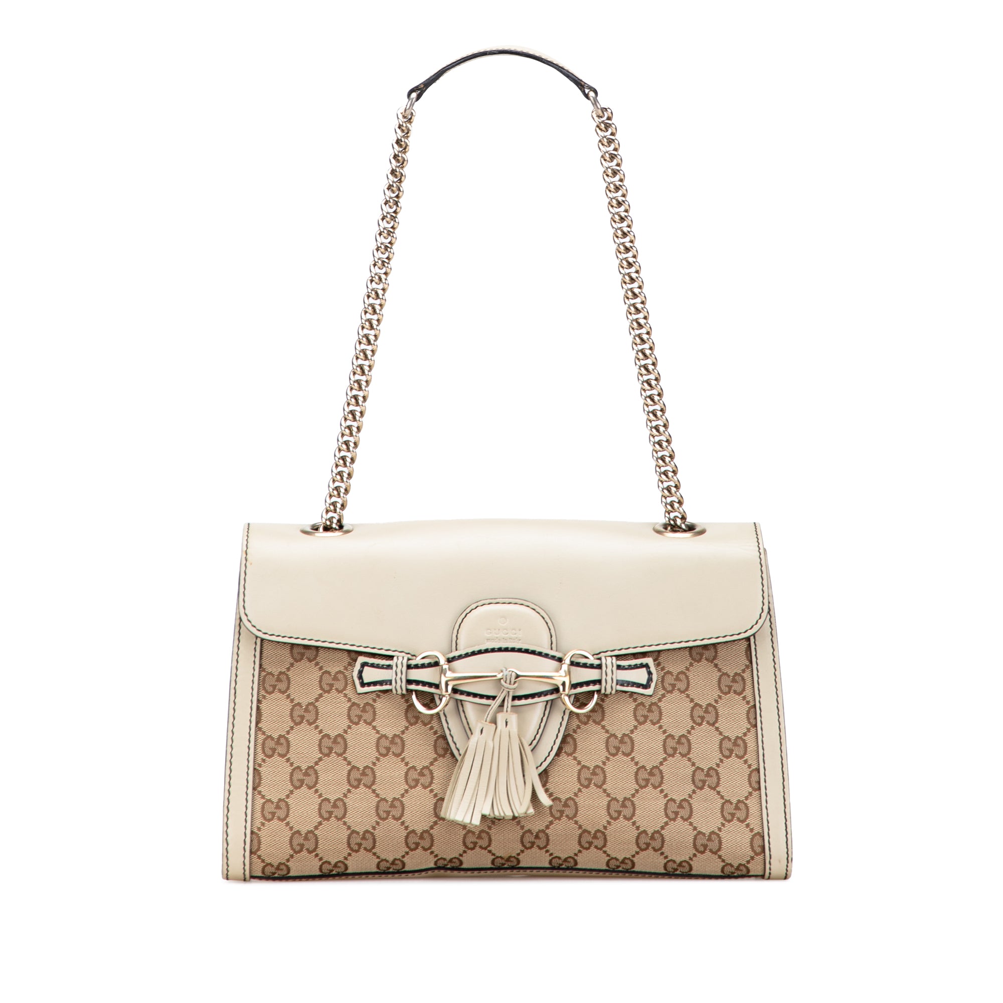 Product Details: Brown Gucci Medium GG Canvas Emily Shoulder Bag. The Emily features a canvas body with leather trim, a curb chain strap, a front flap with a tuck closure and a tassel detail, and interior slip pockets. 7.9" L x 11.4" W x 3.5" D, 9.8" drop. Serial number 295402 520981.