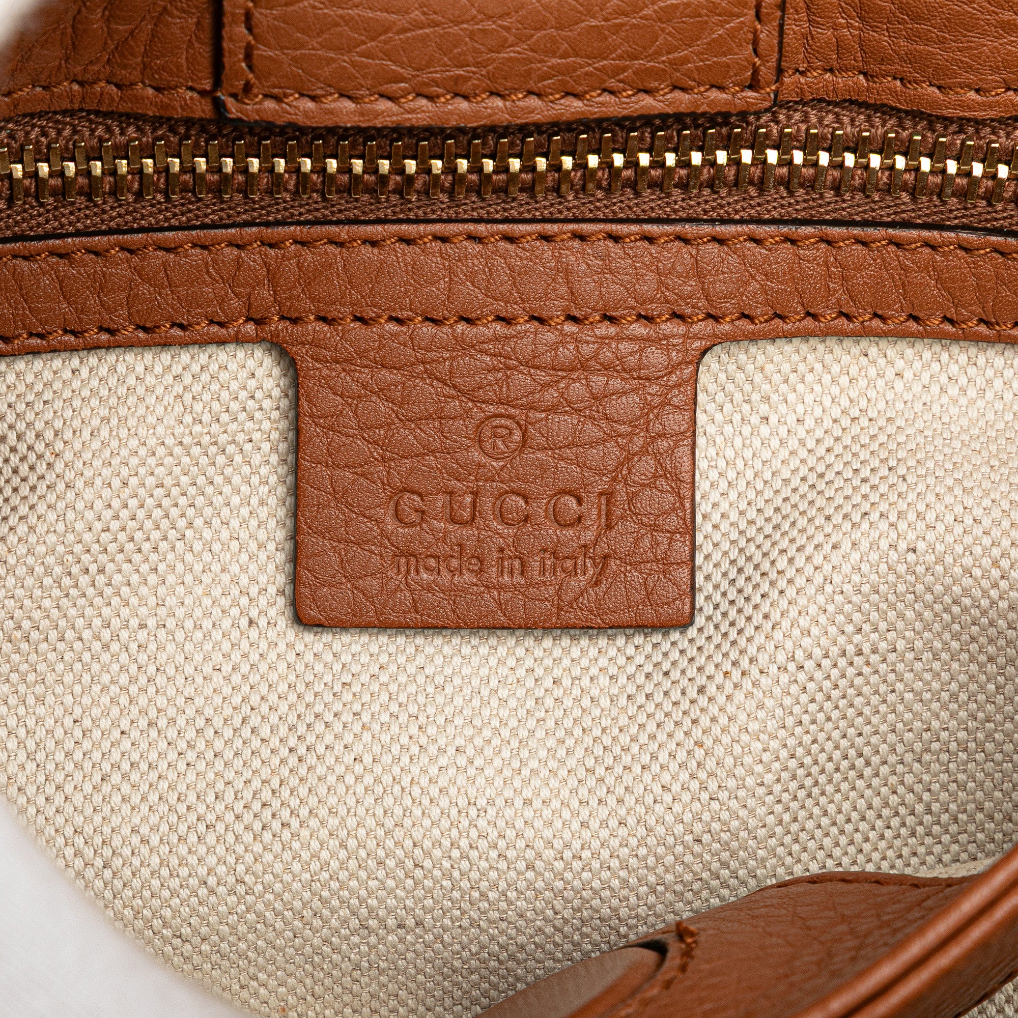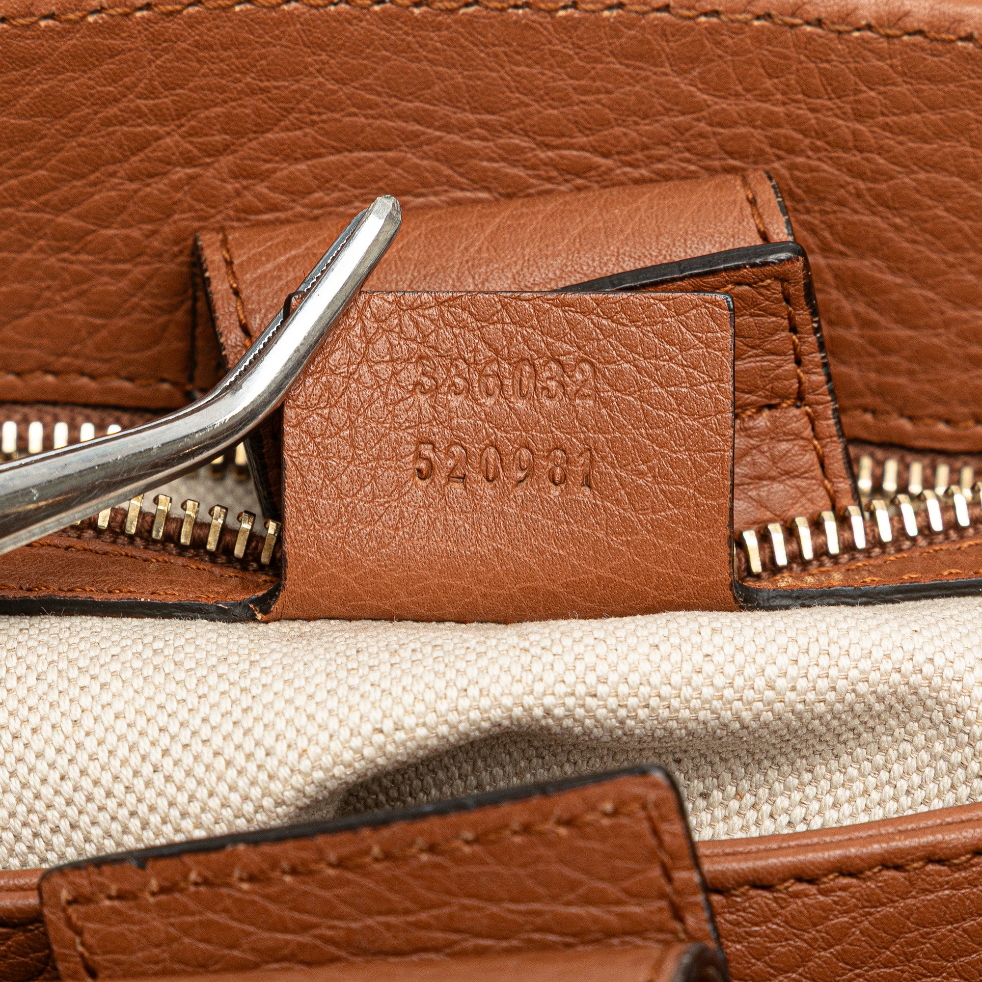 Product Details: Brown Gucci Small Calfskin Bamboo Shopper Satchel. The Bamboo Shopper features a leather body, bamboo top handles, a detachable and adjustable flat leather shoulder strap, an open top with magnetic snap closure, and interior zip and slip pockets. 9.1" L x 11" W x 4.3" D, 3.9" drop. Serial number 336032 520981.