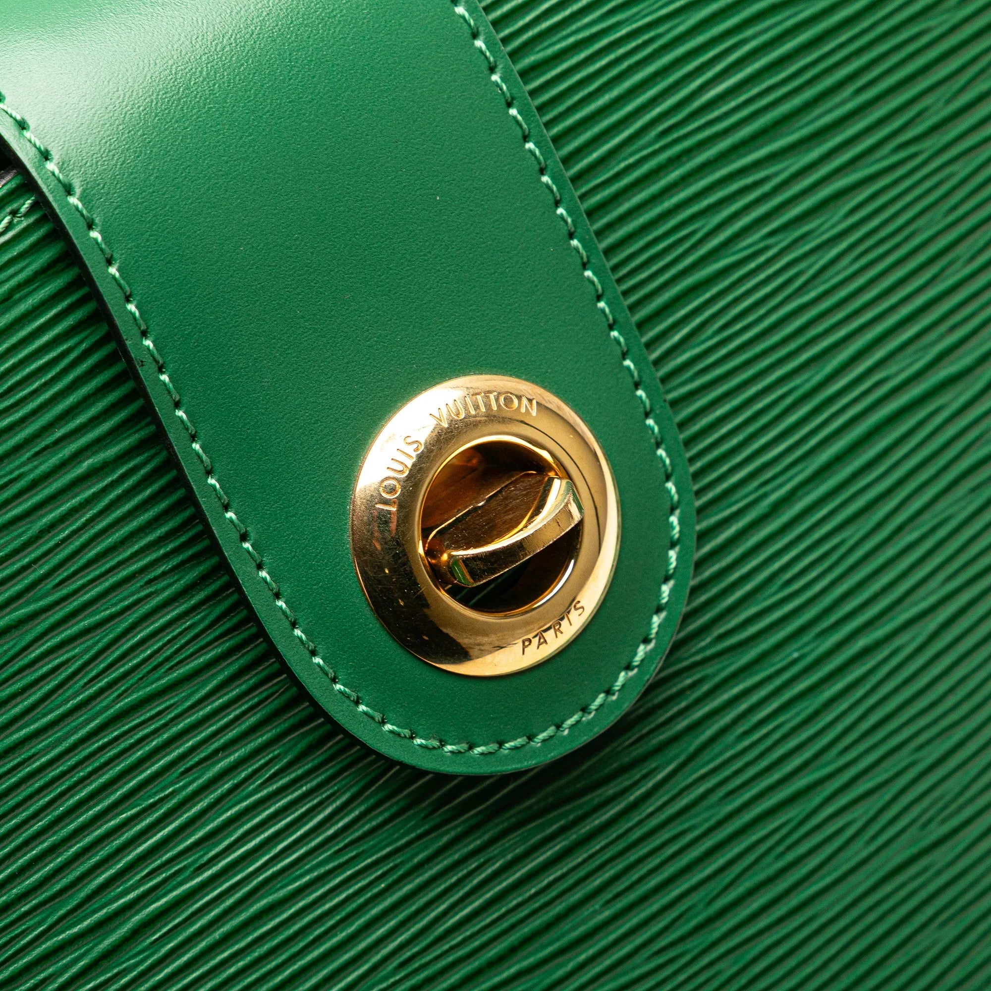 Product Details: Green Louis Vuitton Epi Cluny Shoulder Bag. The Cluny features an epi leather body, an adjustable shoulder strap, a top strap with a twist lock closure, and an interior slip pocket. 11.4" L x 10.2" W x 6.7" D. Serial number VI1924.