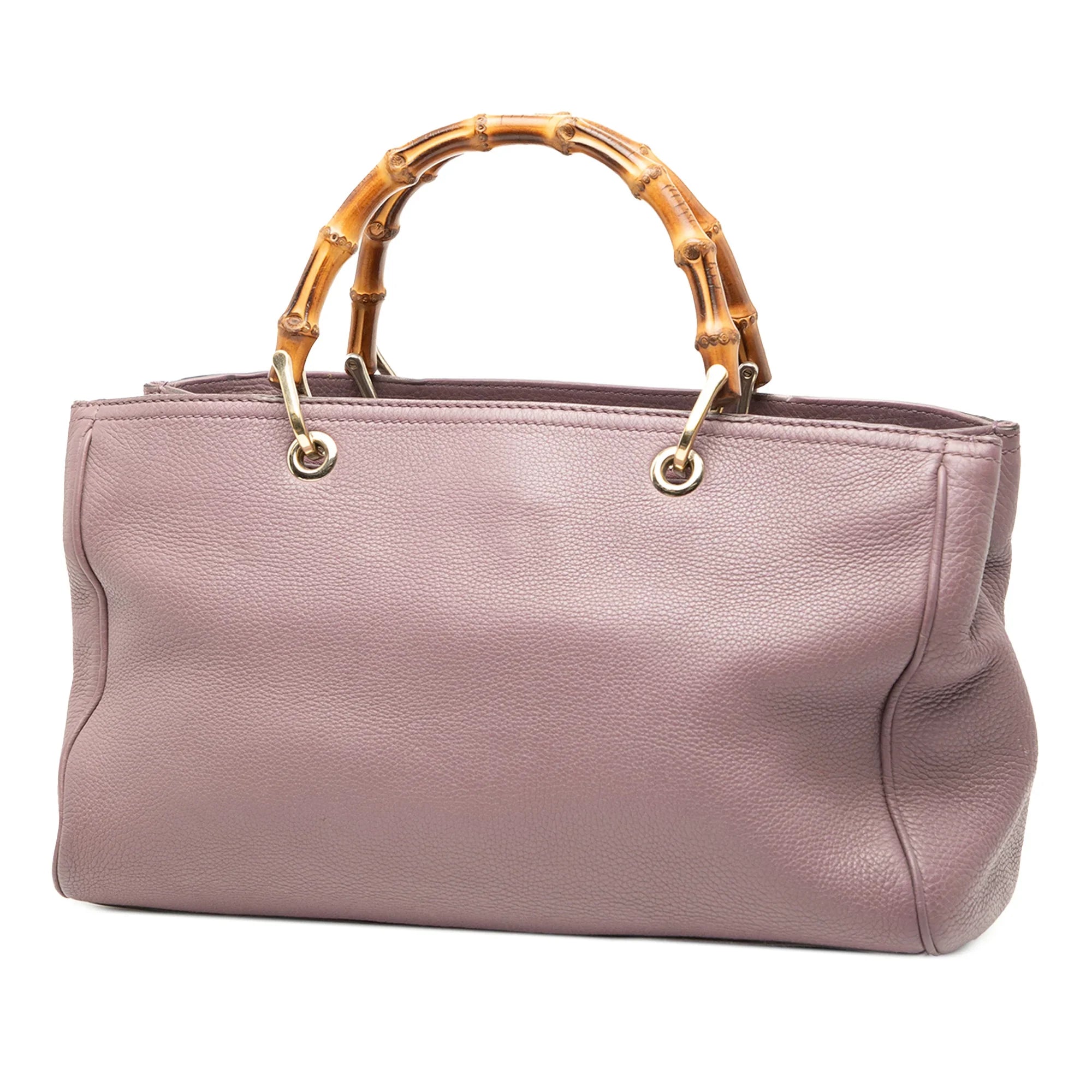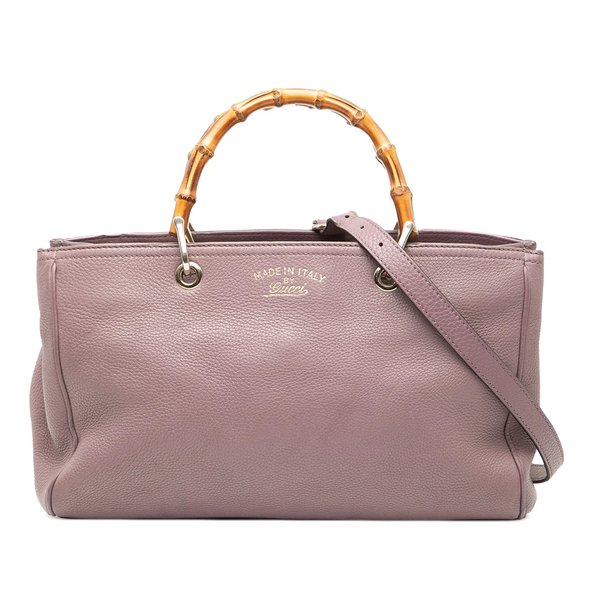 Product Details: purple Gucci Medium Calfskin Bamboo Shopper Satchel. The Bamboo Shopper features a leather body, bamboo top handles, a detachable strap, an open top with magnetic snap closure, and interior zip and slip pockets. 7.9" L x 13" W x 5.5" D, 3.9" drop. Serial number 323660 520981.