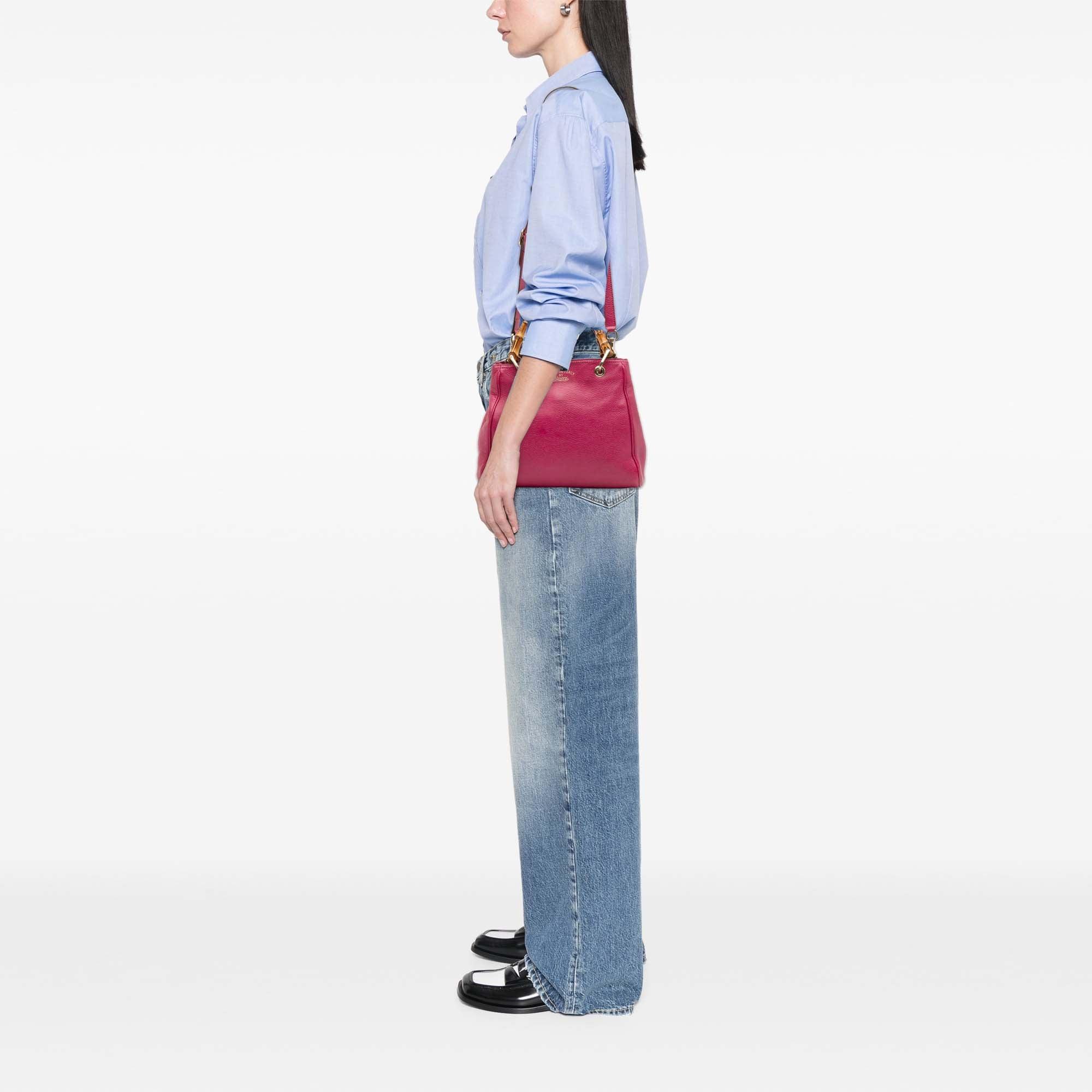 Product Details: Pink Gucci Small Calfskin Bamboo Shopper Satchel. The Small Bamboo Shopper features a leather body, bamboo top handles, a detachable and adjustable flat leather shoulder strap, an open top with magnetic snap closure, and interior zip and slip pockets. 9.1" L x 10.8" W x 4.7" D, 3.9" drop. Serial number 336032 520981.