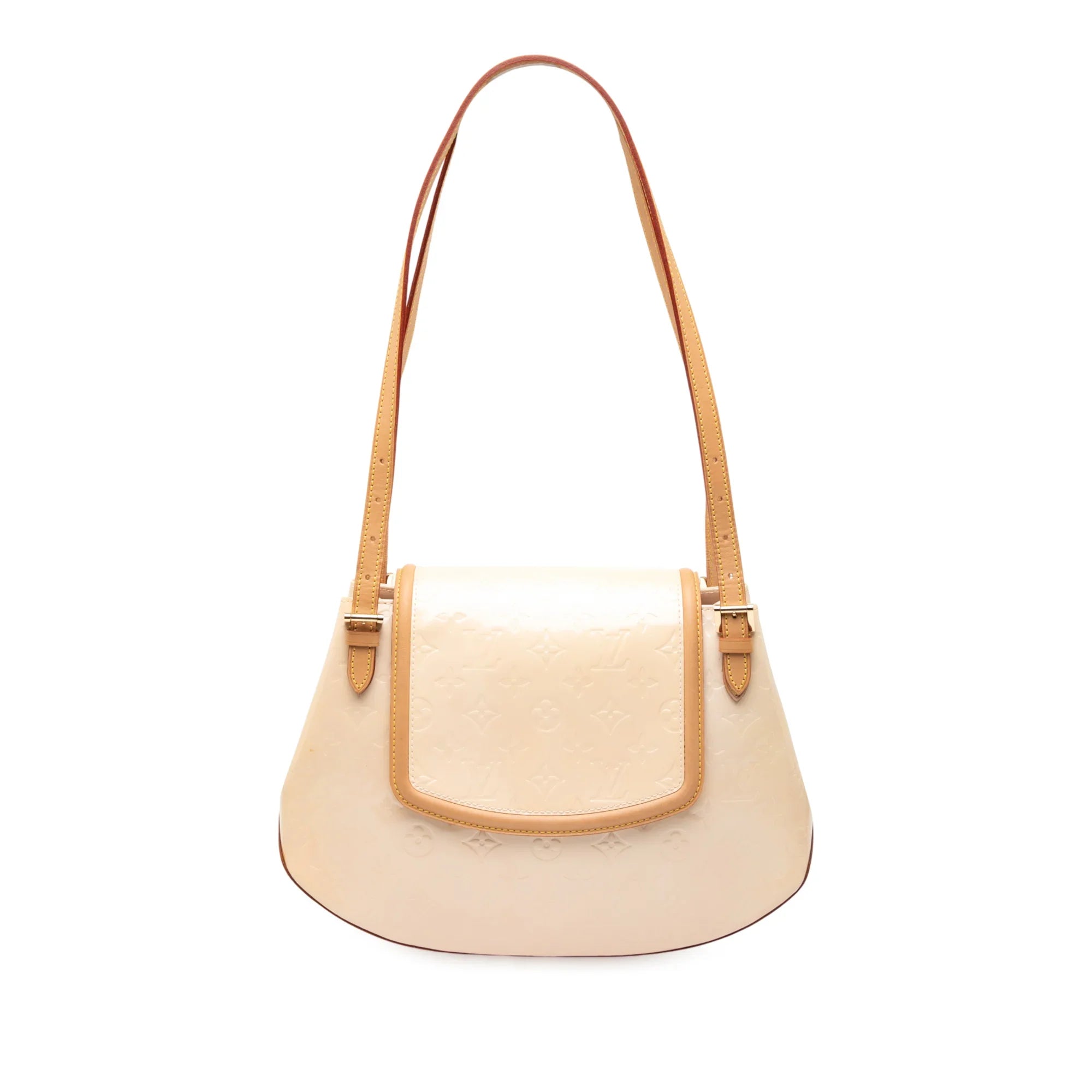 Product Details: Pink Louis Vuitton Monogram Vernis Biscayne Bay GM Shoulder Bag. The Biscayne Bay GM features monogram vernis leather body, flat vachetta leather straps and trim, a front flap, and interior pockets. 10.2" L x 13" W x 3.7" D. Serial number TH0024.