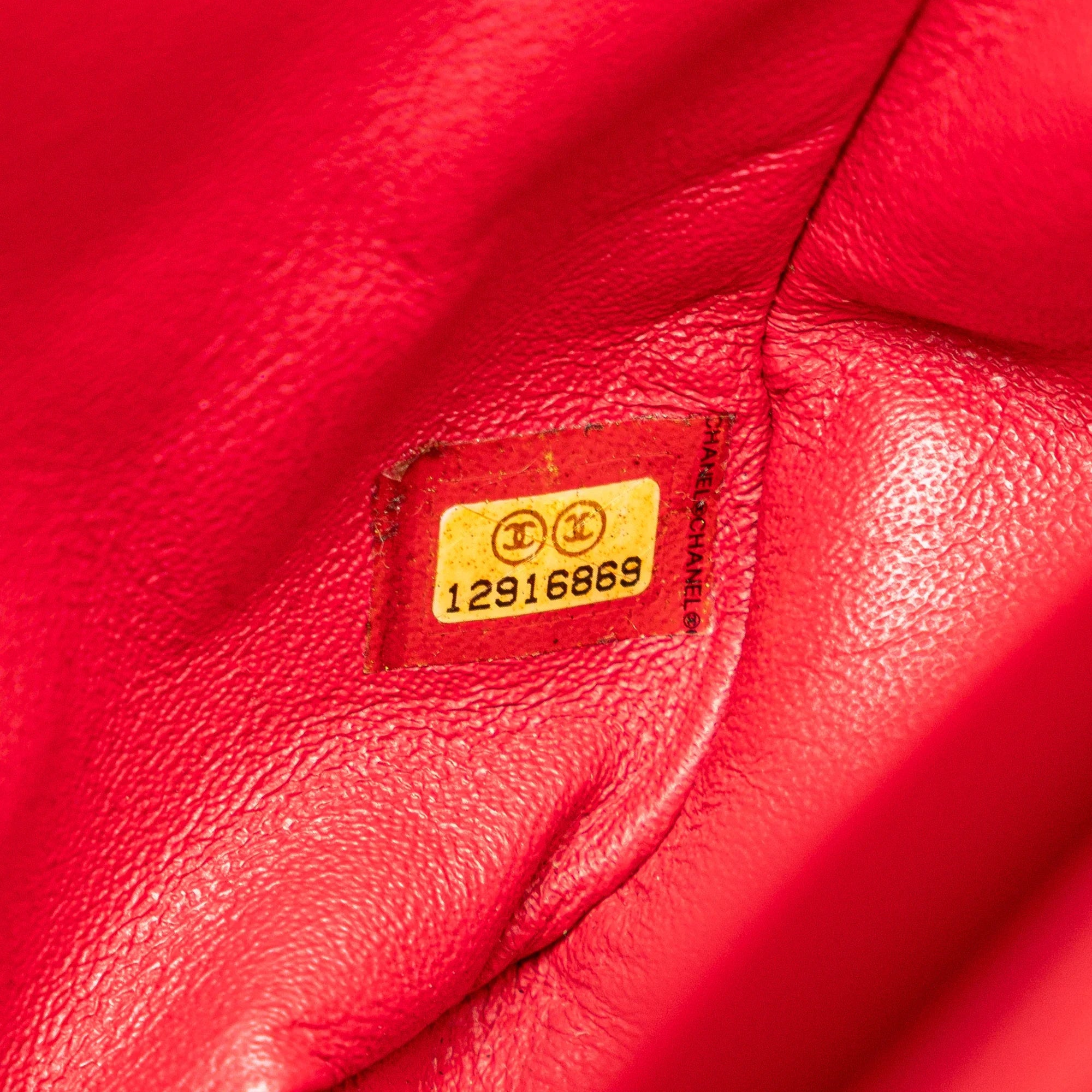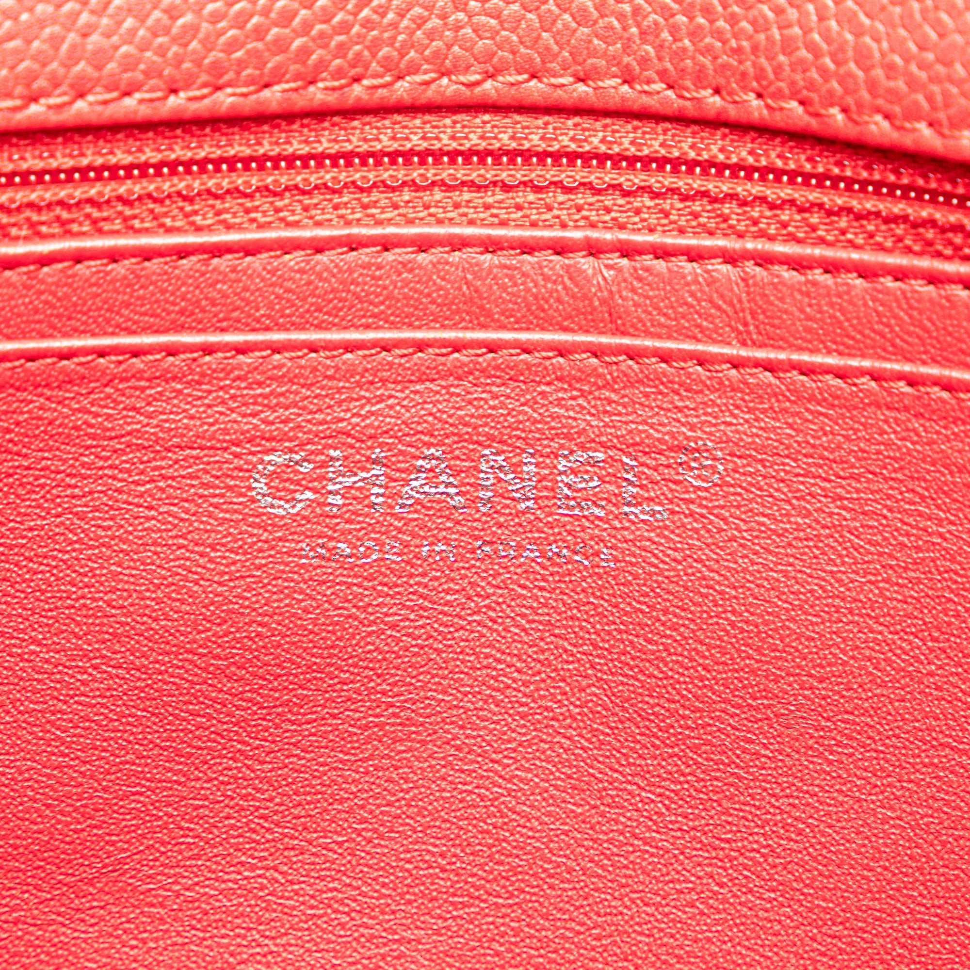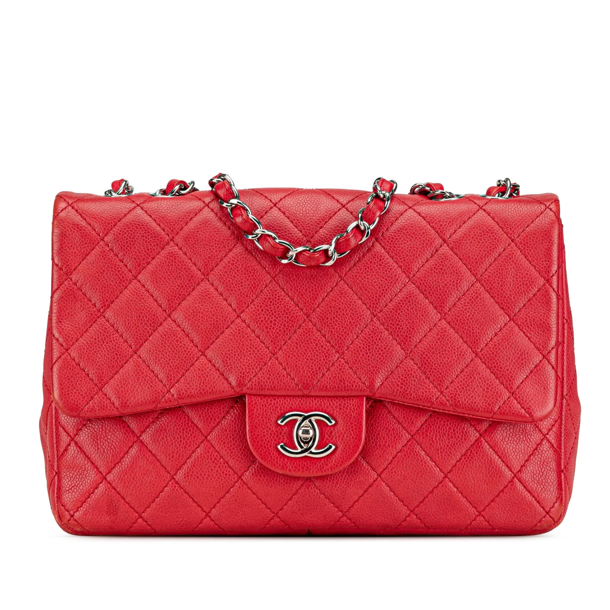 Product Details: Red Chanel Jumbo Classic Caviar Single Flap Shoulder Bag. This shoulder bag features a quilted caviar leather body, leather woven chain straps, a top flap with CC turn-lock closure, an exterior back slip pocket, and interior zip and slip pockets. 8.5" L x 11.4" W x 3.3" D, 12.2" drop. Serial number 12916869.