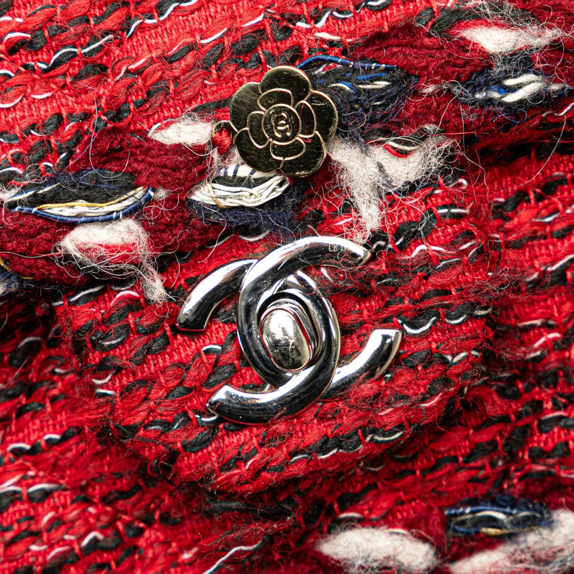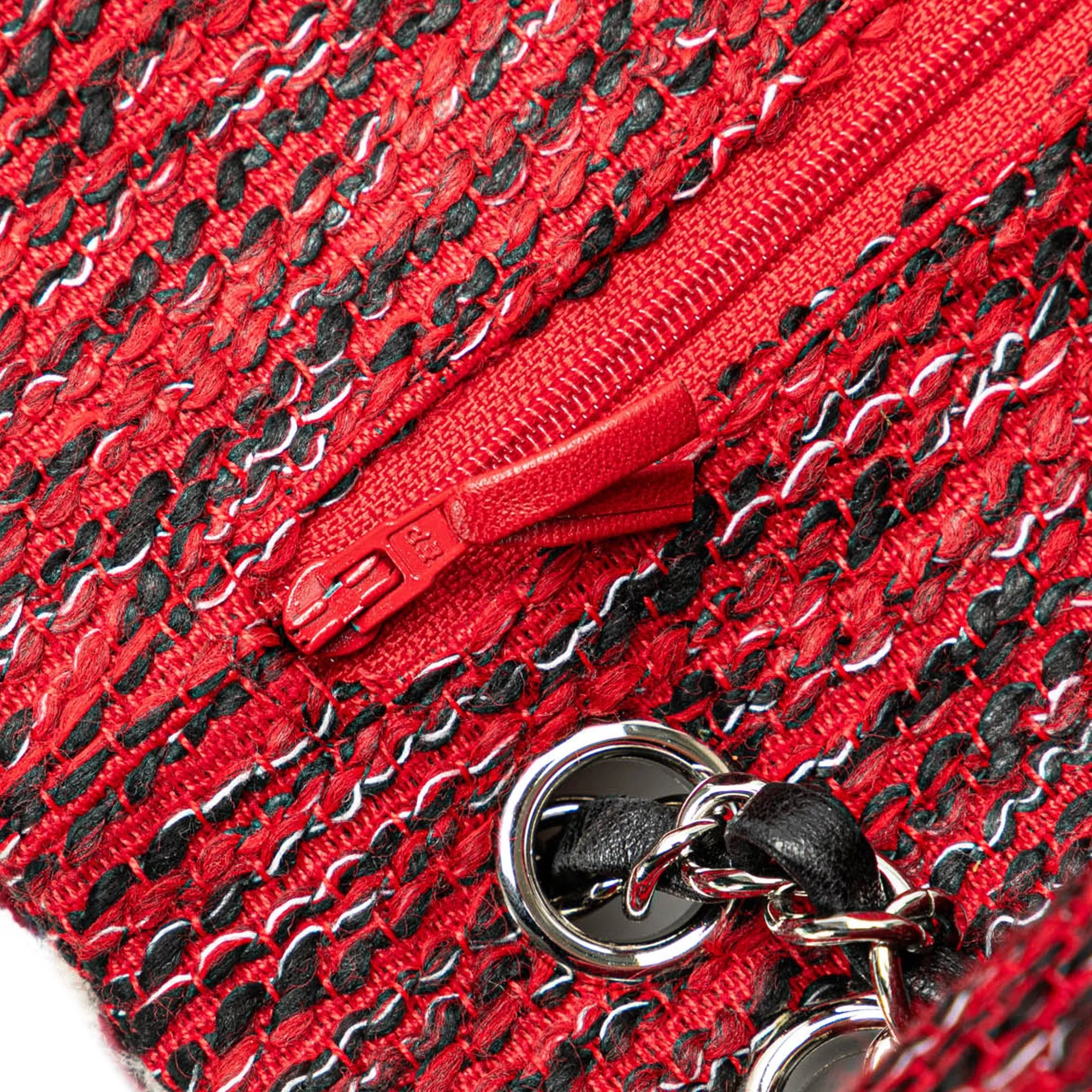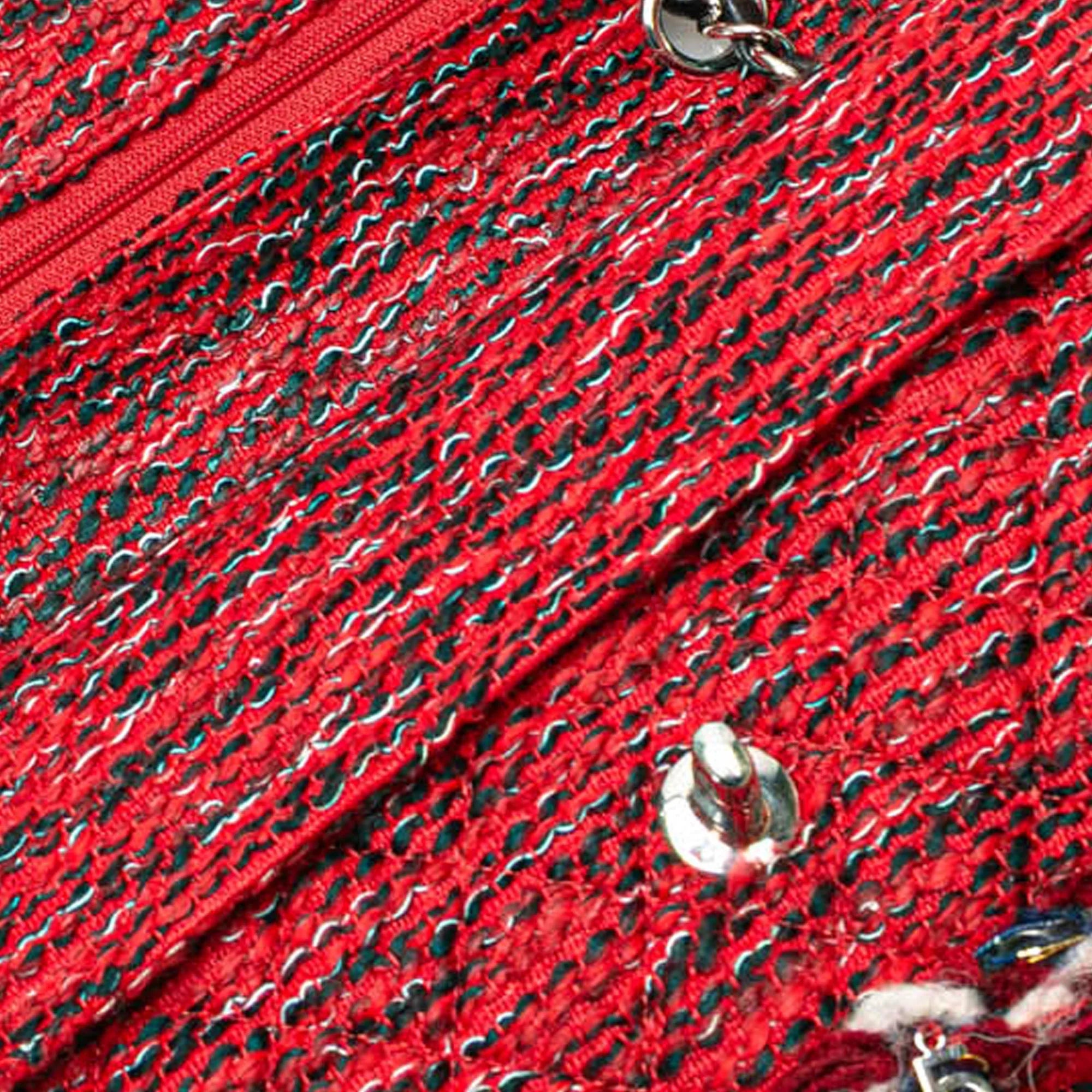 Product Details: Red Chanel Medium Tweed Braided Charms Double Flap Shoulder Bag. This flap features a tweed body, leather woven chain shoulder straps, a double flap with twist lock closure, an exterior back slip pocket, and interior zip and slip pockets. 5.9" L x 9.8" W x 3.1" D. Serial number 24845965.