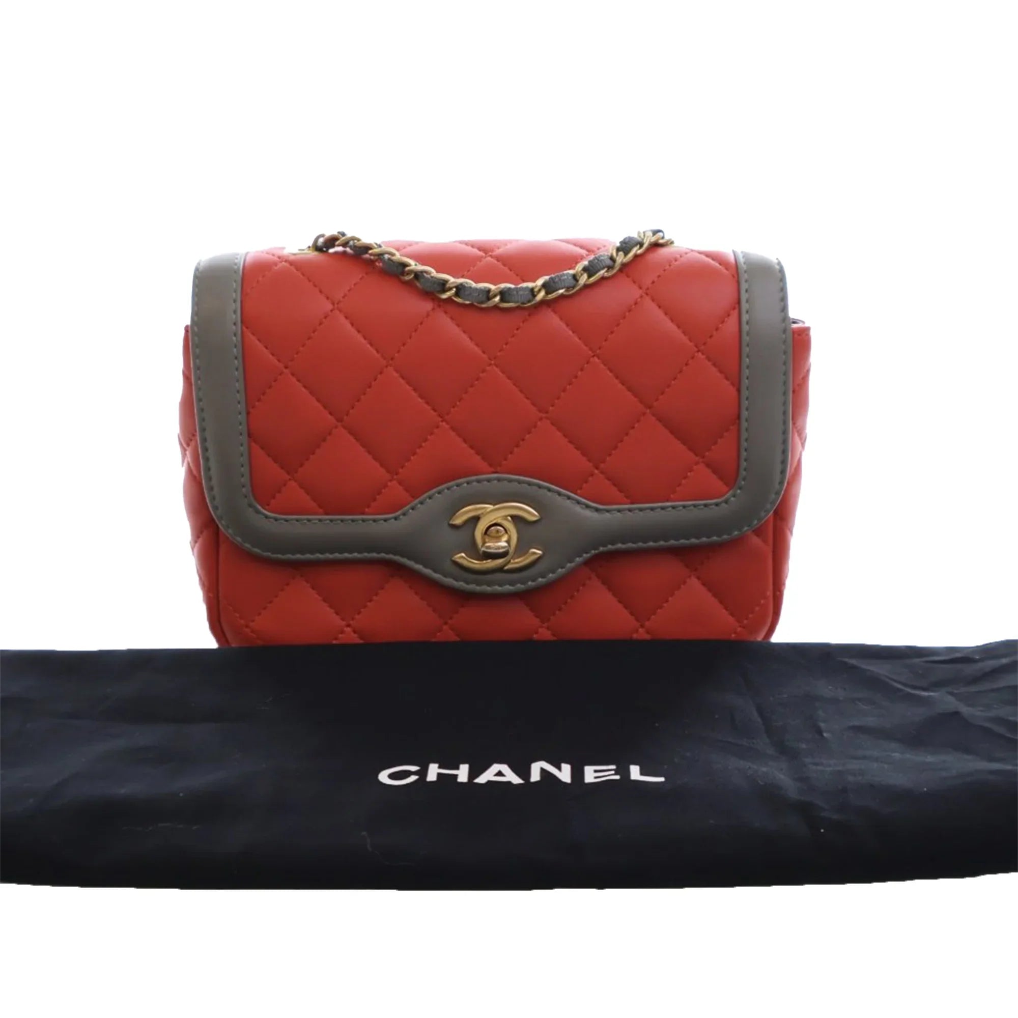 Product Details: Red Chanel Mini Quilted Lambskin Two Tone Day Flap Crossbody Bag. This crossbody bag features a quilted leather body, a leather woven chain strap, a front flap with turn lock closure, an exterior back slip pocket, and an interior zip pocket. 5.5" L x 7.1" W x 2.2" D.