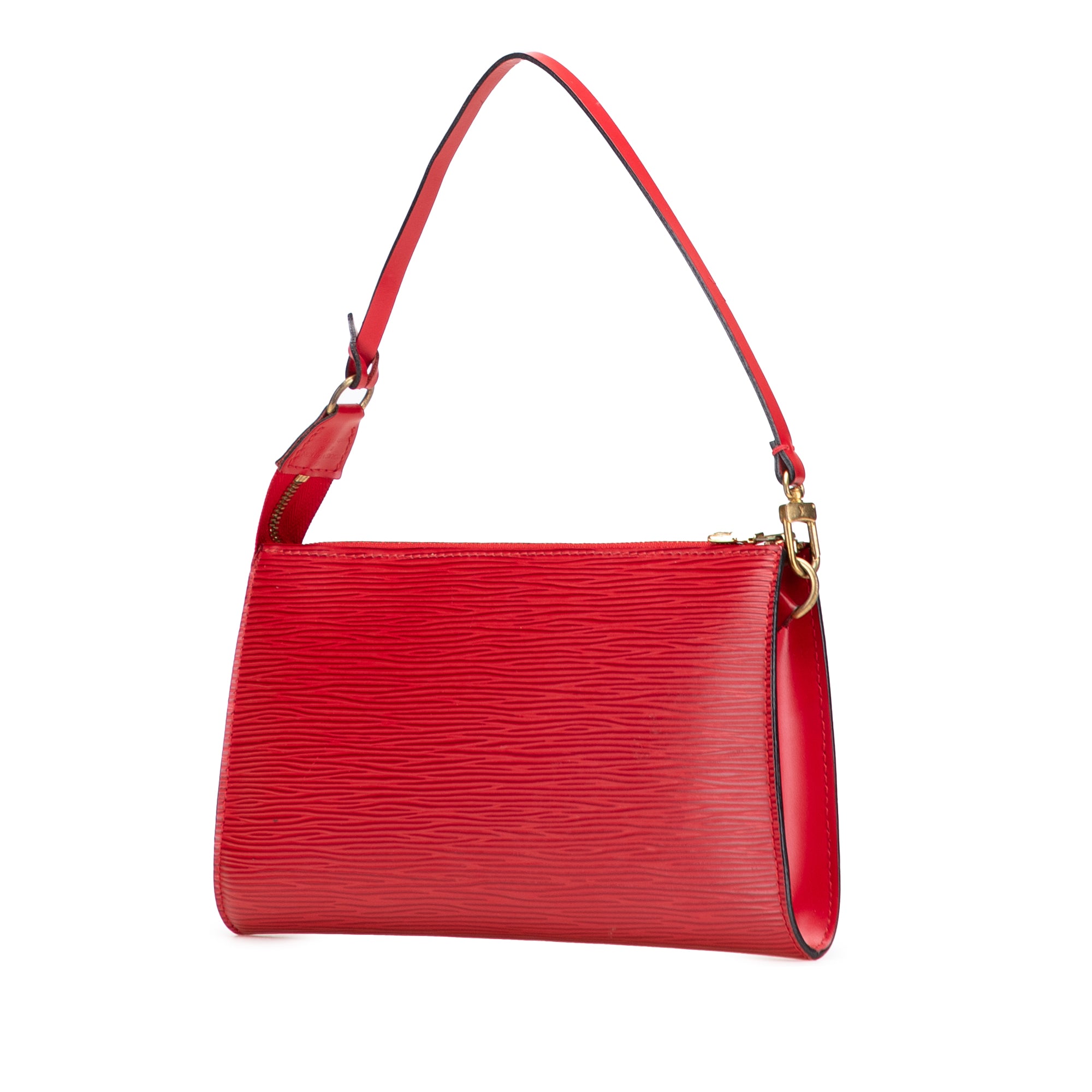Product Details: Red Louis Vuitton Epi Pochette Accessoires Shoulder Bag. The Pochette Accessoires features an epi leather body, a flat leather shoulder strap, and a top zip closure. 5.1" L x 9.4" W x 1.2" D. Serial number AR0011.
