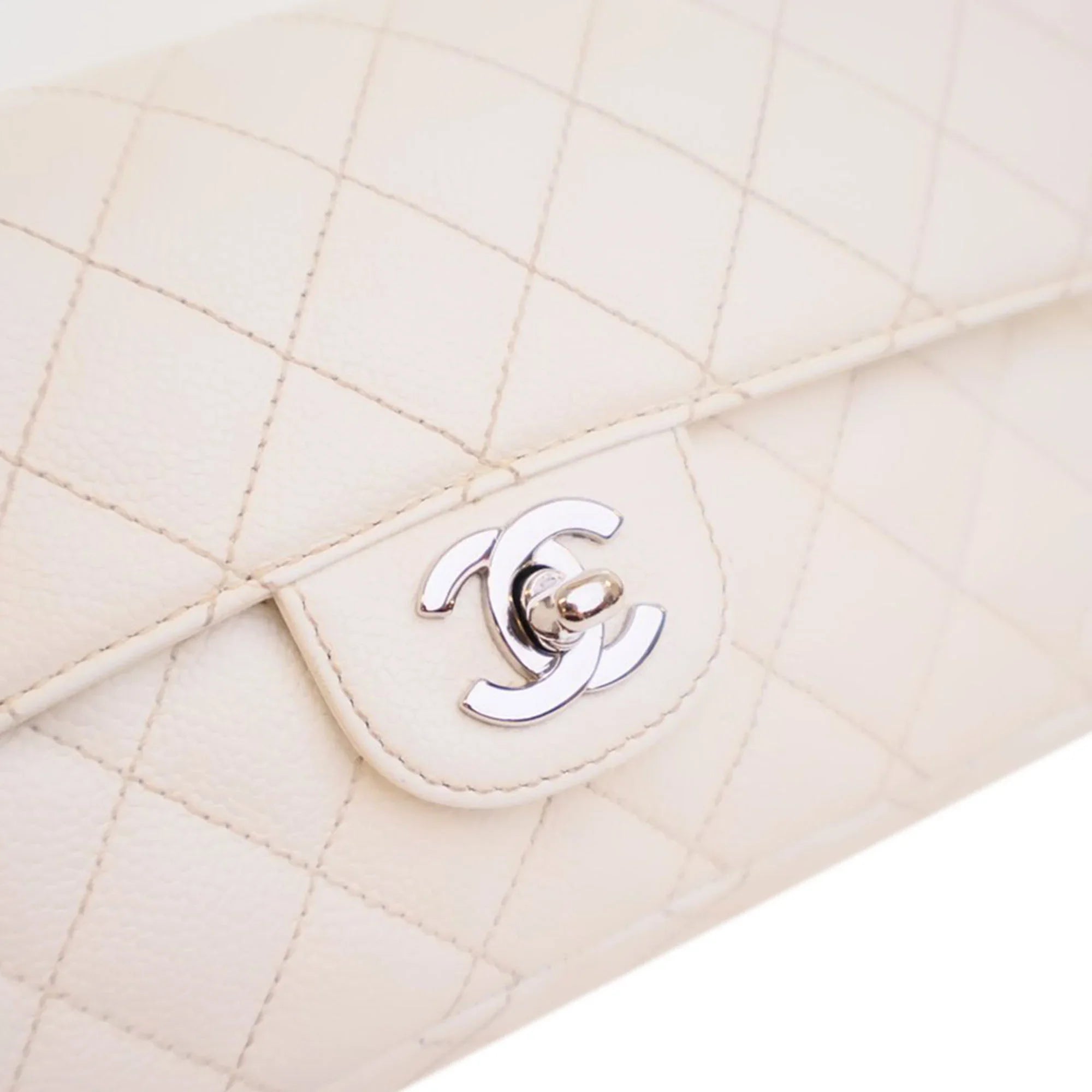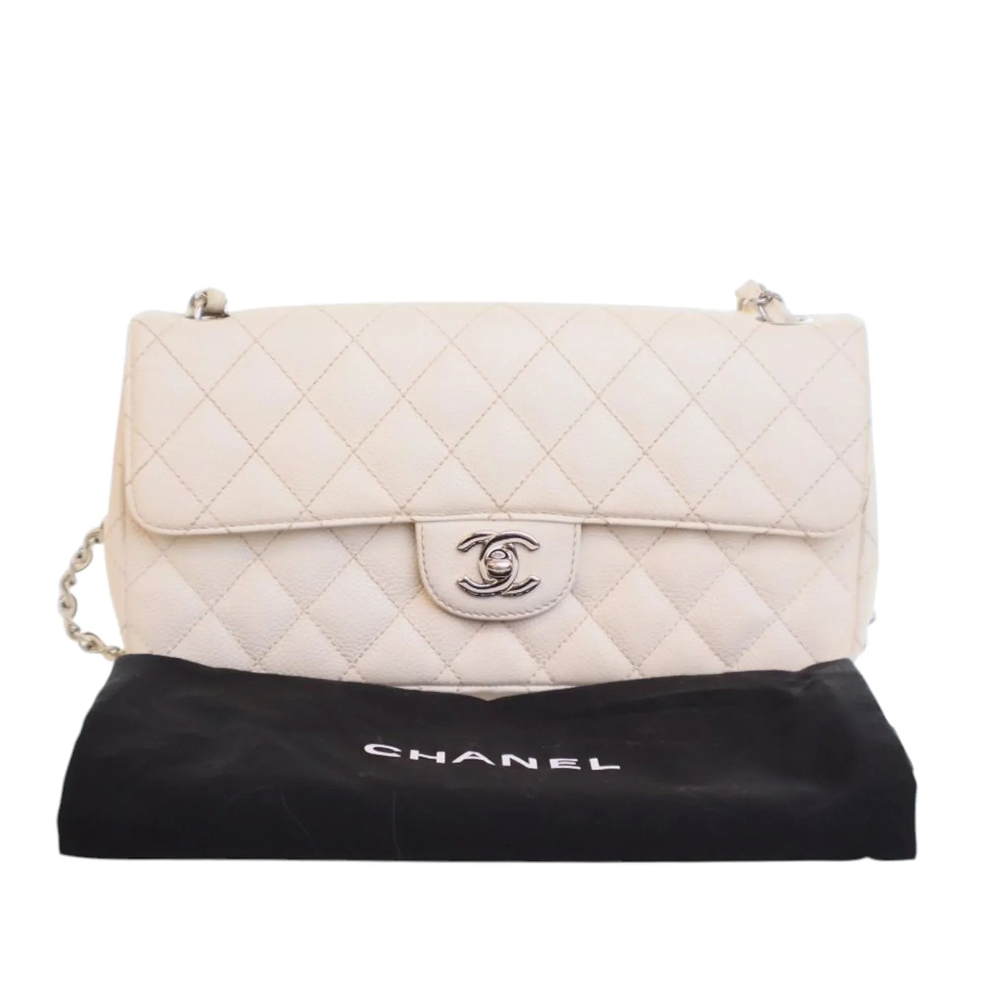 Product Details: White Chanel Classic Caviar East West Single Flap Shoulder Bag. The East West Flap features a quilted caviar leather body, a leather woven chain strap, a front flap with a CC turn lock closure, and interior slip pockets. 4.7" L x 9.8" W x 2" D.