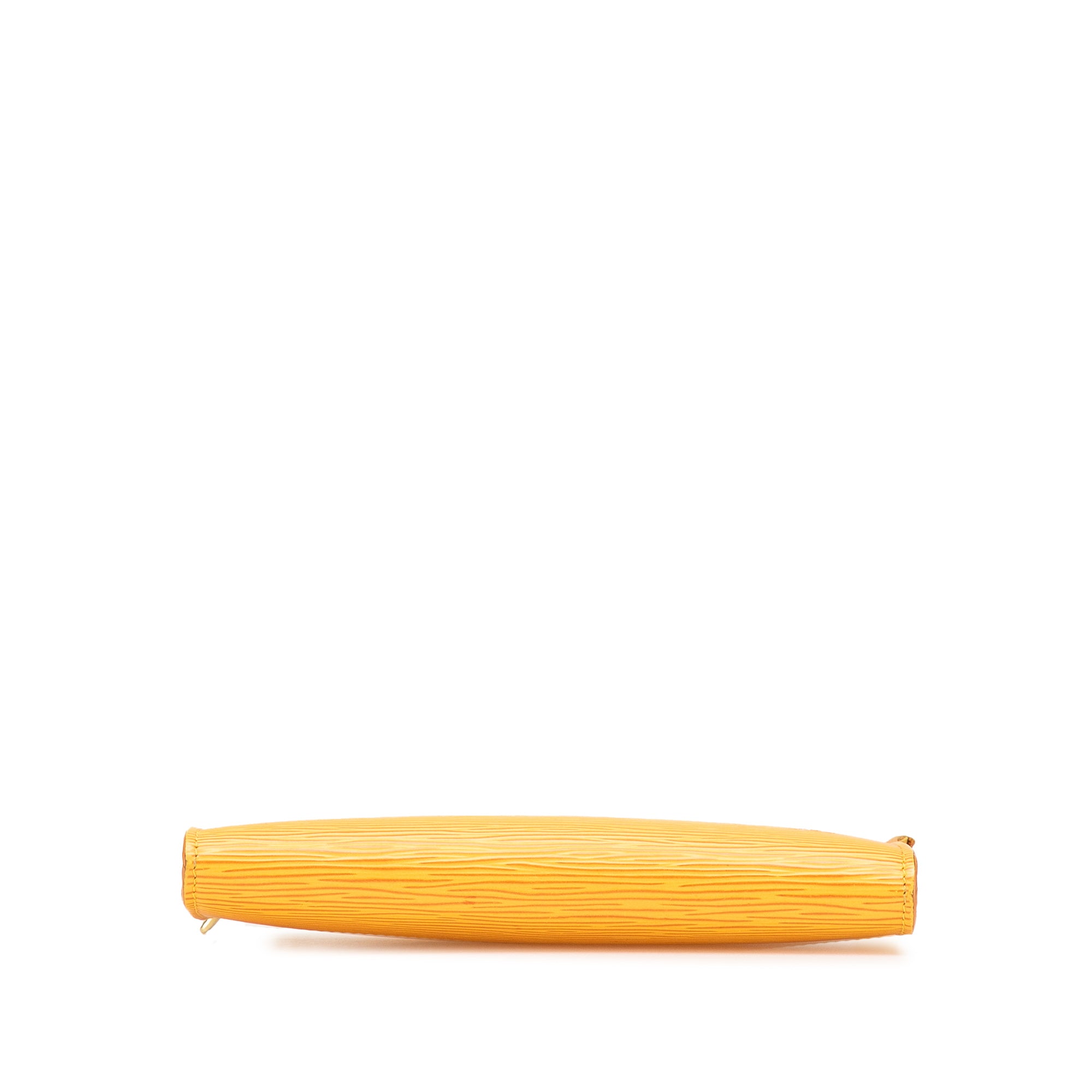 Product Details: Yellow Louis Vuitton Epi Pochette Accessoires Shoulder Bag. The Pochette Accessoires features an epi leather body, a flat leather shoulder strap, and a top zip closure. The edge coat of the strap was repainted. 4.7" L x 8.3" W x 0.8" D. Serial number AR0935.