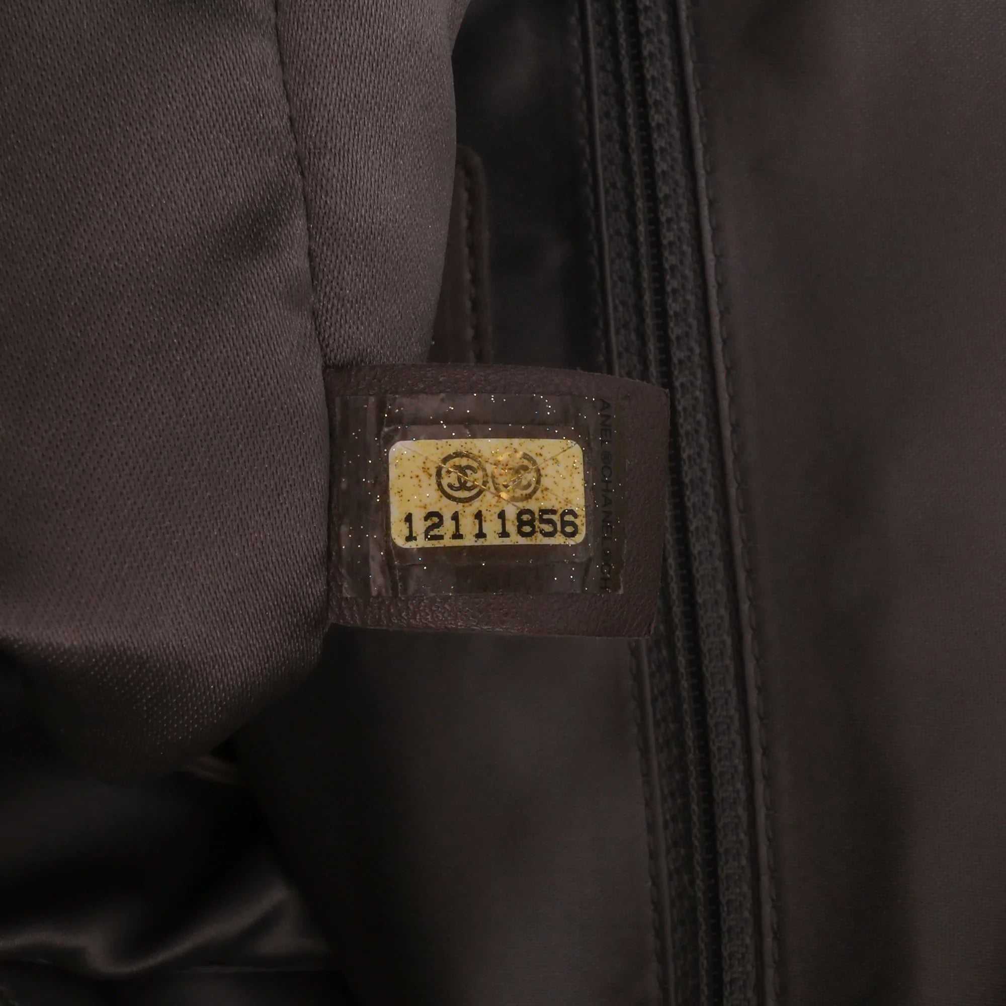 Product Details: Gold Chanel Perforated Crackled Metallic Calfskin Drill Tote. This tote bag features a perforated leather body, chain link straps, a top flap with a twist lock closure, and interior zip and slip pockets. 14.2" L x 12.8" W x 2.8" D. Serial number 12111856.
