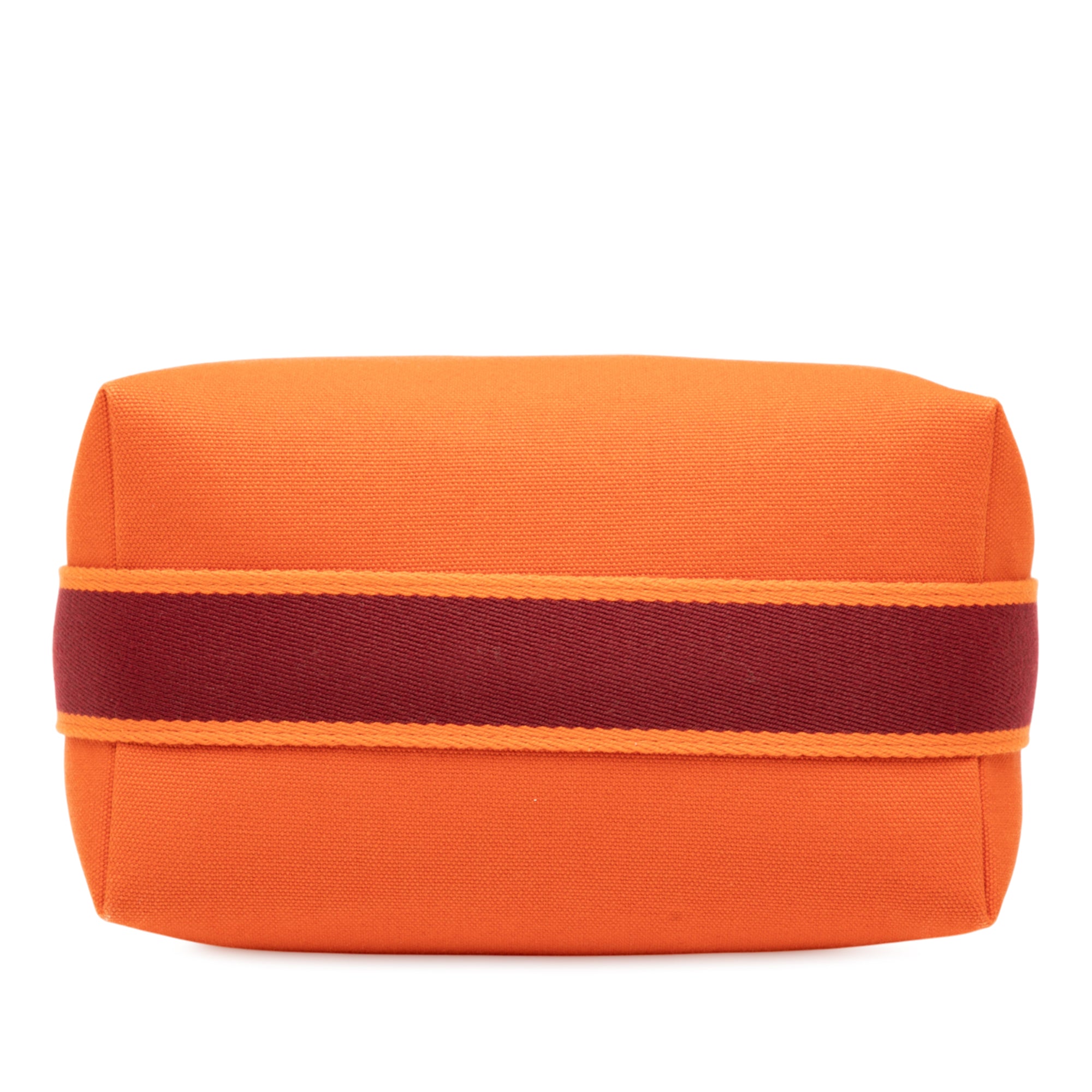 Product Details: Orange Hermès Small Canvas Bride A Brac Case. The Bride-A-Brac features a canvas body, a flat handle, a top zip closure, and interior slip pockets. 3.7" L x 8.1" W x 4.7" D, 2.8" drop.