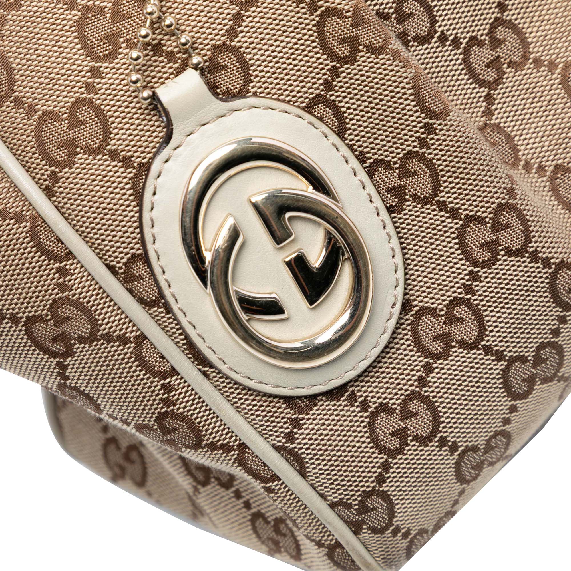 Product Details: Beige Gucci Medium GG Canvas Sukey Tote. The Sukey tote bag features a canvas body with leather trim, rolled leather handles, an open top with magnetic closure, and an interior zip pocket. 11.8" L x 13.4" W x 3" D, 6.7" drop. Serial number 211944 200047.