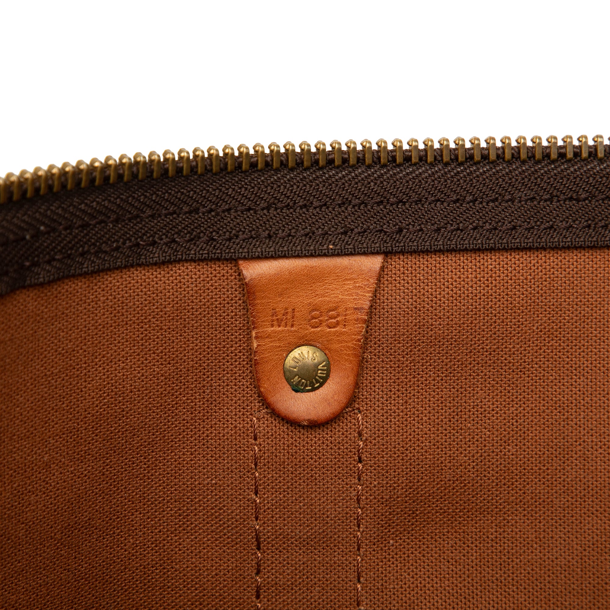 Product Details: Brown Louis Vuitton Monogram Keepall 55 Travel Bag. The Keepall 55 features a monogram canvas body with vachetta leather trim, rolled vachetta leather handles and a top zip closure. 11.4" L x 22" W x 9.4" D, 4.3" drop. Serial number MI 881.