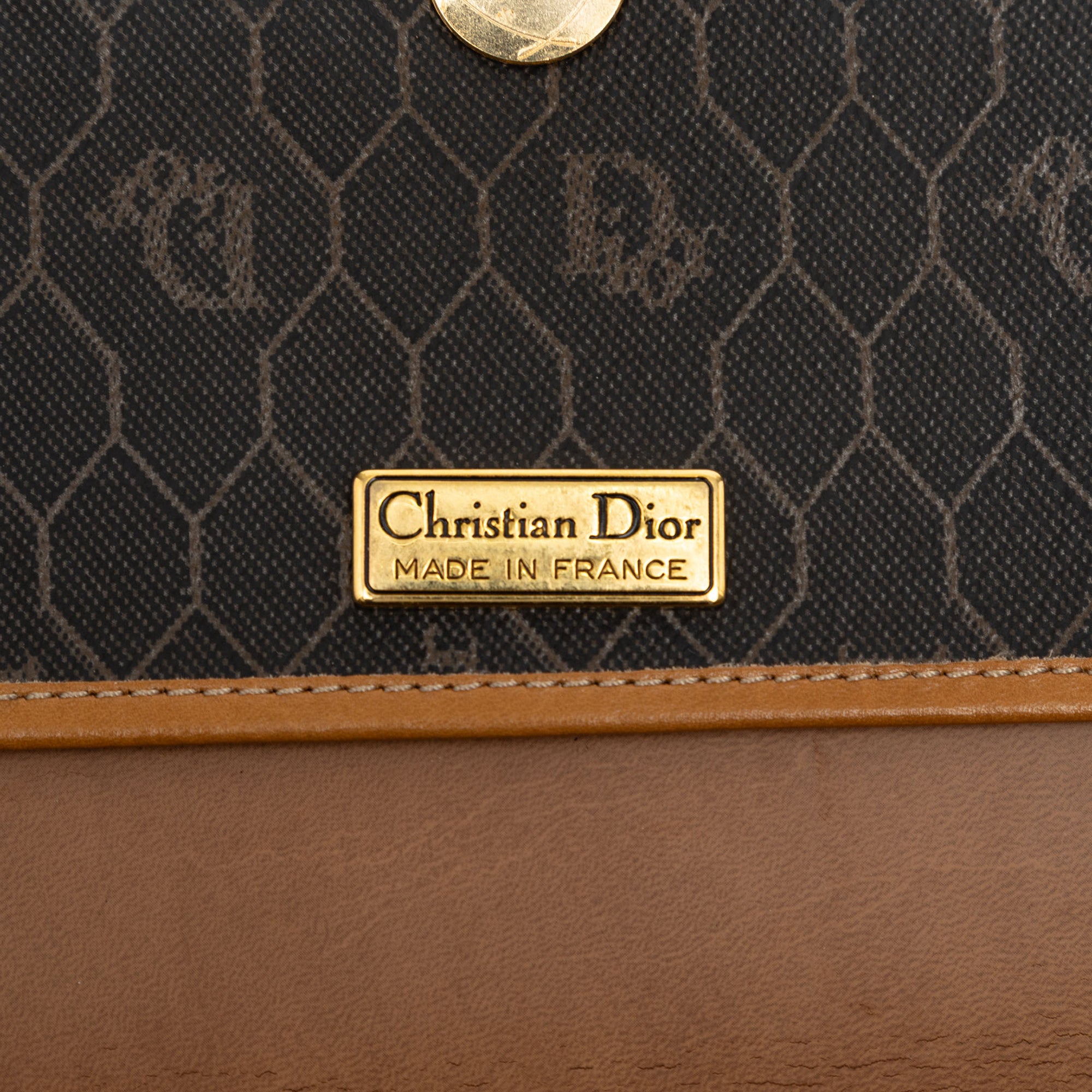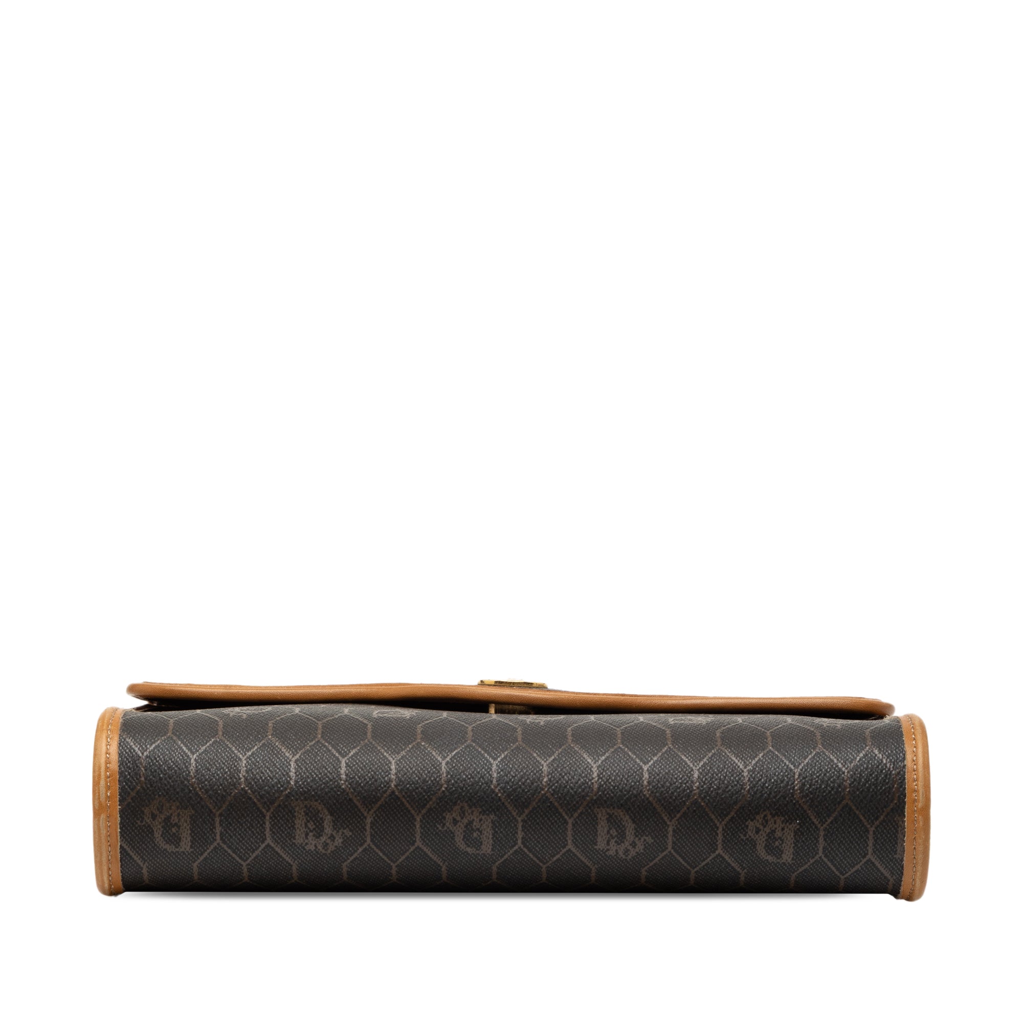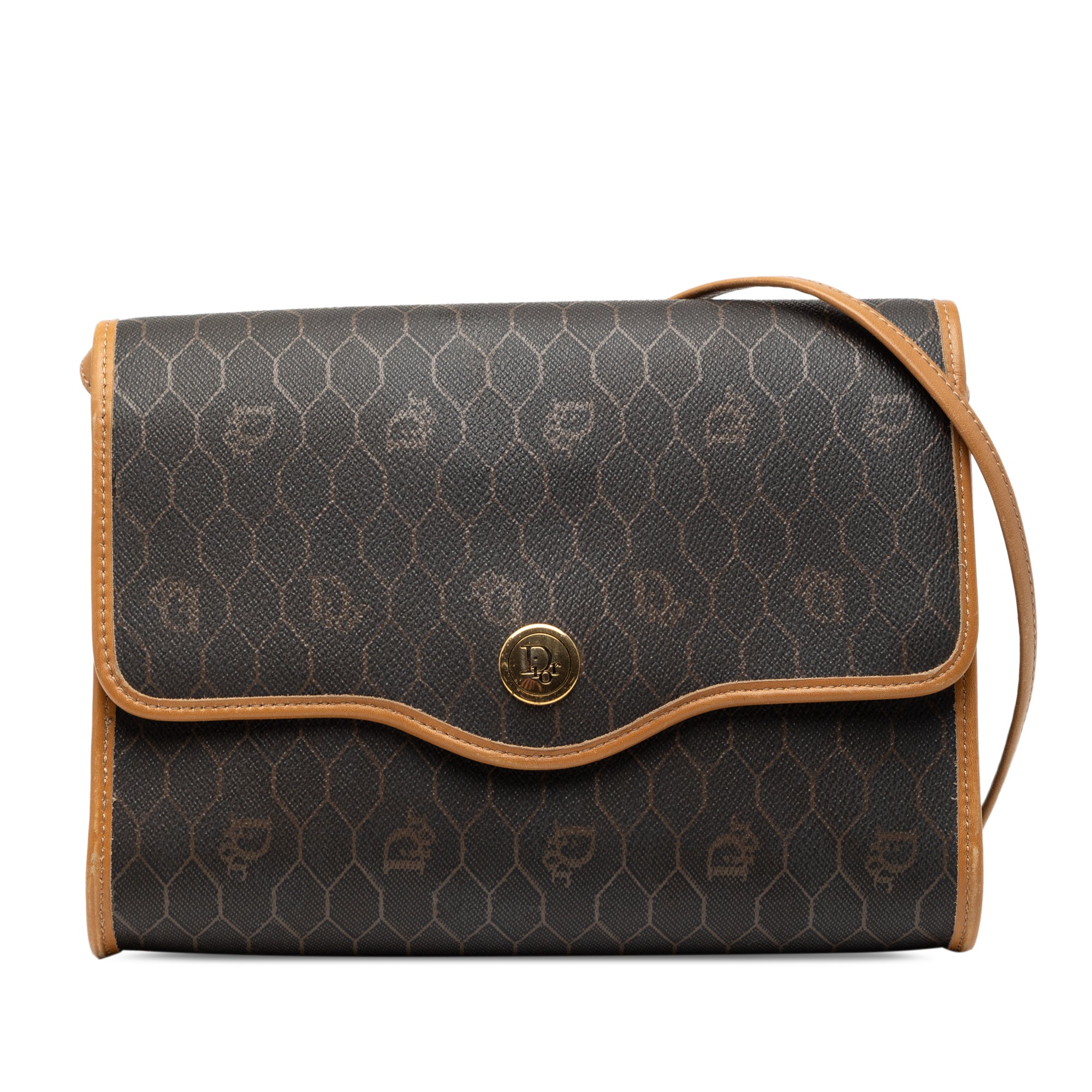Product Details: Black Dior Honeycomb Coated Canvas Crossbody. This crossbody bag features a coated canvas body with leather trim, a flat leather strap, a front flap with magnetic snap closure, and an interior slip pocket. 6.3" L x 8.7" W x 2" D.