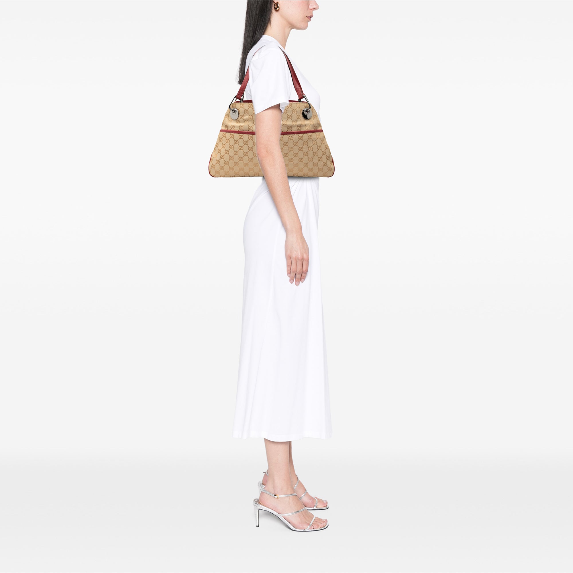 Product Details: Tan Gucci GG Canvas Eclipse Shoulder Bag. The Eclipse shoulder bag features a canvas body with leather trim, an exterior front slip pocket, flat leather straps, an open top with a magnetic closure, and interior zip and slip pockets. 9.4" L x 15.4" W x 2.8" D, 7.1" drop. Serial number 121023.204991.