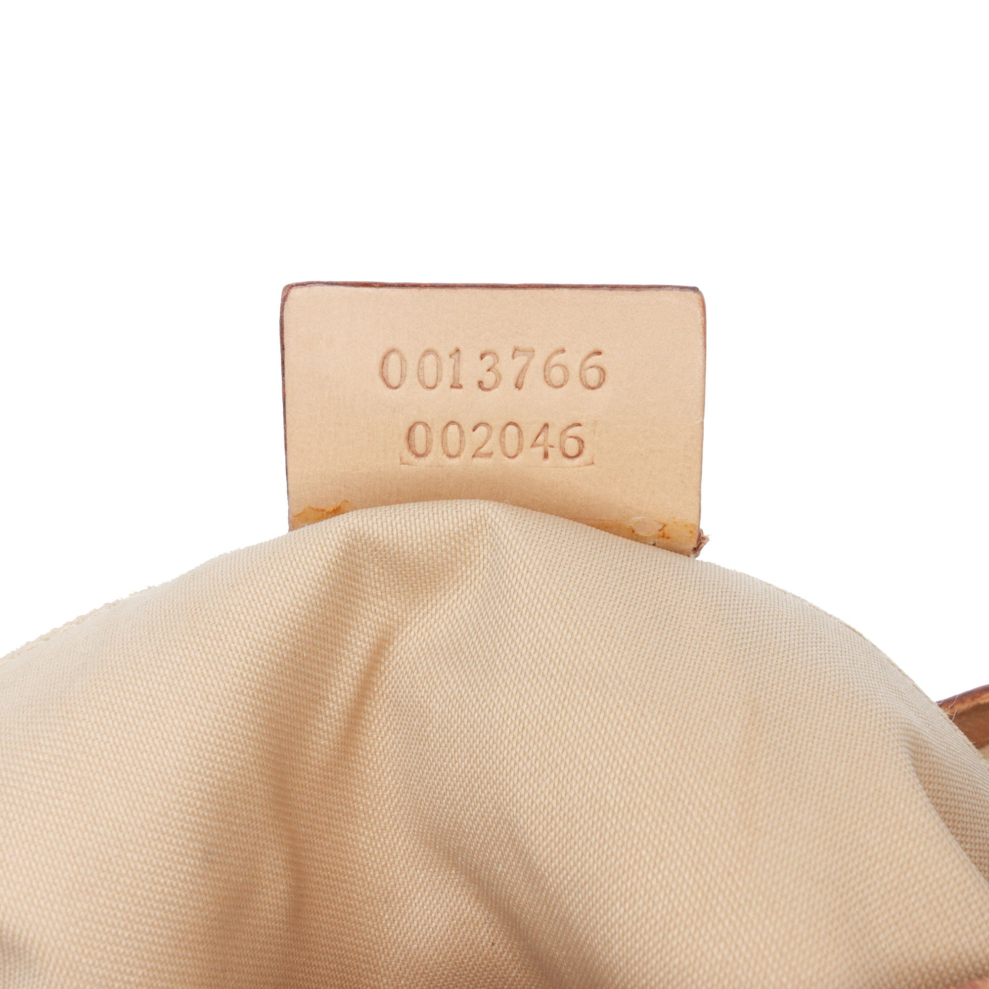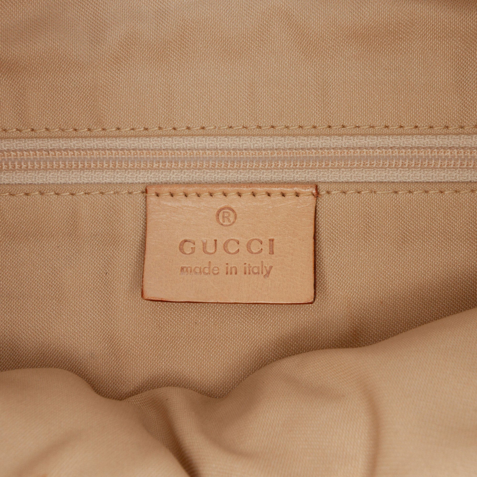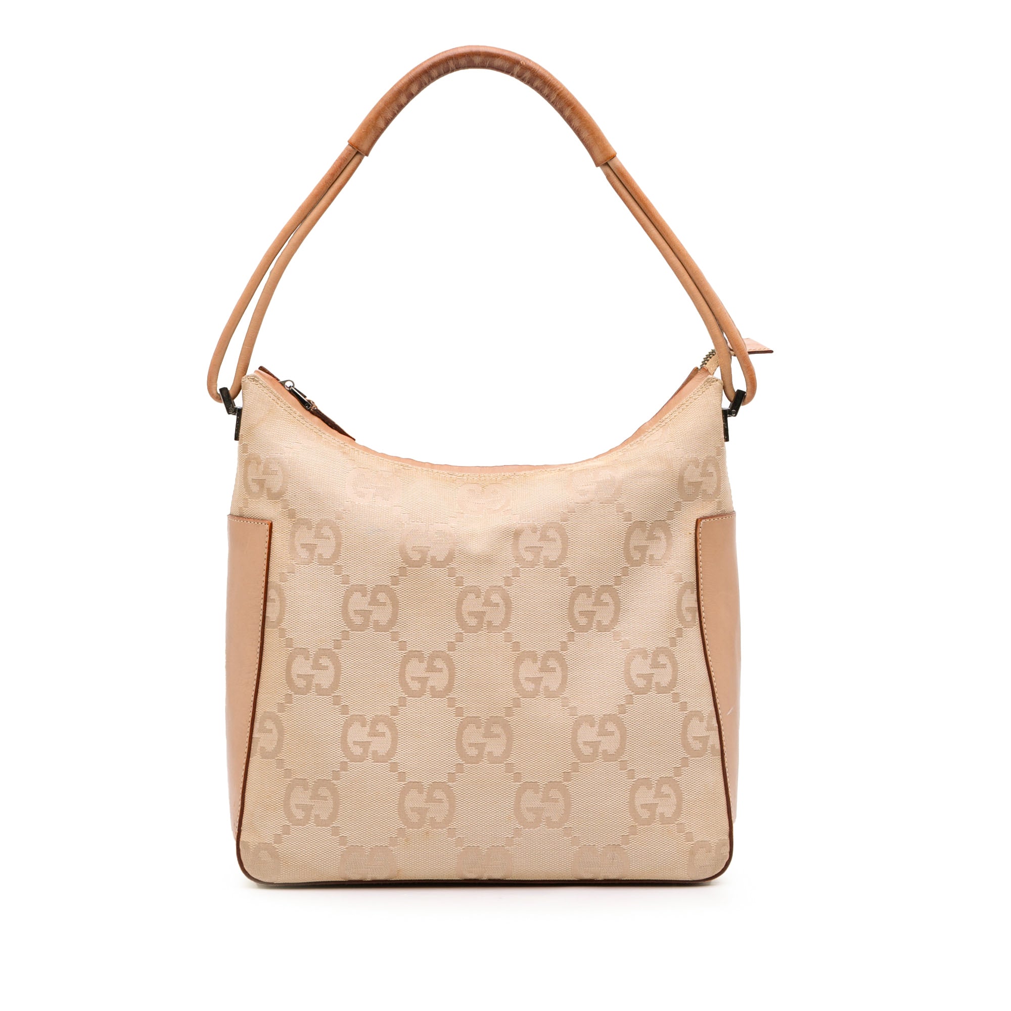 Product Details: Beige Gucci Jumbo GG Canvas Shoulder Bag. This shoulder bag features a canvas body with leather trim , a flat leather shoulder strap, a 2 way top zip closure, and an interior zip pocket. 10.6" L x 10.2" W x 3.7" D. Serial number 001 3766 002046.