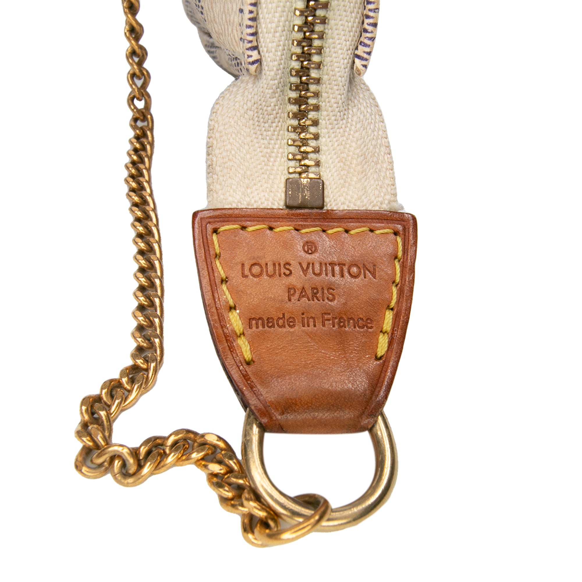 Product Details: White Louis Vuitton Damier Azur Mini Pochette Accessoires Handbag. The Mini Pochette Accessoires features a damier azur canvas body, a detachable chain strap, and a top zip closure. 3.7" L x 5.7" W x 1.2" D, 6.7" drop. Serial number DU3101.
