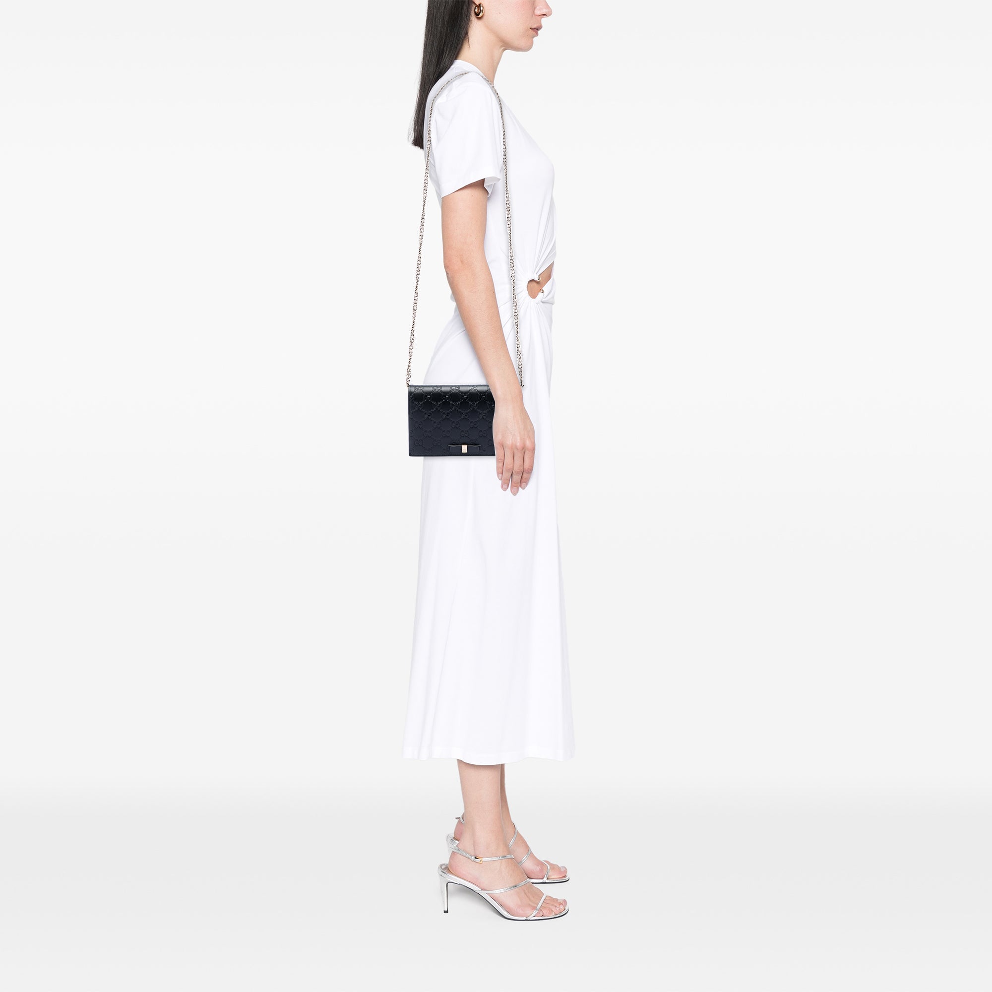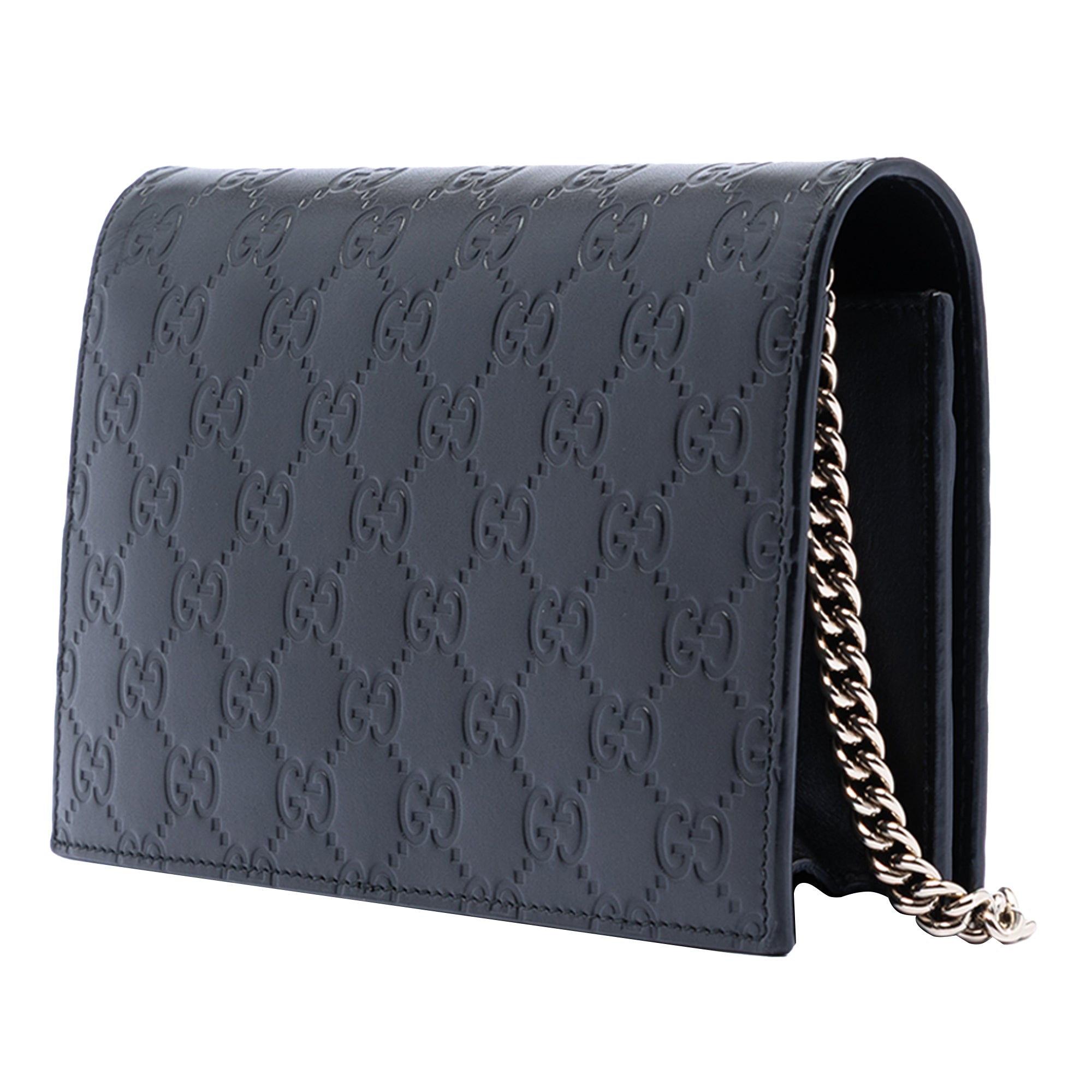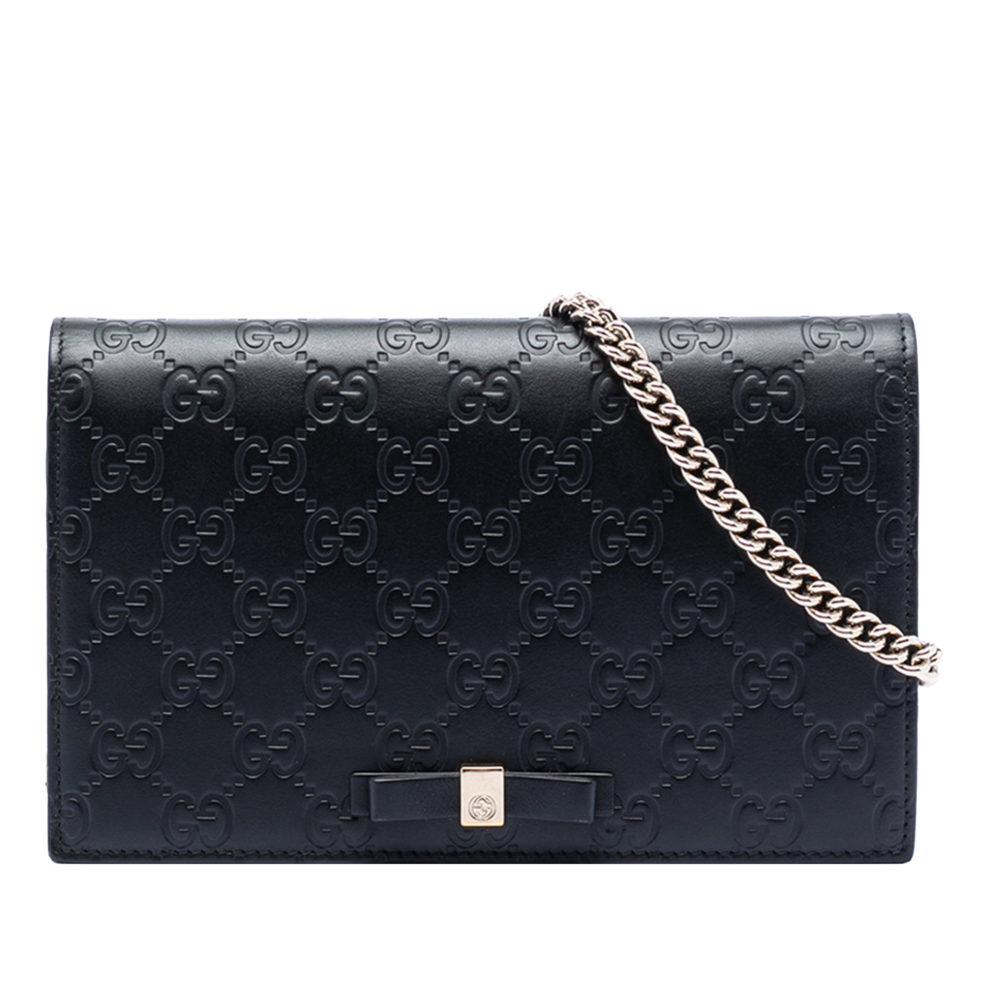Product Details: Black Gucci Mini Guccissima Bow Signature Wallet On Chain Crossbody Bag. This wallet on chain features an embossed leather body, a chain link shoulder strap, a flap with magnetic snap closure, and interior zip and slip pockets. 5.1" L x 7.9" W x 1.6" D. Serial number 431408·0416·.