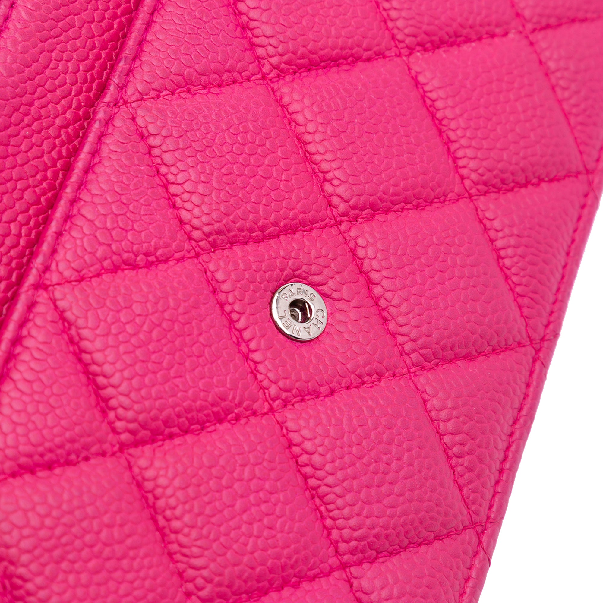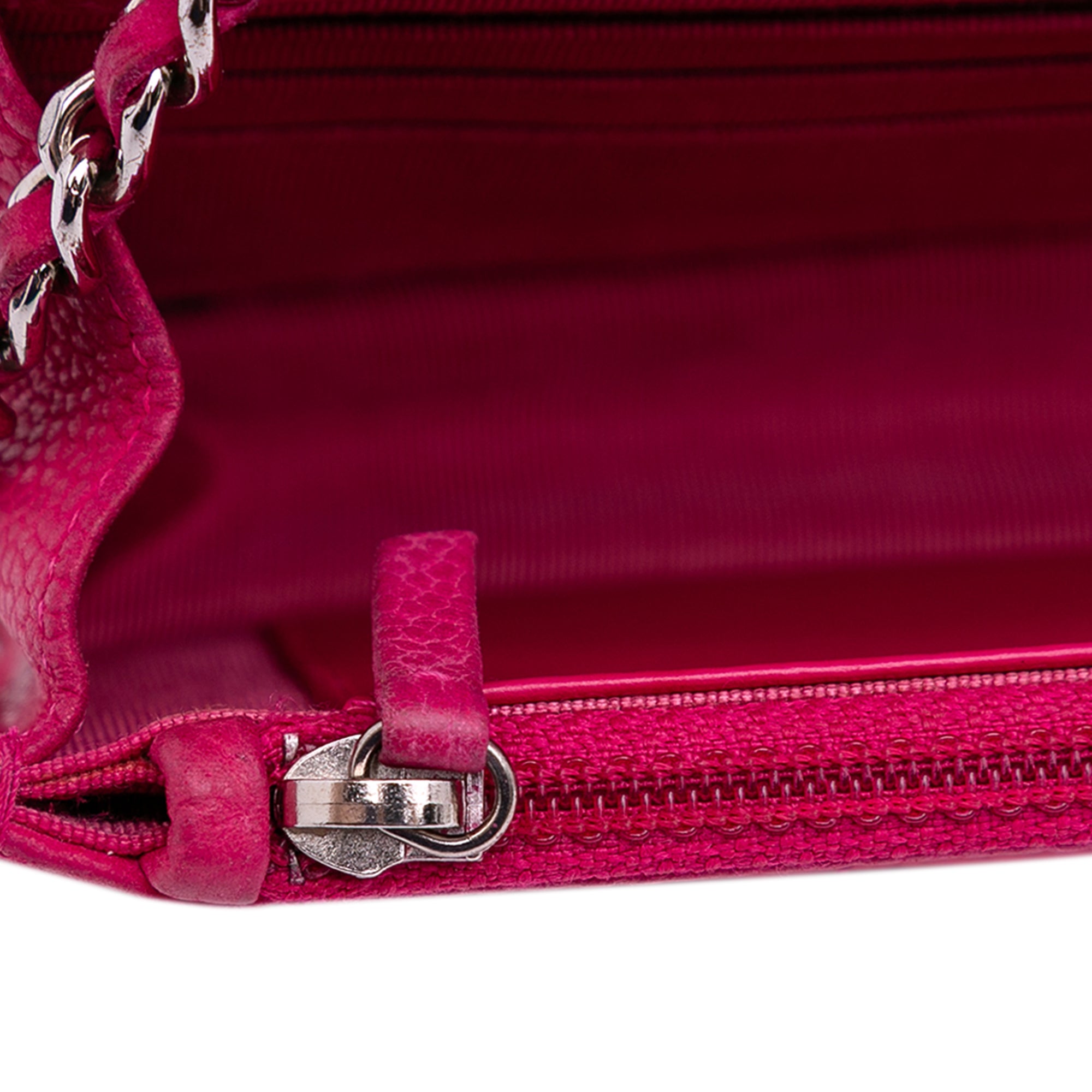 Product Details: Pink Chanel Classic Caviar Wallet On Chain Crossbody Bag. This wallet on chain features a quilted caviar leather body, a silver-tone woven chain strap, a front flap with magnetic snap closure, and interior zip and slip pockets. 4.7" L x 7.5" W x 1.5" D. Serial number 20352213.