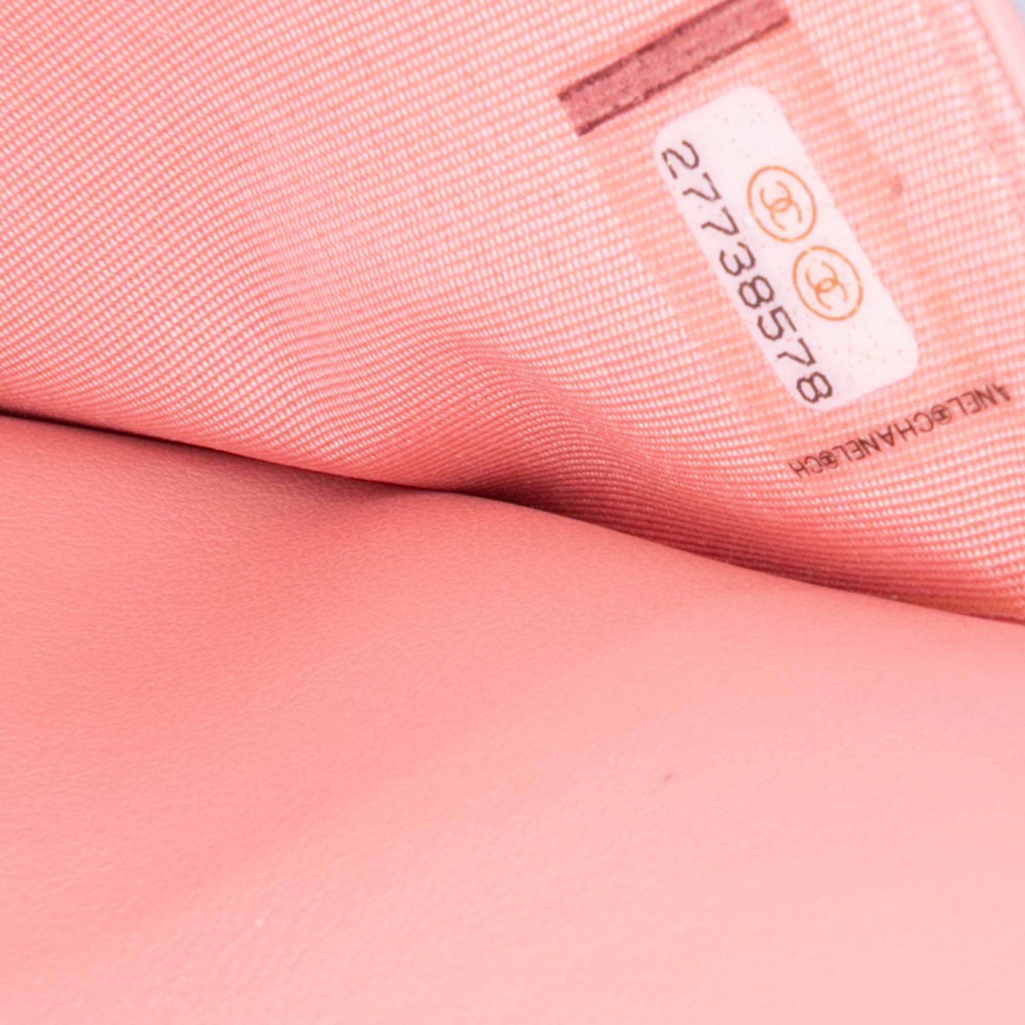 Product Details: Pink Chanel Quilted Caviar Boy Wallet on Chain Crossbody Bag. This wallet on chain features a quilted caviar body, a chain link strap with leather guard, a front flap with push lock closure, and interior zip and slip pockets. 5.3" L x 7.5" W x 1.6" D. Serial number 27738578.