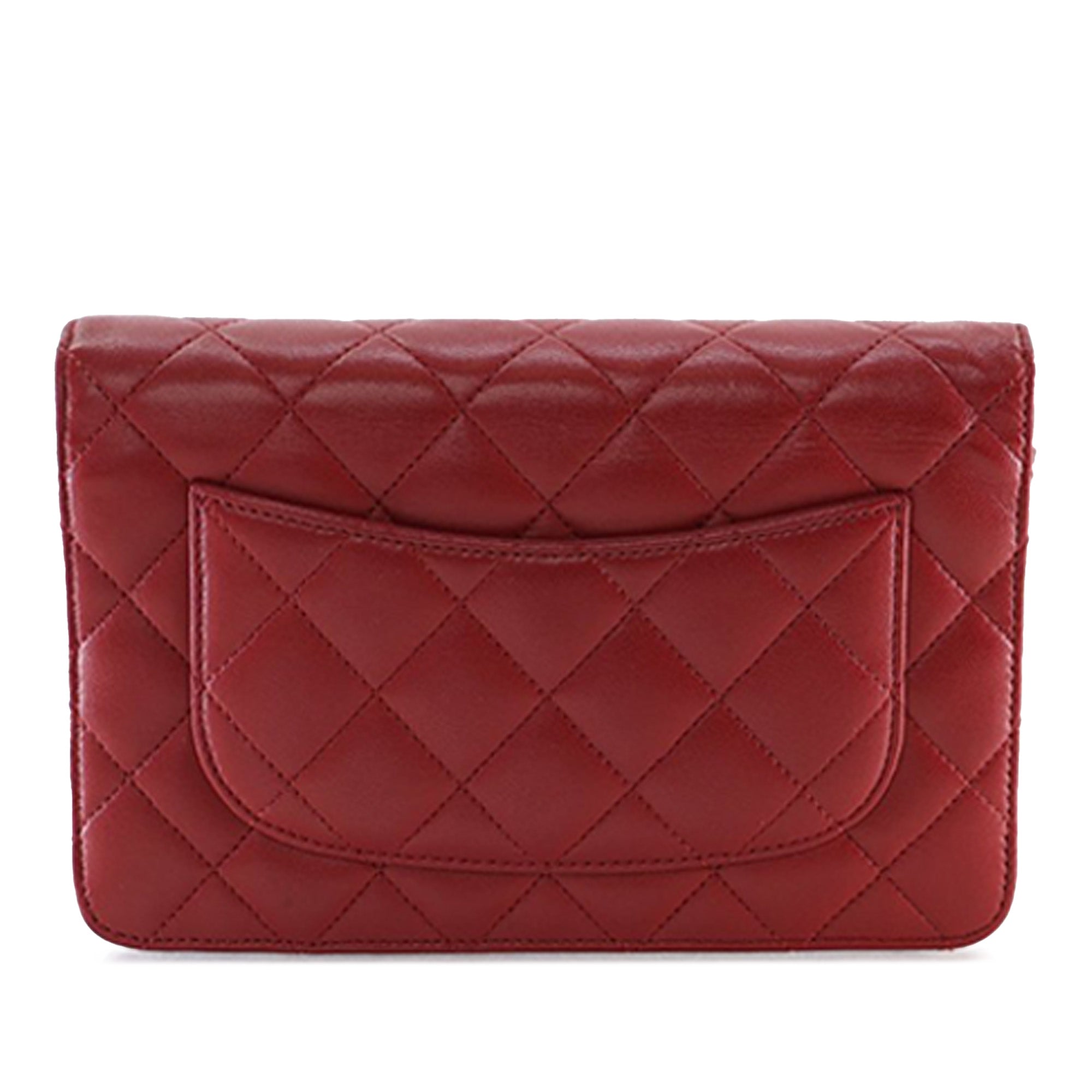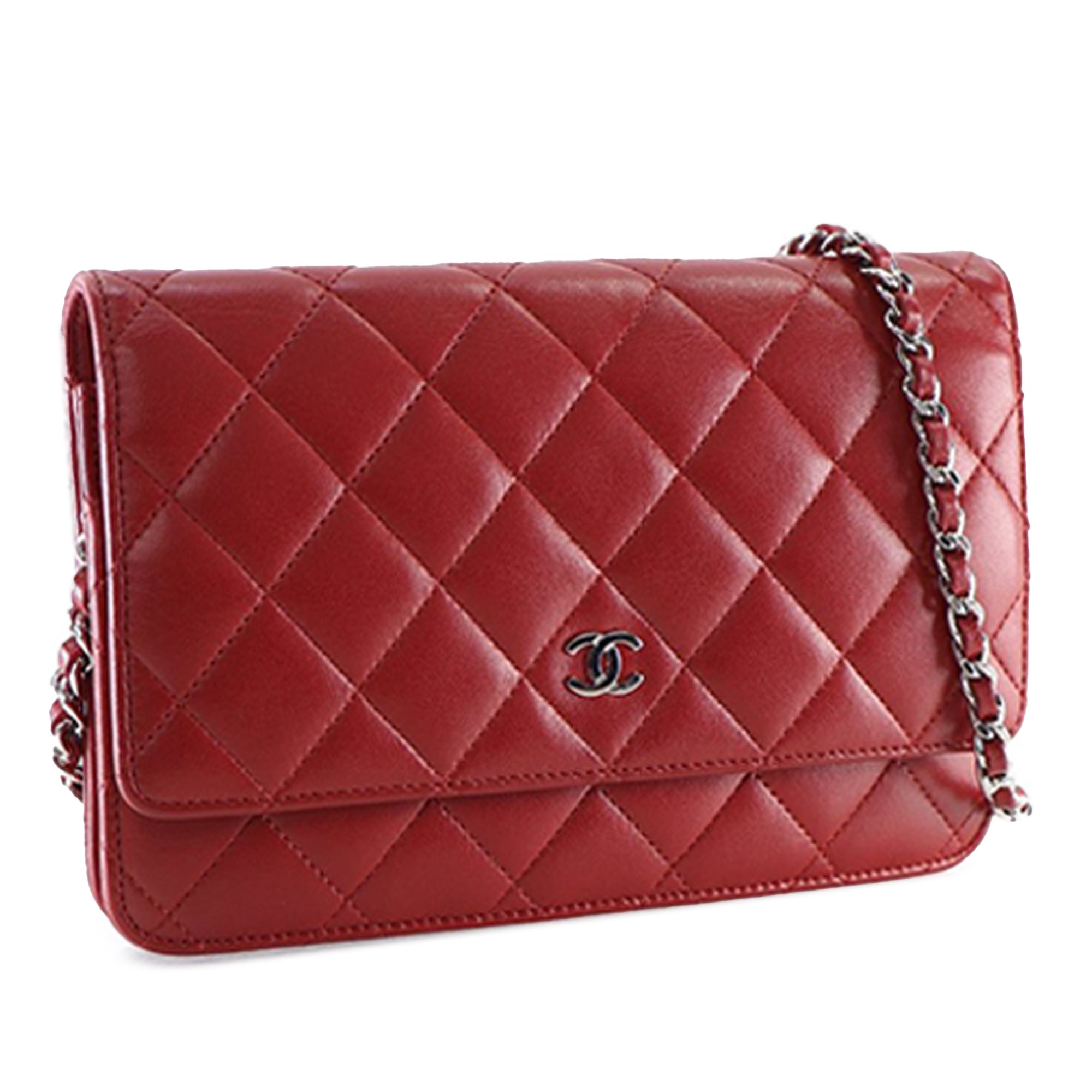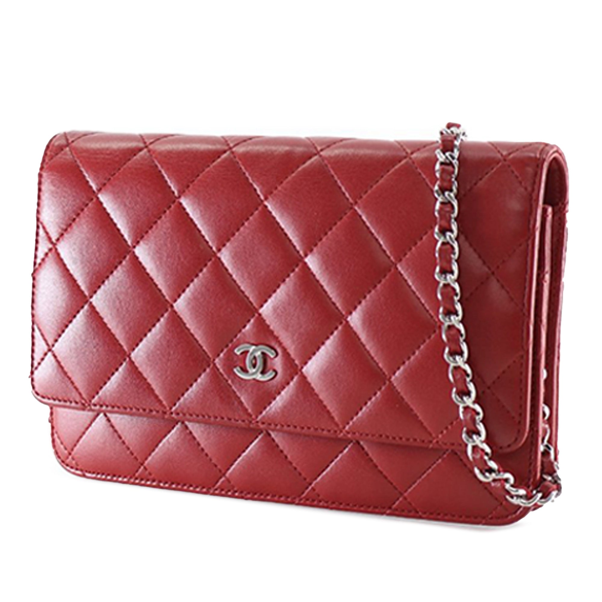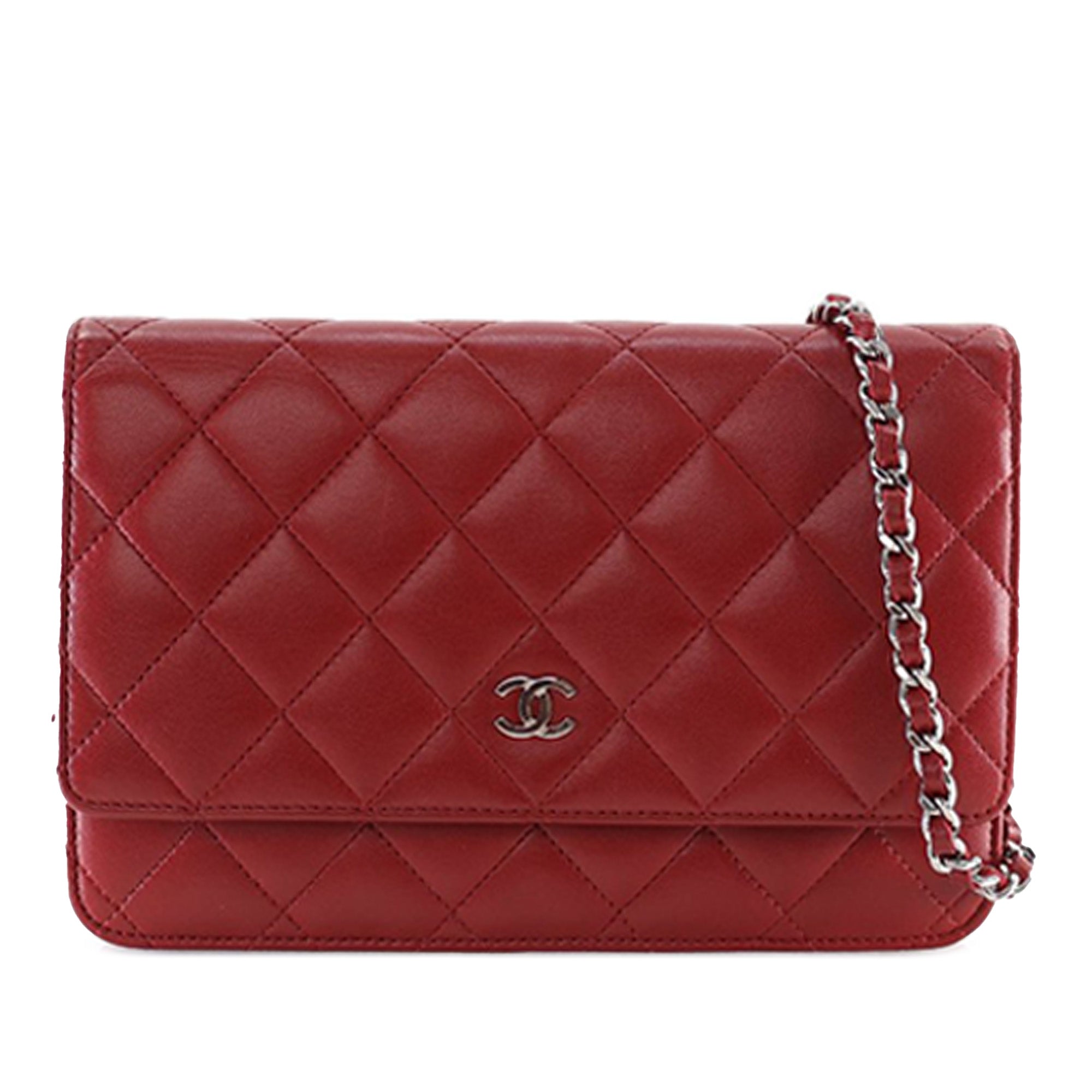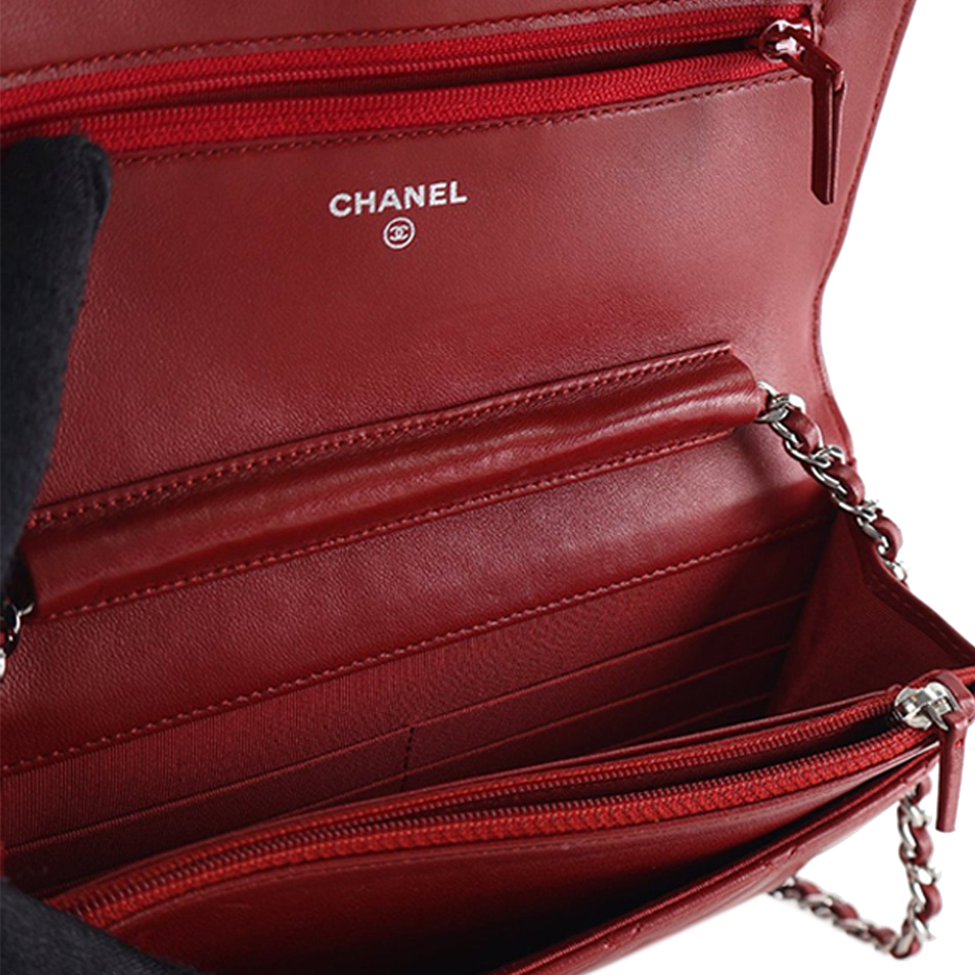 Product Details: Red Chanel CC Quilted Lambskin Wallet on Chain Crossbody Bag. This wallet on chain features a quilted lambskin leather body, a leather-woven chain link strap, a front flap with interlocking CC, an exterior back slip pocket, and interior zip and slip compartments. 5.1" L x 7.5" W x 1.6" D. Serial number 20660672.