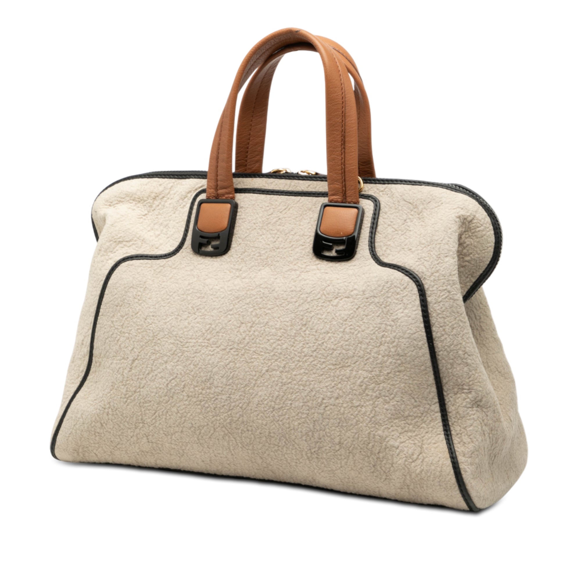 Product Details: Beige Fendi Large Canvas Chameleon Satchel. The Chameleon satchel features a canvas with leather trim body, flat leather handles, a top zip closure, and interior zip and slip pockets. 11" L x 15" W x 6.7" D, 4.7" drop. Serial number 8BL110 HJH 128 010.