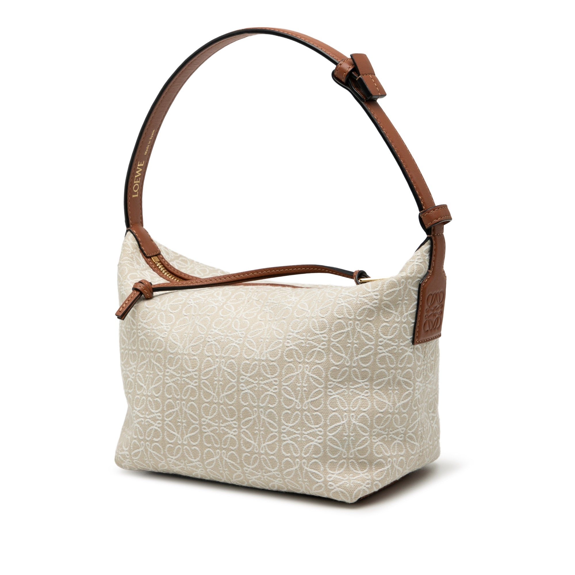 Product Details: Beige LOEWE Small Anagram Jacquard Cubi Bag. The Cubi bag features an anagram jacquard body with leather trim, a flat leather handle, and a top zip closure. 6.7" L x 7.1" W x 5.1" D, 5.9" drop. Serial number 522304.