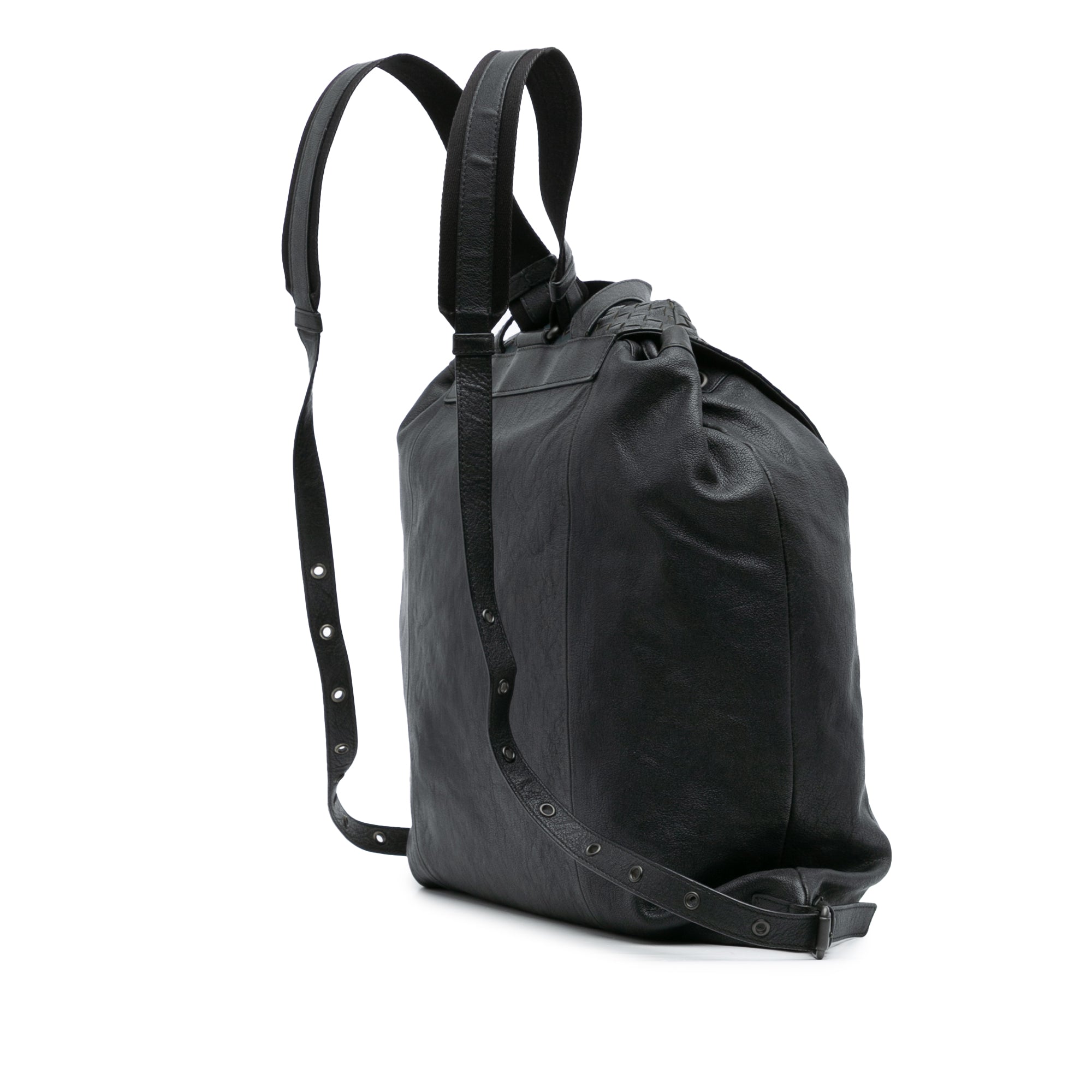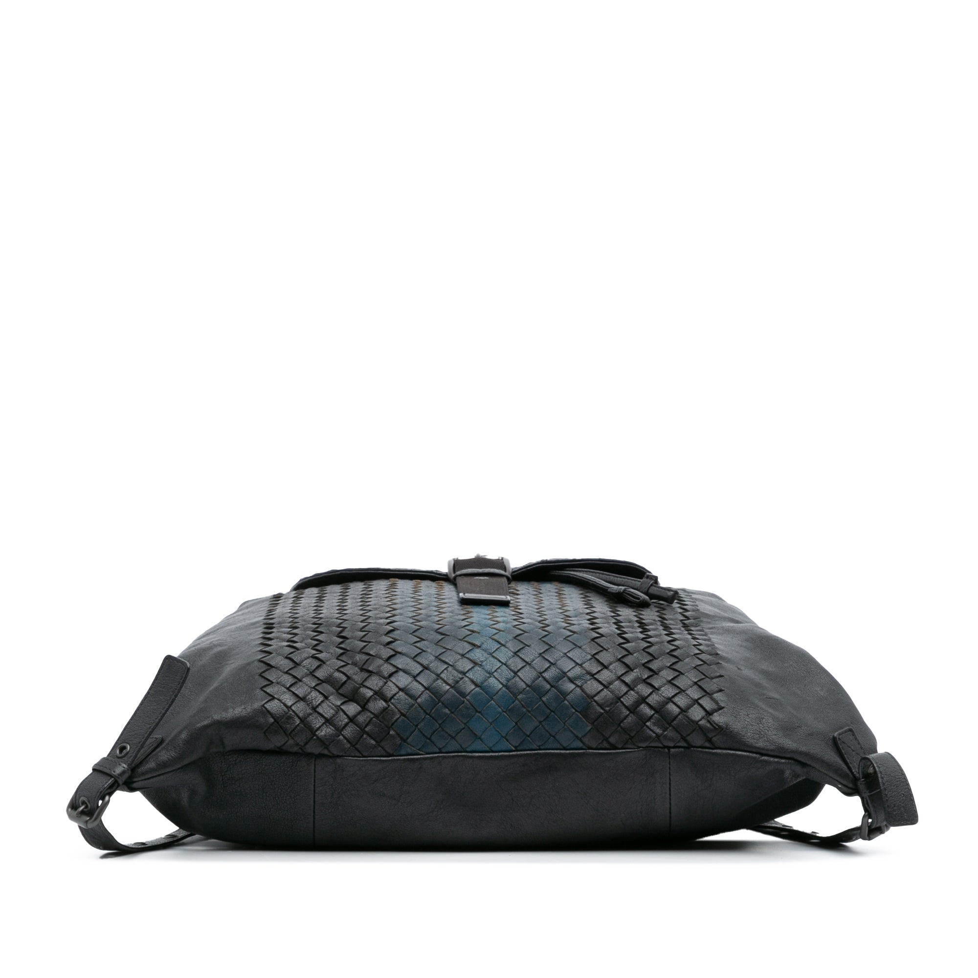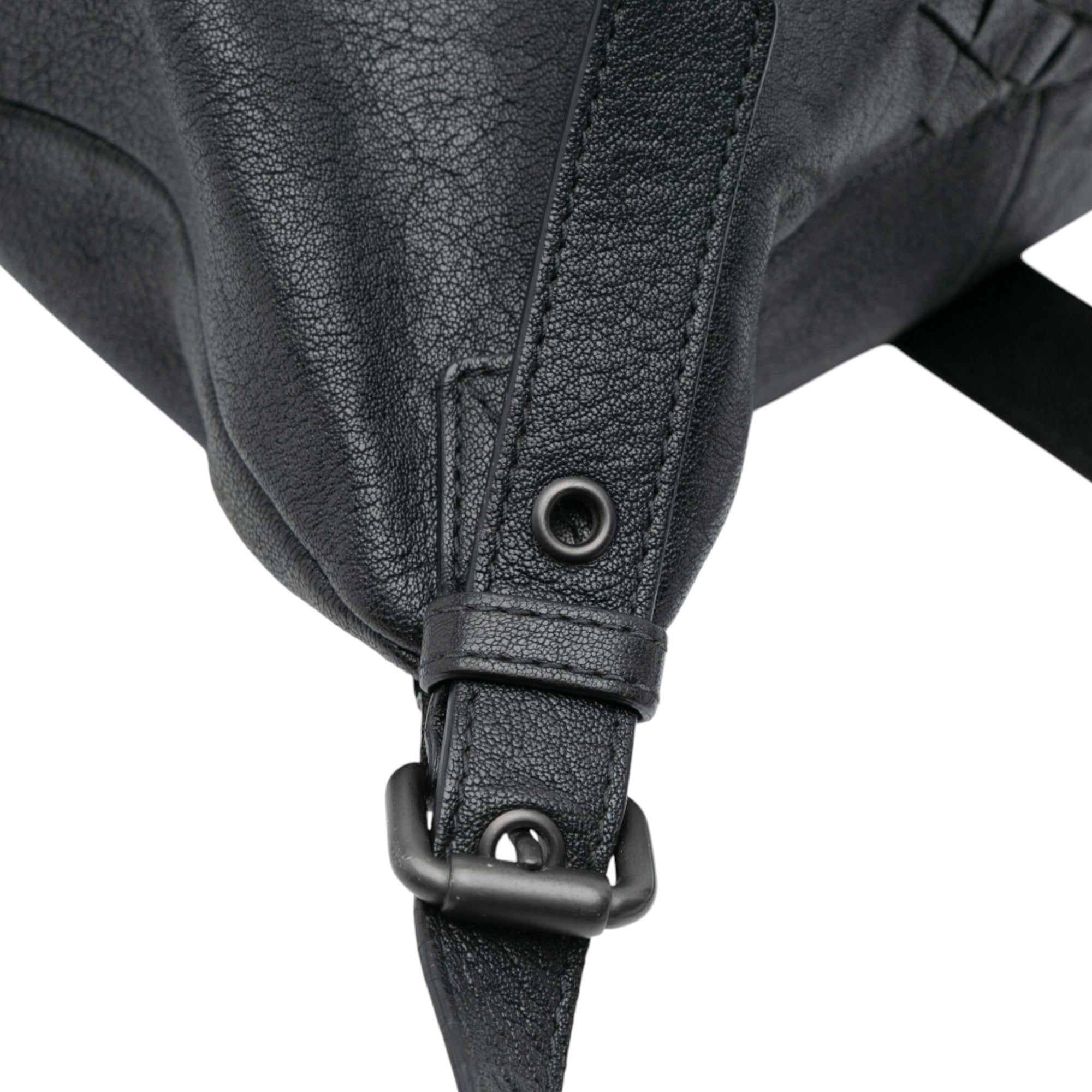 Product Details: Black Bottega Veneta Nappa Intrecciato Drawstring Flap Backpack. This backpack features a nappa leather body, a flat top handle, adjustable flat back straps, a front woven leather flap with buckle and drawstring closure, and an interior slip pocket. 18.1" L x 18.7" W x 0.8" D, 3.1" drop. Serial number B05649174B.