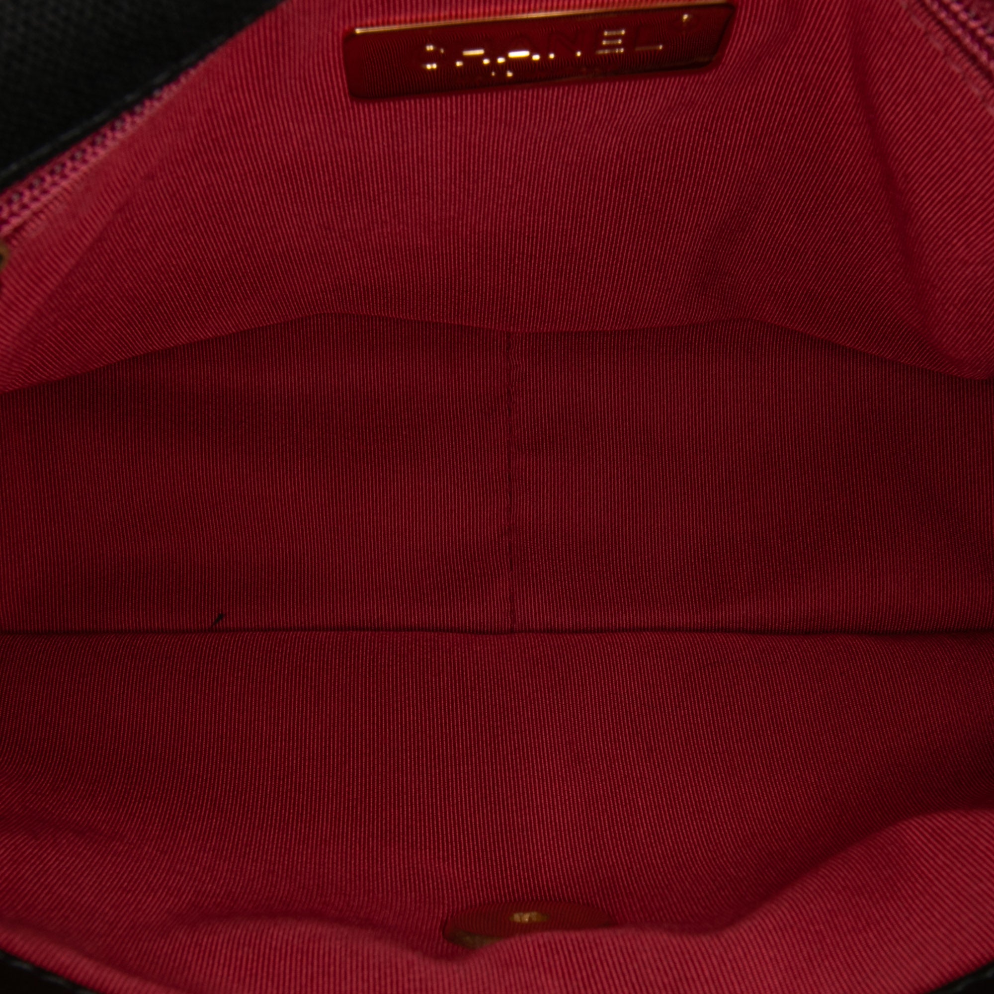 Product Details: Black Chanel Medium Canvas and Cotton 19 Flap Satchel. The Chanel 19 features a canvas and cotton body, a gold-tone chain handle, a leather-woven chain strap, a front flap with a turn lock closure, and an interior zip pocket. 7.1" L x 9.8" W x 3.1" D, 3.1" drop. Serial number 30862282.
