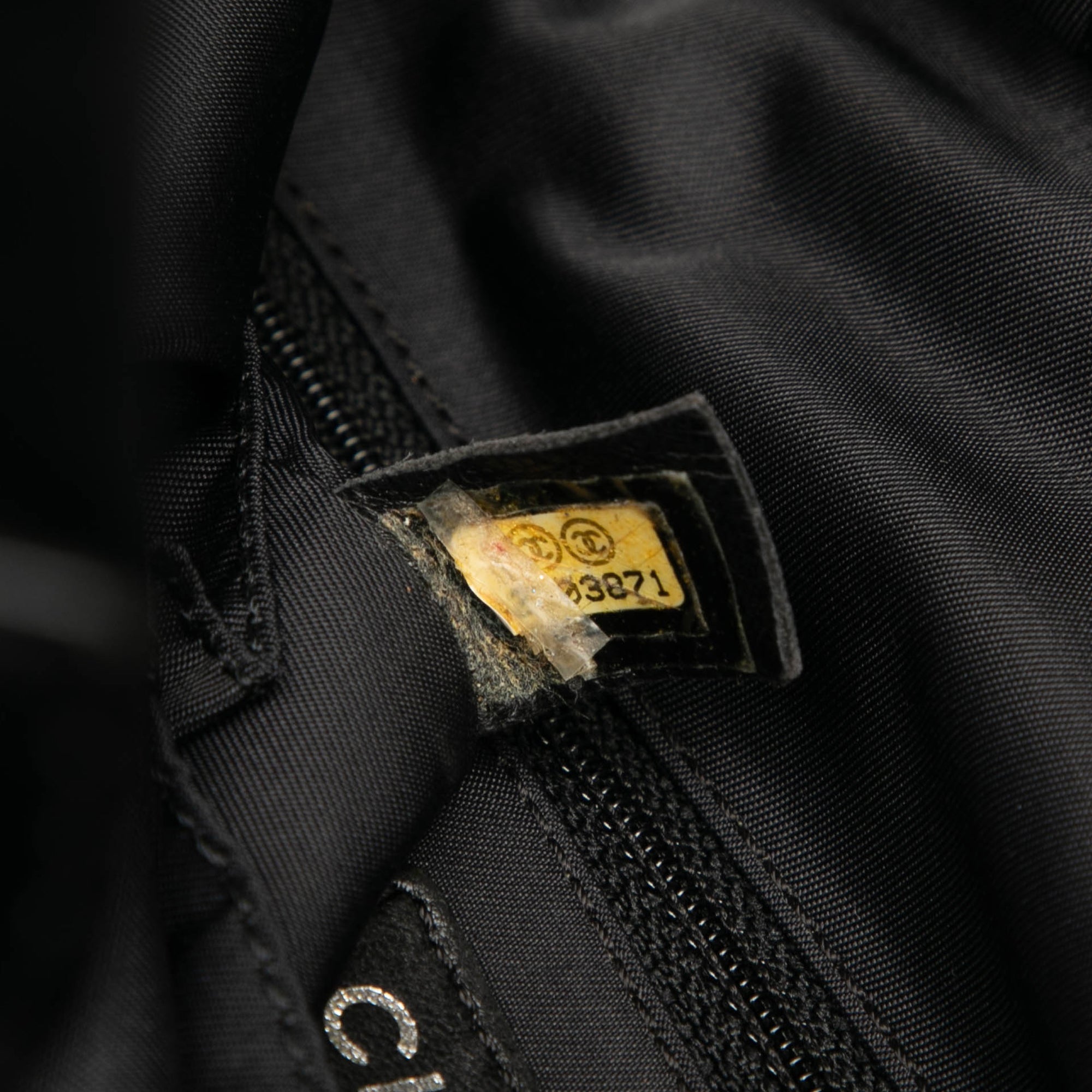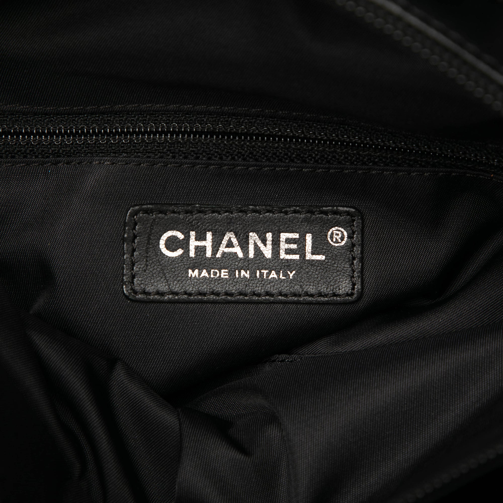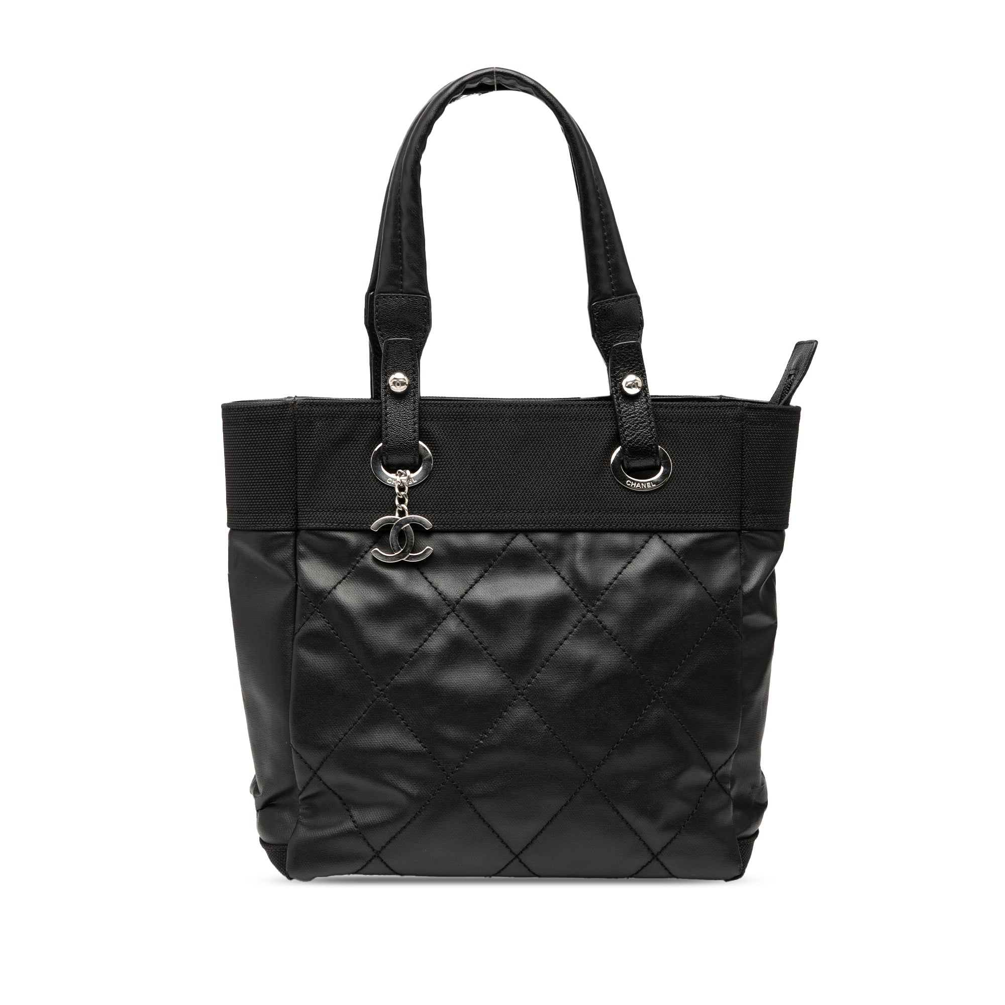 Product Details: Black Chanel Small Quilted Coated Canvas Paris Biarritz Tote. This tote bag features a quilted coated canvas body with nylon trim, flat handles, a top zip closure, and an interior zip pocket. 10.2" L x 9.8" W x 4.3" D, 7.5" drop. Serial number 12103871.