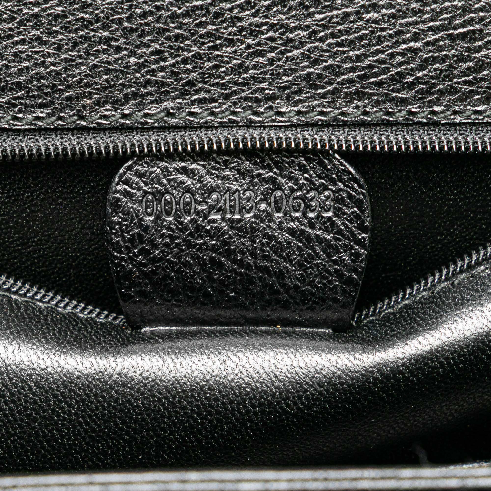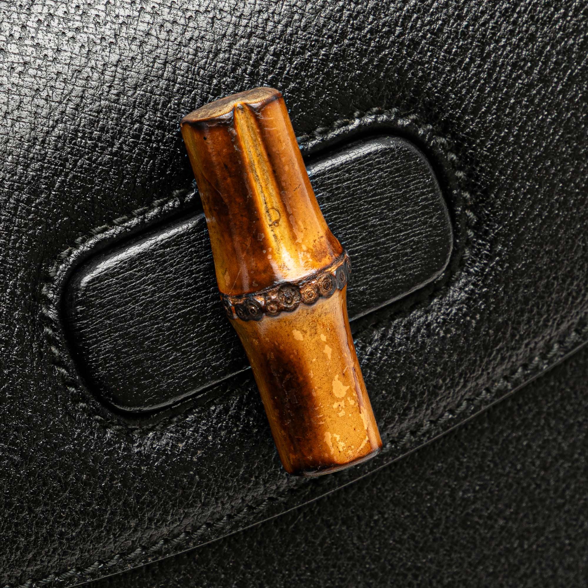 Product Details: Black Gucci Calfskin Bamboo Night Satchel. The Bamboo Night features a leather body, a bamboo top handle, a flap with bamboo turn lock closure, and interior zip and slip pockets. 7.1" L x 10.2" W x 3.1" D, 5.1" drop. Serial number 000 2113 0633.
