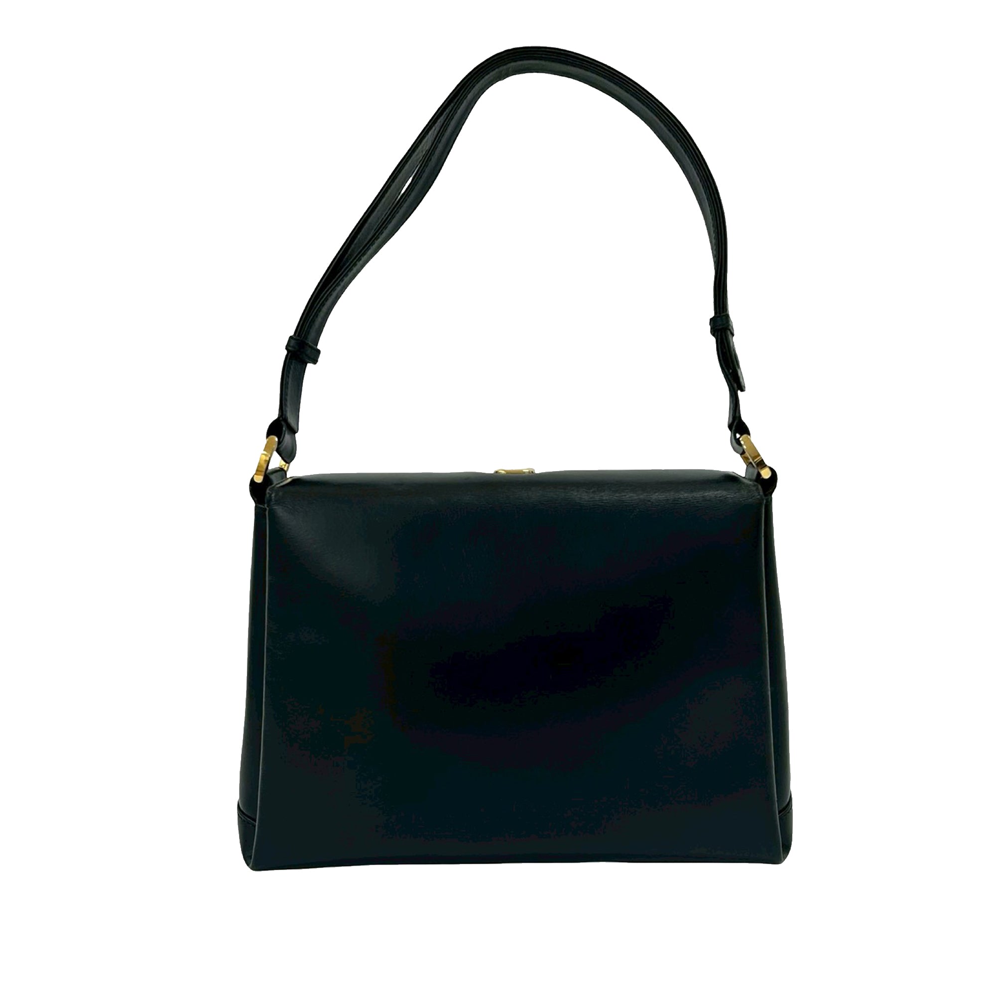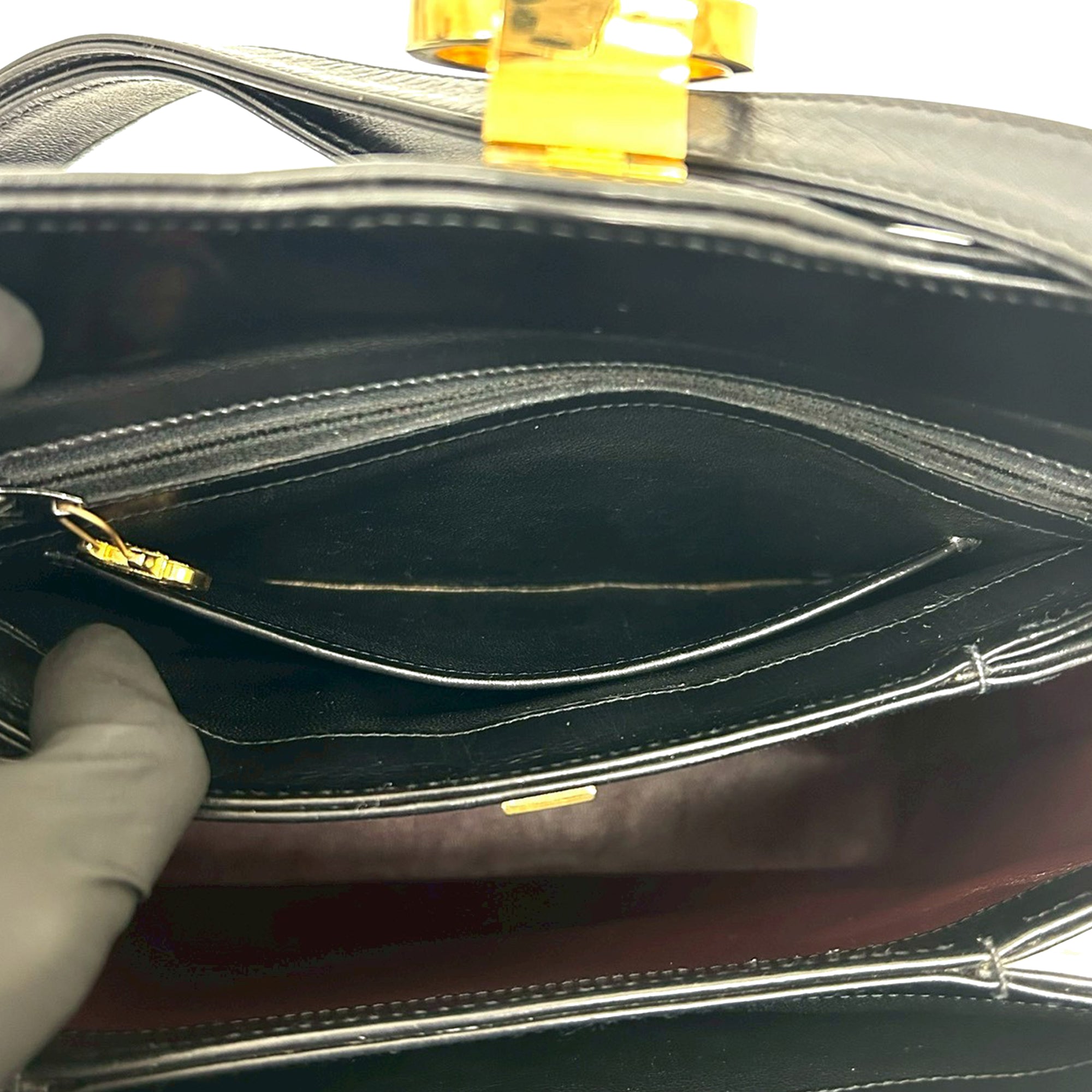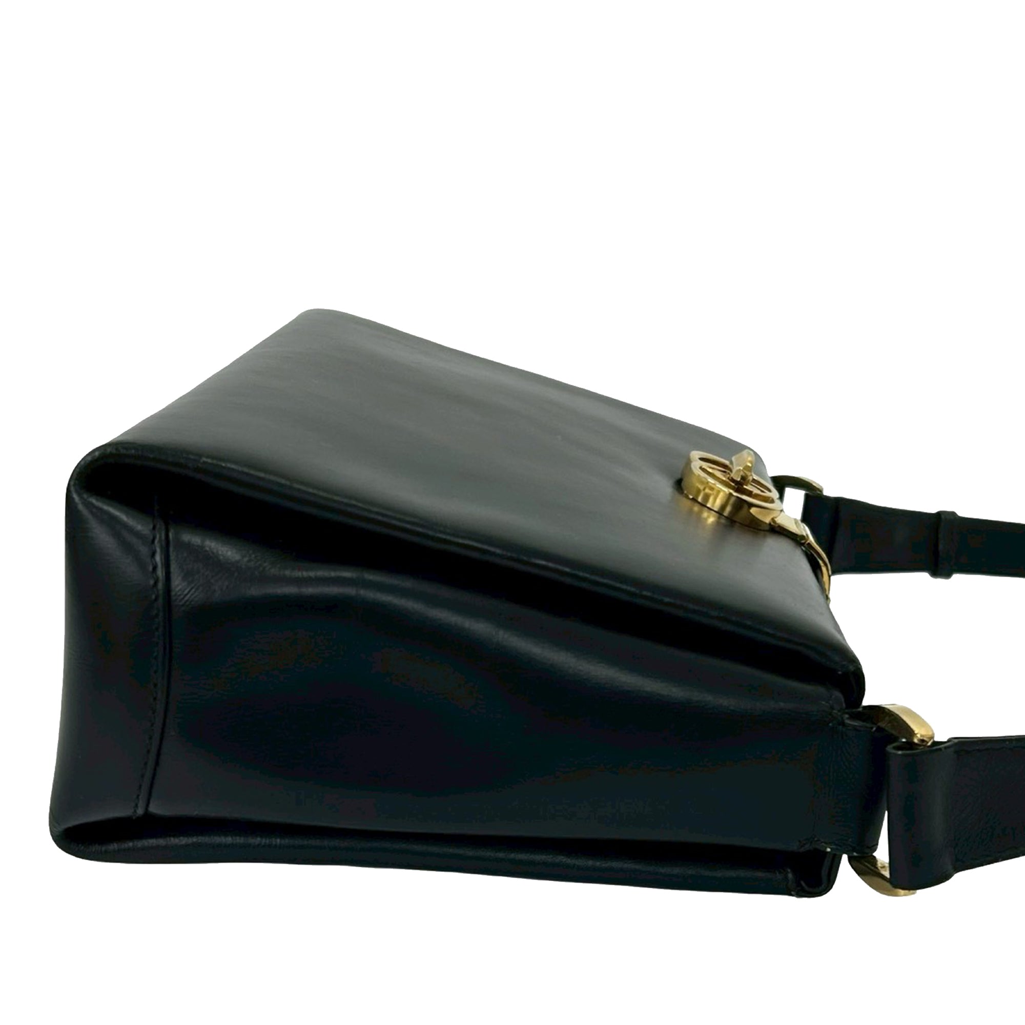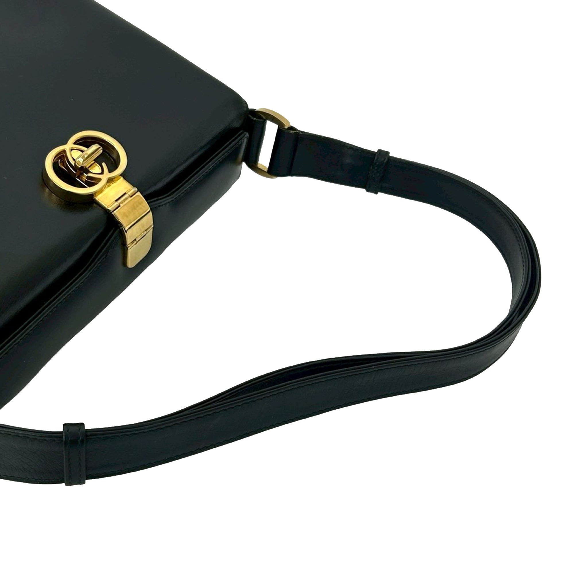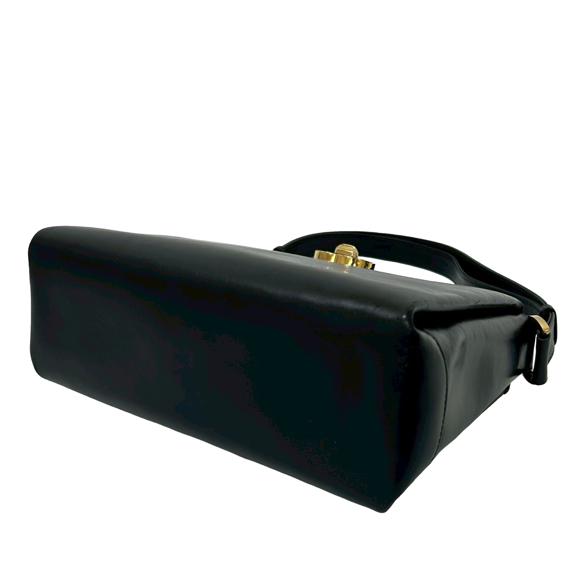Product Details: Black Gucci Leather Shoulder Bag. This shoulder bag features a leather body, flat top handles, a fold-over top with twist lock closure, and an interior zip and slip pockets. 7.3" L x 10.2" W x 3.9" D. Serial number 001 085 3050.