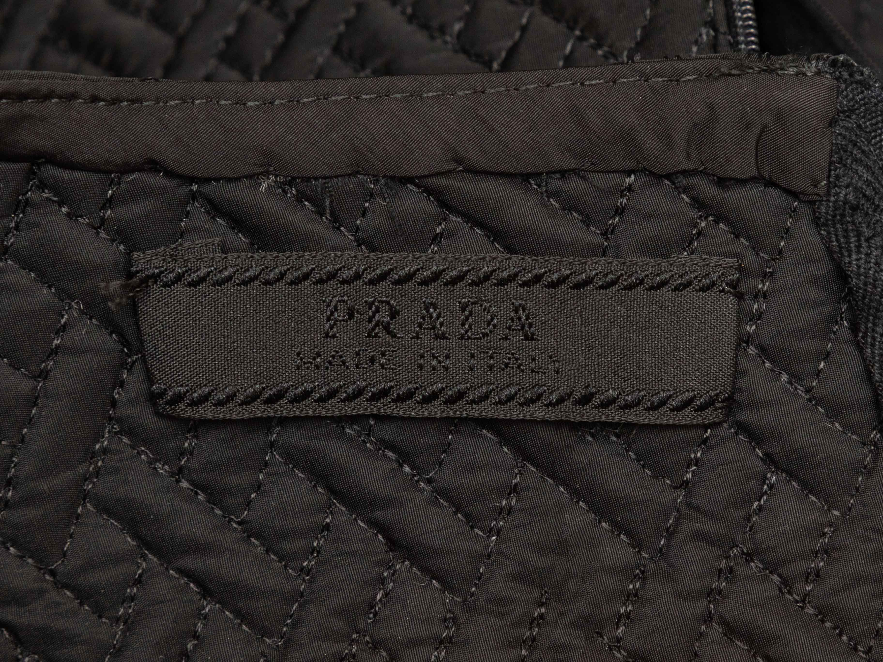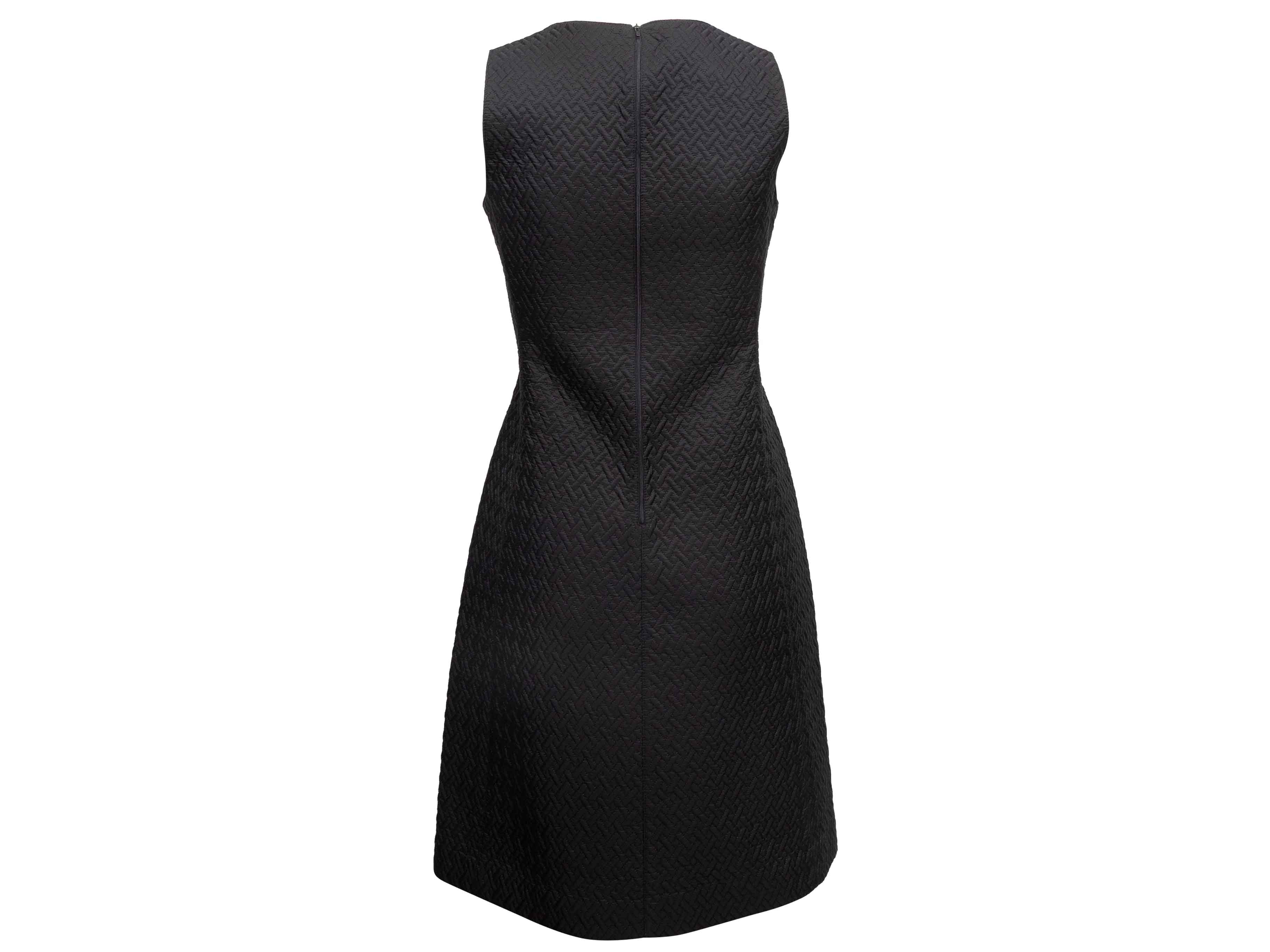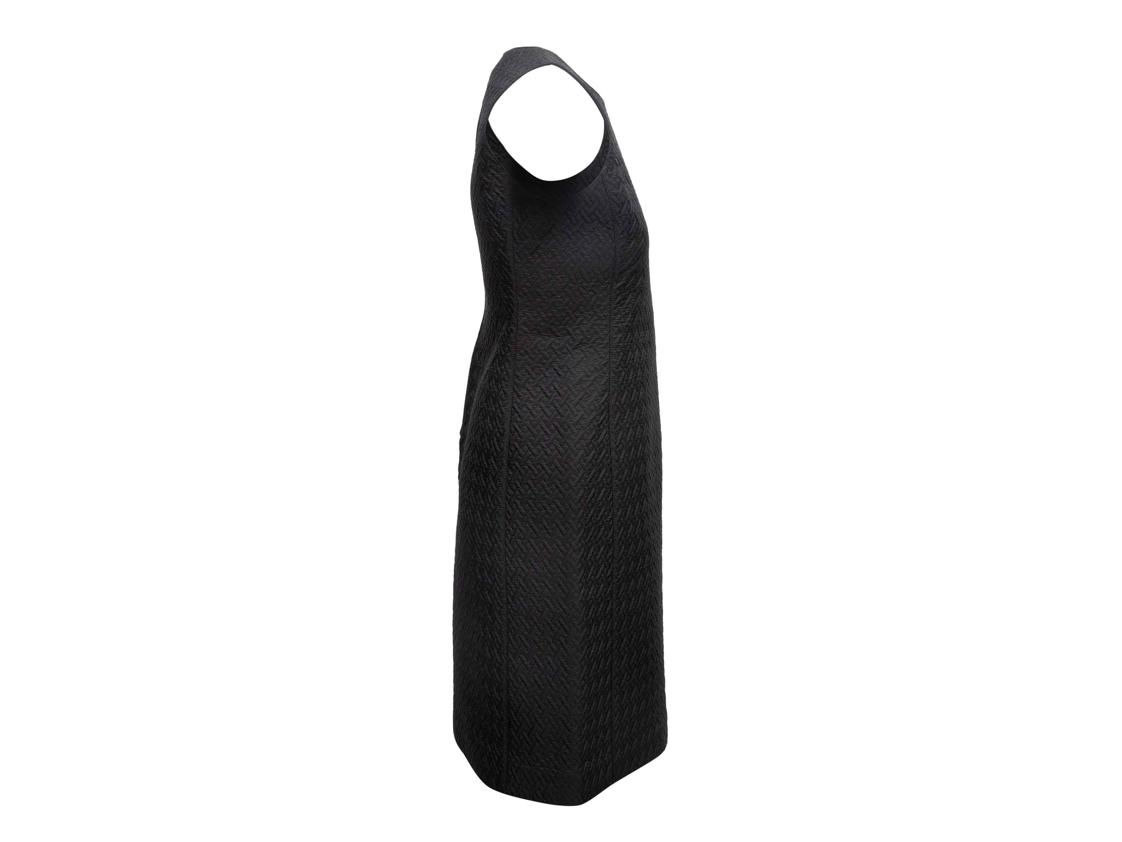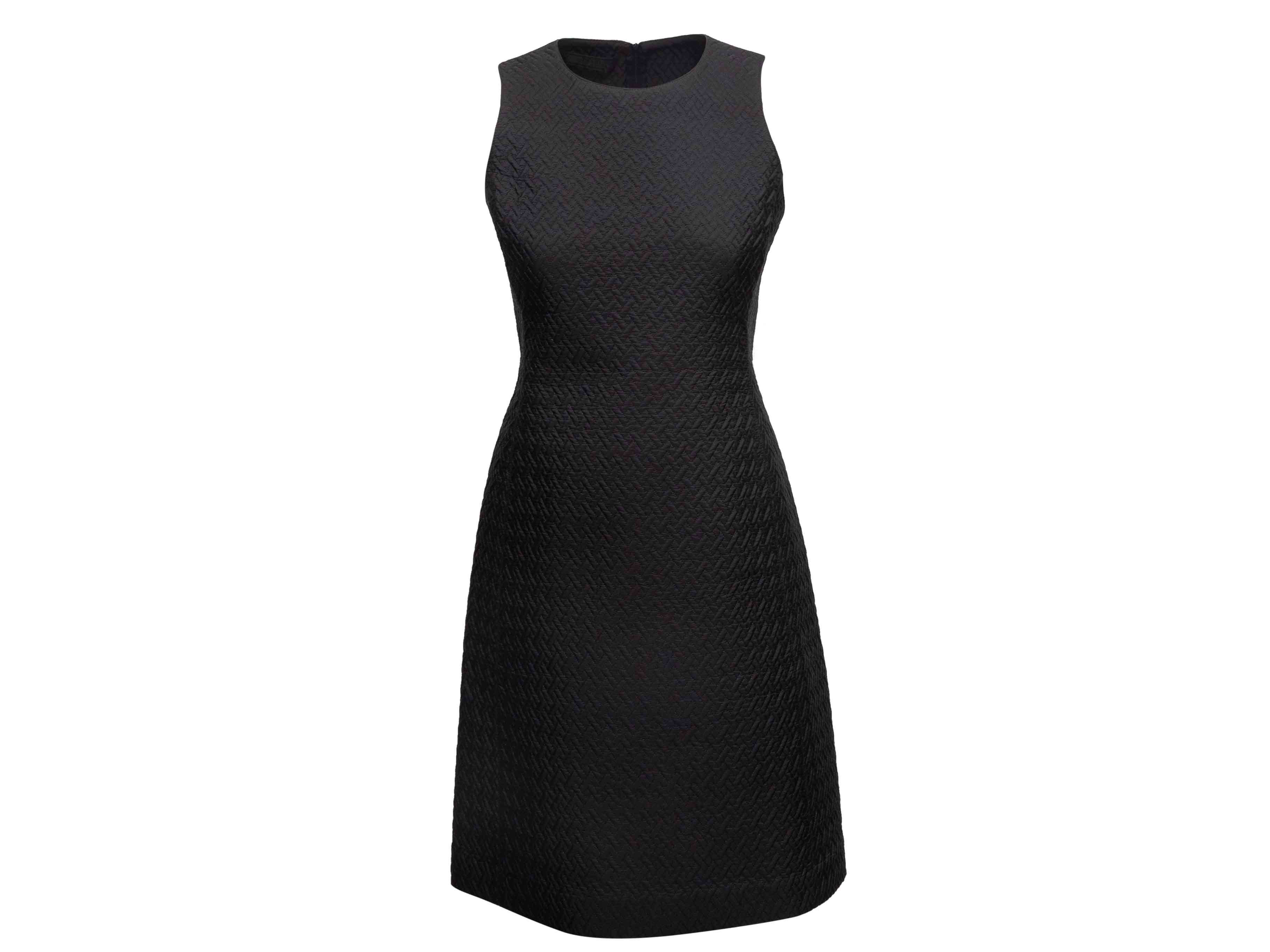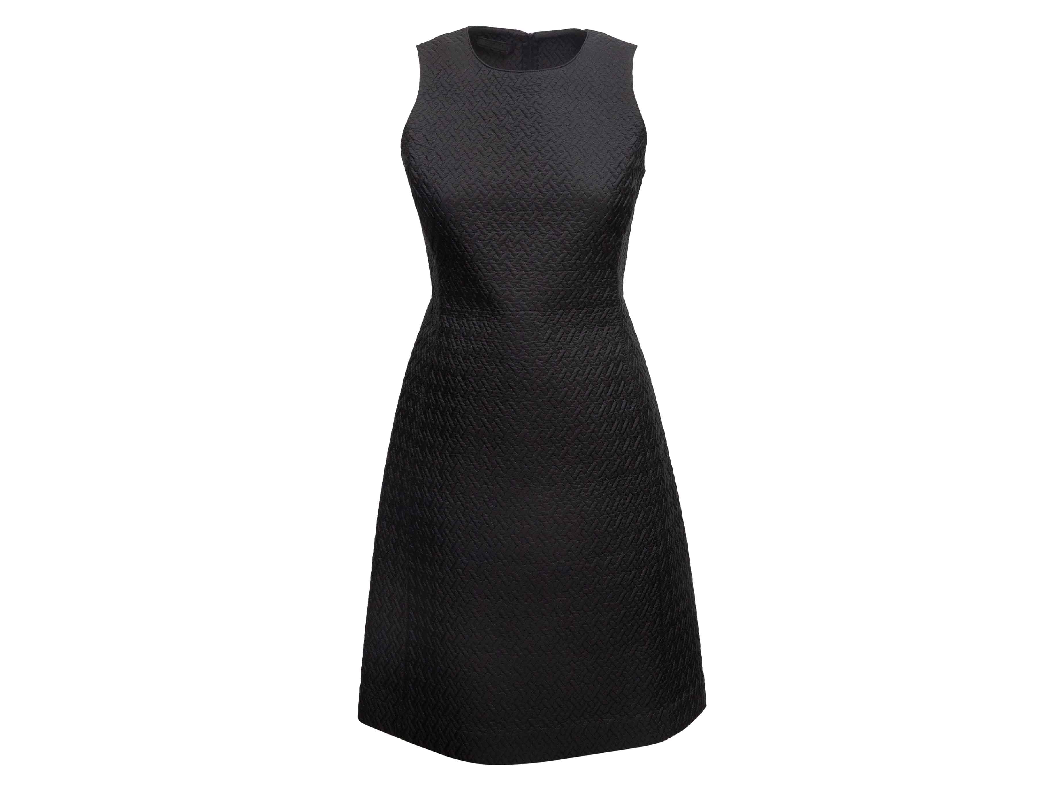 Product Details: Black textured sleeveless A-line knee-length dress by Prada. Crew neck. Zip closure at back. 32" bust, 31" waist, 37" length, 12" shoulder width.
