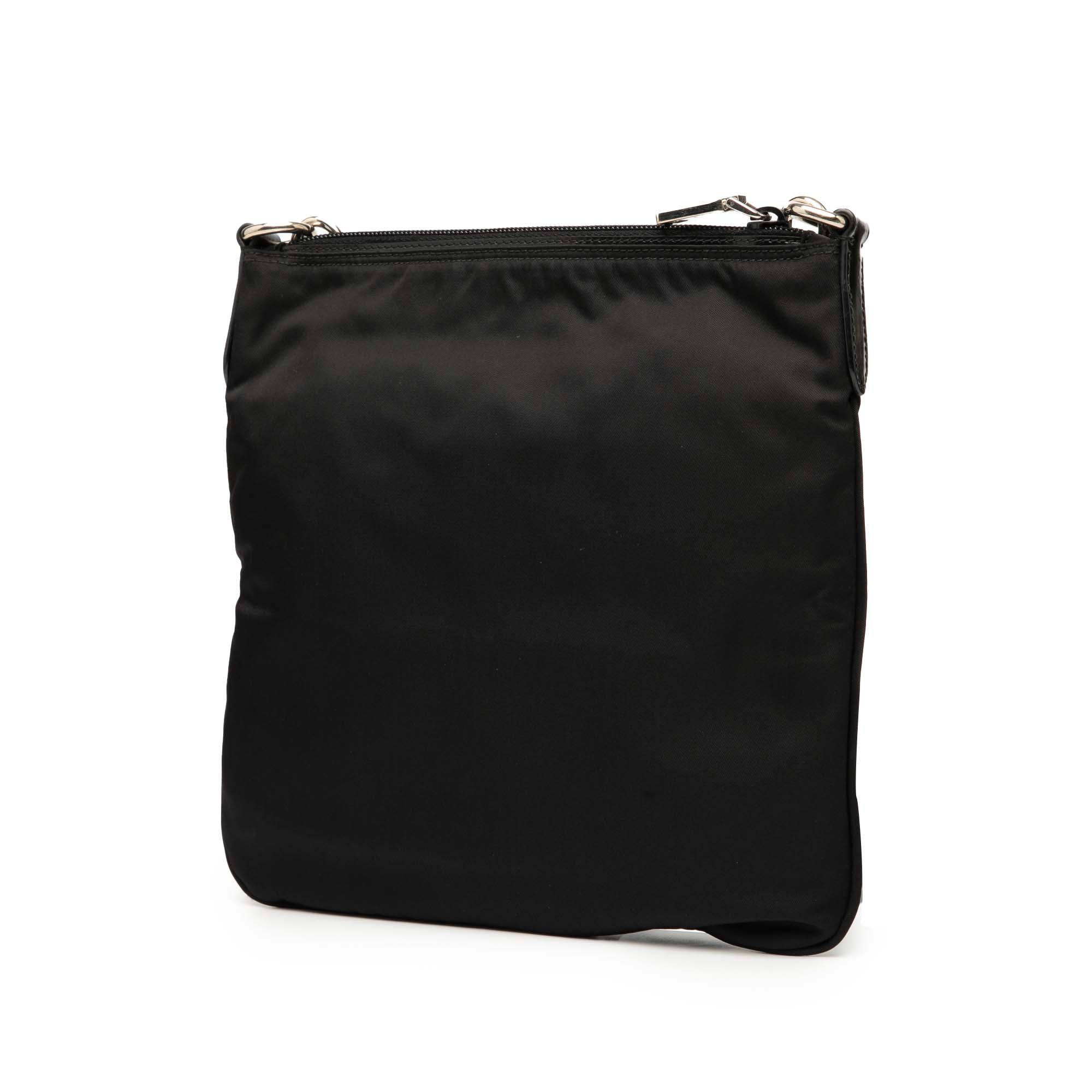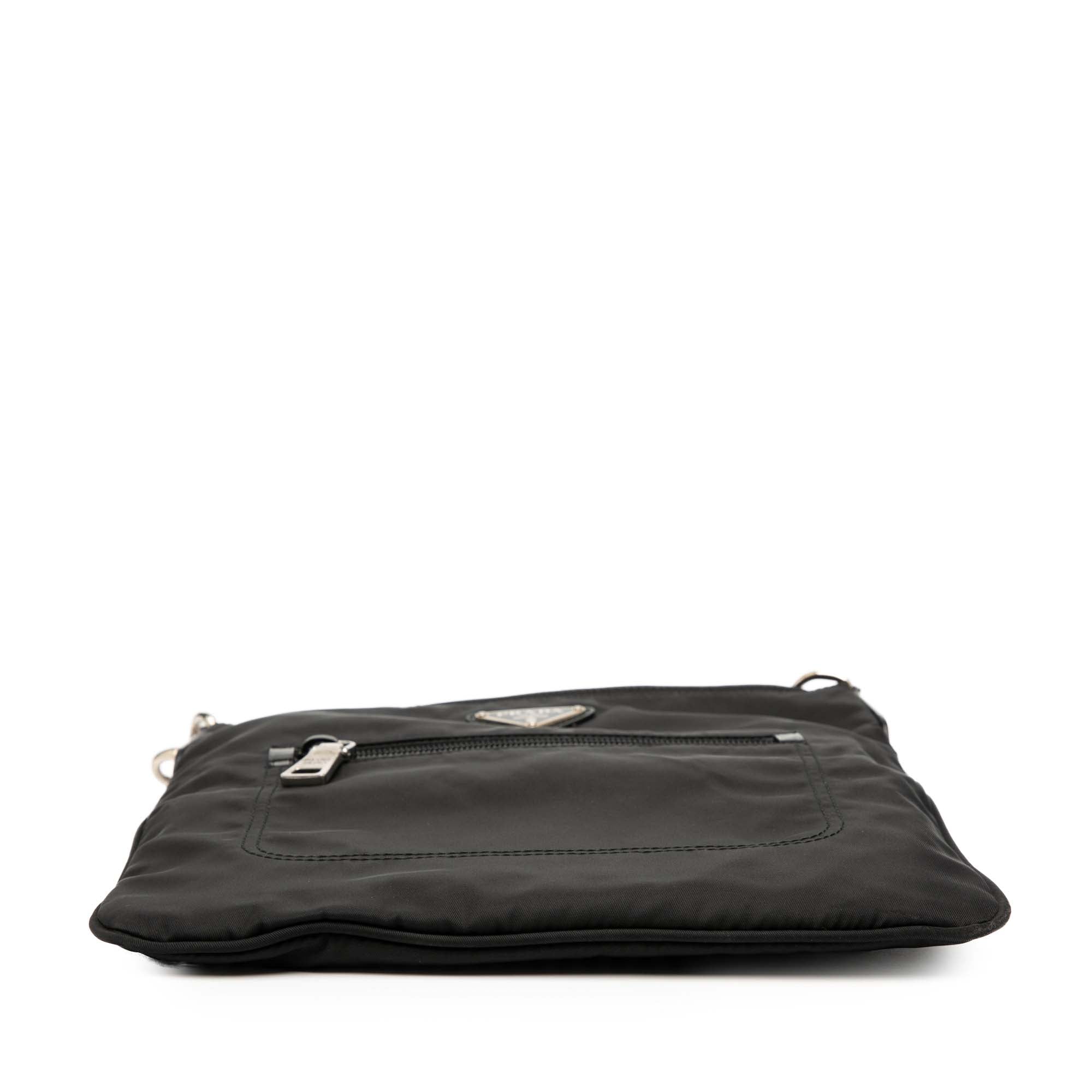 Product Details: Black Prada Tessuto Zip Top Crossbody. This crossbody bag features a nylon body, a flat shoulder strap, a top zip closure, an exterior zip pocket, and an interior zip pocket. 9.8" L x 10" W x 0.4" D.