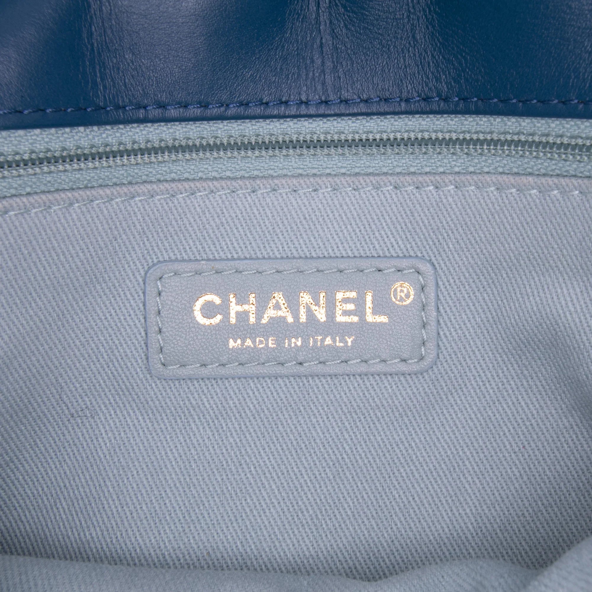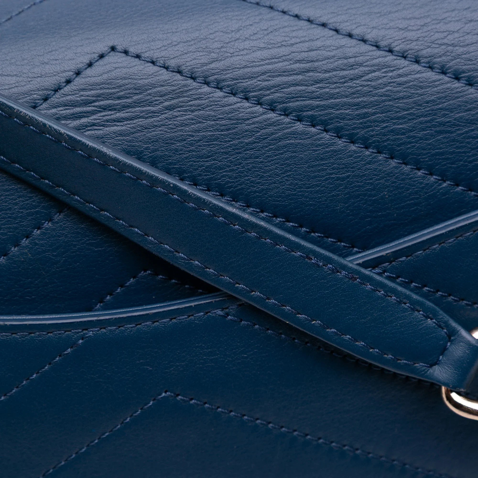 Product Details: Blue Chanel Medium Calfskin Coco Chevron Envelope Flap Satchel. This flap bag features a quilted calf leather body, a chain link handle, a chain and leather shoulder strap, a front flap with twist lock closure, an exterior back slip pocket, an interior zip compartment, and interior zip and slip pockets. The bottom is repainted. 7.5" L x 11.4" W x 3.3" D, 3.5" drop. Serial number 26427236.