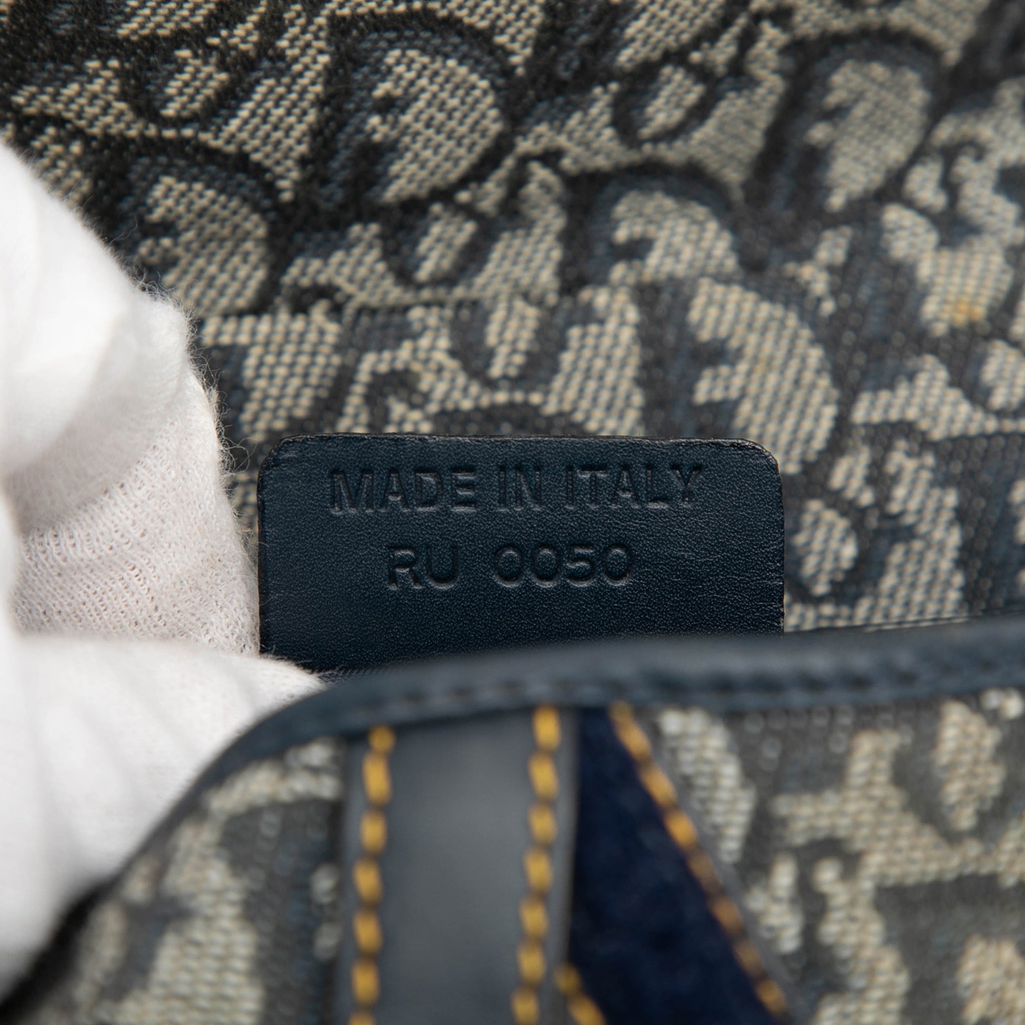 Product Details: Blue Dior Diorissimo Canvas Double Saddle Bag. The Double Saddle features a canvas body, a flat leather strap, a front flap with the CD charm, an exterior back pocket, and an interior zip pocket. 7.1" L x 11.4" W x 1.4" D, 6.9" drop. Serial number RU0050.